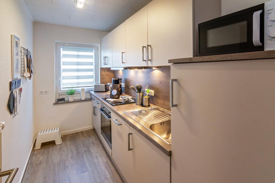 Die moderne, kompakte Küche bietet alles, was man für eine flexible Selbstverpflegung benötigt. Sie ist vollständig ausgestattet mit Backofen, Herd, Kaffeemaschine, Toaster und ausreichend Stauraum und überzeugt durch klare Linien und eine angenehme Beleuchtung. Das große Fenster bringt freundliches Tageslicht in den Raum und macht die Küche zu einem funktionalen und dennoch behaglichen Bereich, der den Urlaub besonders komfortabel gestaltet.