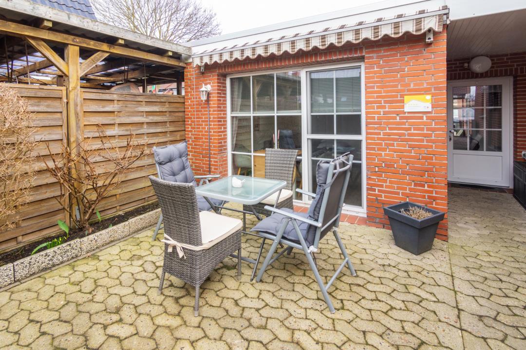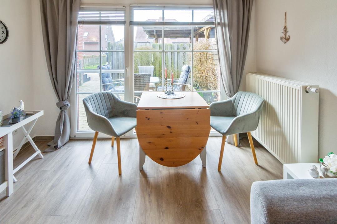 Von der Sofaecke aus eröffnet sich der Blick auf die geschützte Terrasse, die direkt über die große, lichtdurchflutete Glasfront betreten werden kann. Hier lässt sich der Tag entspannt im Freien beginnen oder ausklingen, ganz gleich ob beim Frühstück in der Morgensonne oder bei einem gemütlichen Abend an der frischen Nordseeluft. Die Terrasse ist mit bequemen Sitzmöbeln ausgestattet und bietet ausreichend Privatsphäre, um ungestört zu entspannen. Wer eine Ferienwohnung mit Terrasse in Norddeich sucht, findet hier den idealen Ort.
