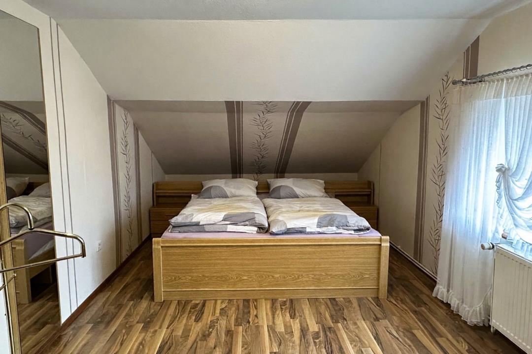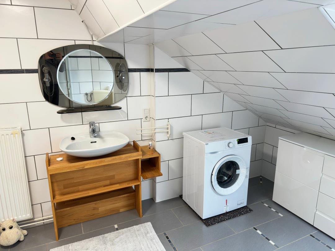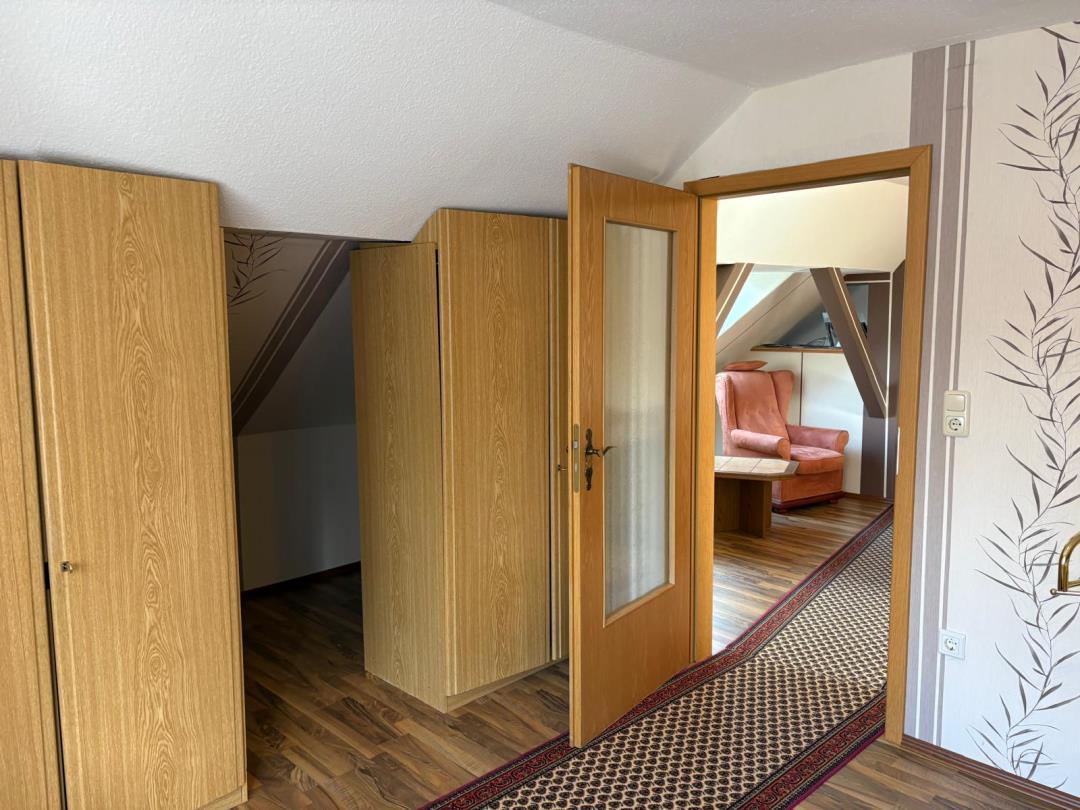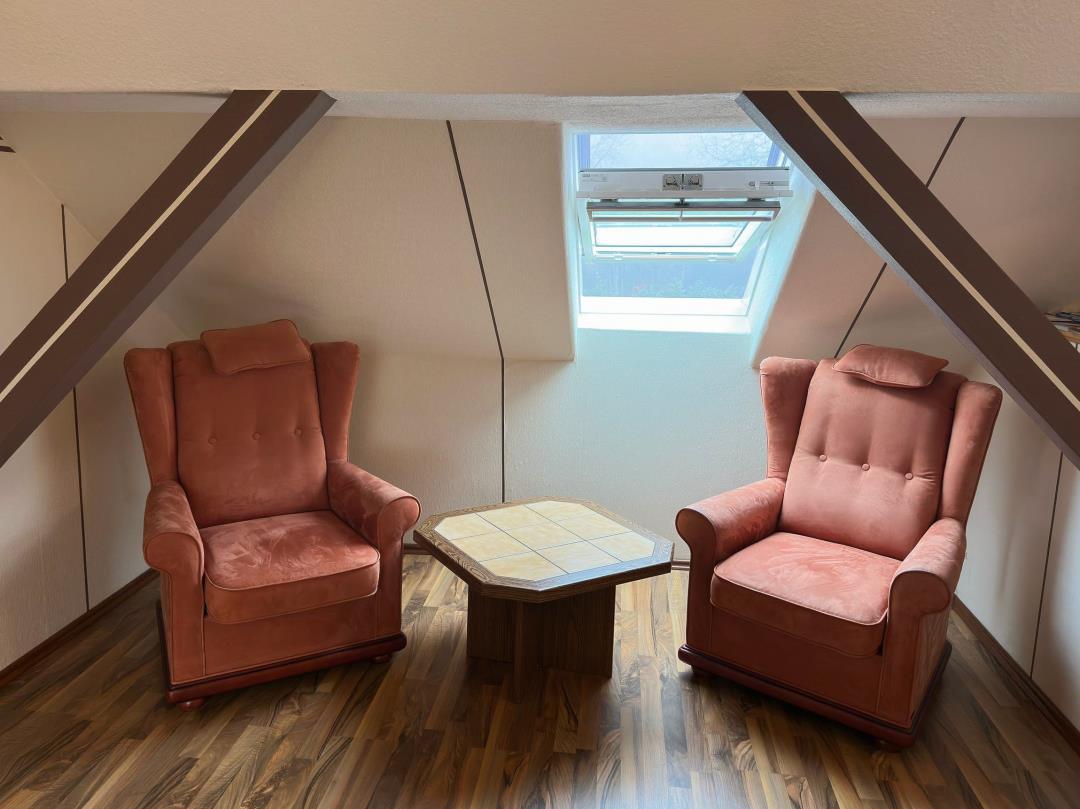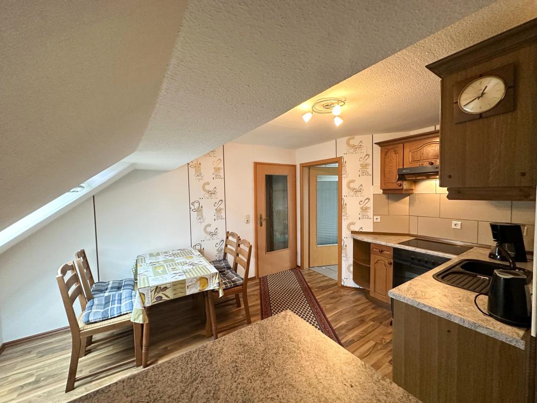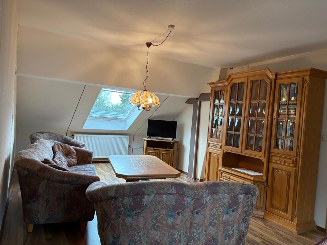 Wir bieten hier unsere schöne und schnuckelige Ferienwohnung (ca. 55m² Wohnfläche, Nutzfläche mehr) im DG unseres Hauses mit separaten Hauseingang und Stellplatz vor dem Grundstück an. Die Wohnung ist ausgestattet mit Bad (mit Waschmaschine), Küche, Essecke, Wohnzimmer (natürlich mit Fernseher) und mit schöner Rückzugmöglichkeit zum Lesen unter der Schräge und großes Schlafzimmer mit Doppelbett (2x2m). Ausgelegt ist die Wohnung bis zu 2 Personen. Unser Heim ist eine haustierfreie Zone, so leid es uns tut, weil unser Haus von viel Natur und somit von sehr vielen Wildtieren (Rehen, Fasanen, Enten........) umgeben sind. Inbegriffen im Mietreis sind Bettwäsche, Handtücher, sowie freies Gast WLAN.