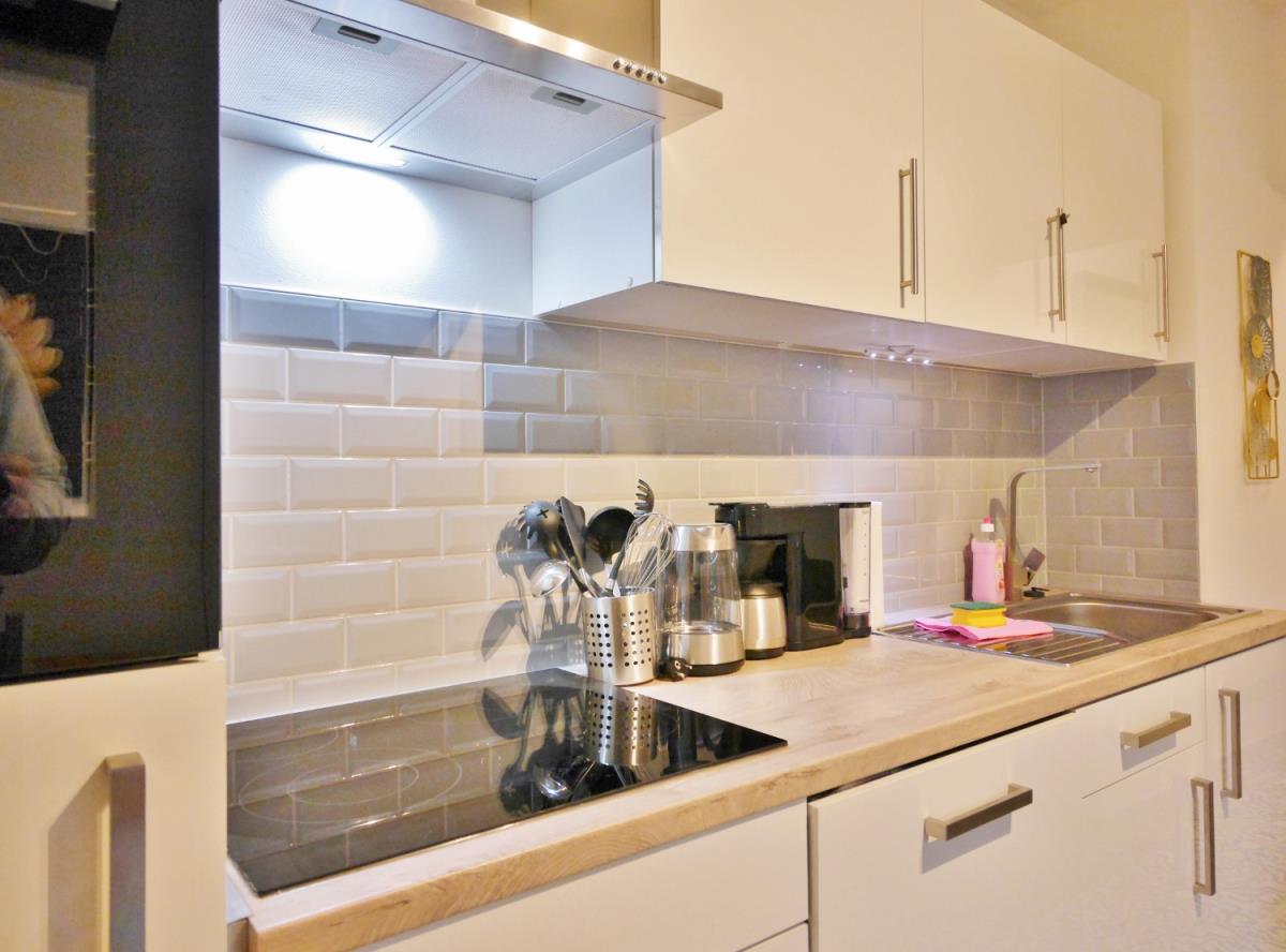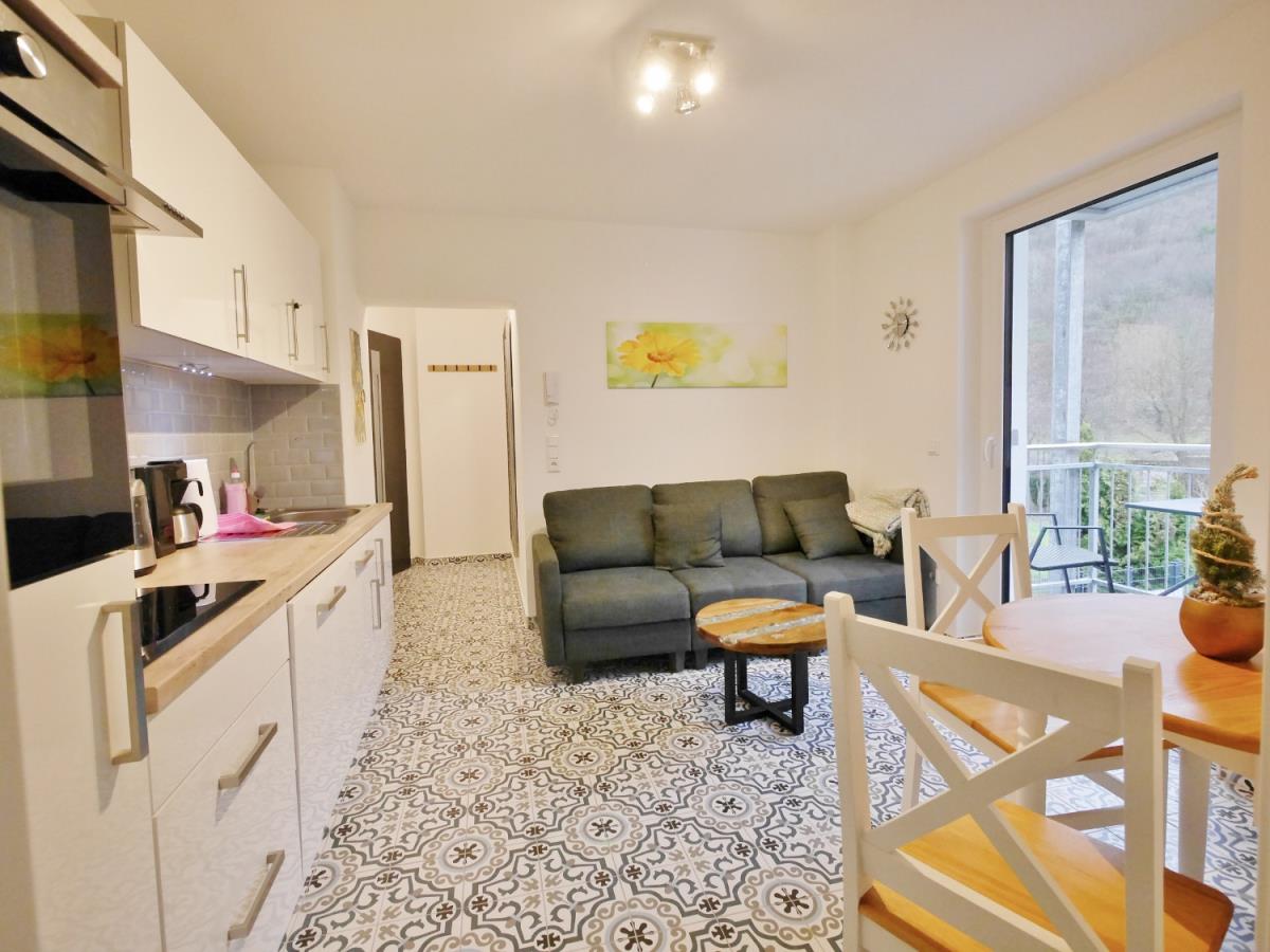 - Wohnküche mit Couch, TV, Esstisch und Küchenzeile mit Geschirrspüler und zweckmäßiger Ausstattung