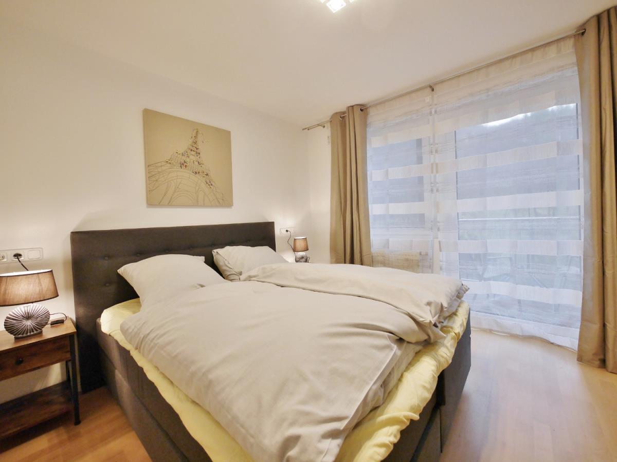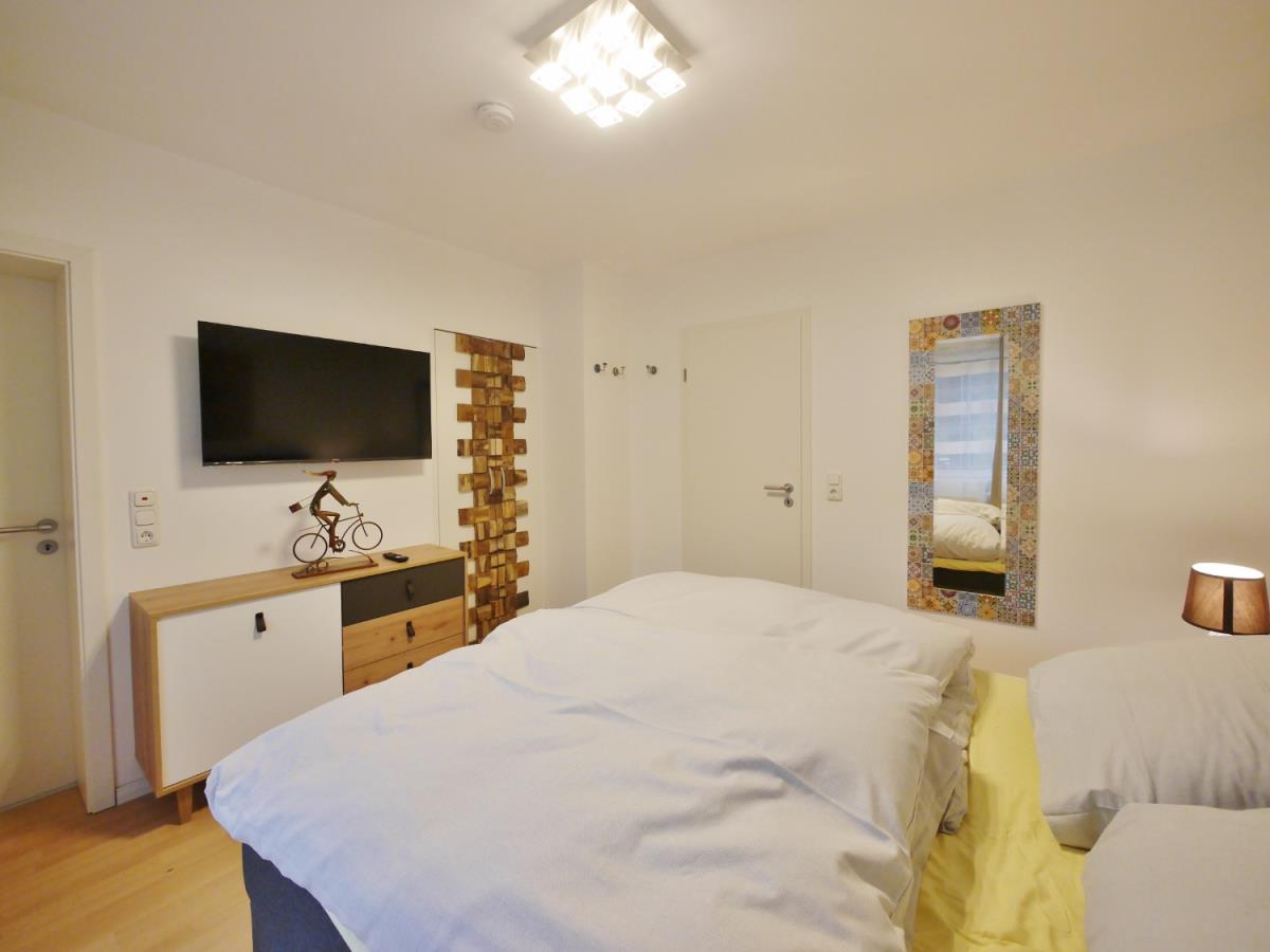 - ein Schlafzimmer mit Doppelbett, TV und Kleiderschrank. - Modernes Duschbad mit Fenster und Fön.