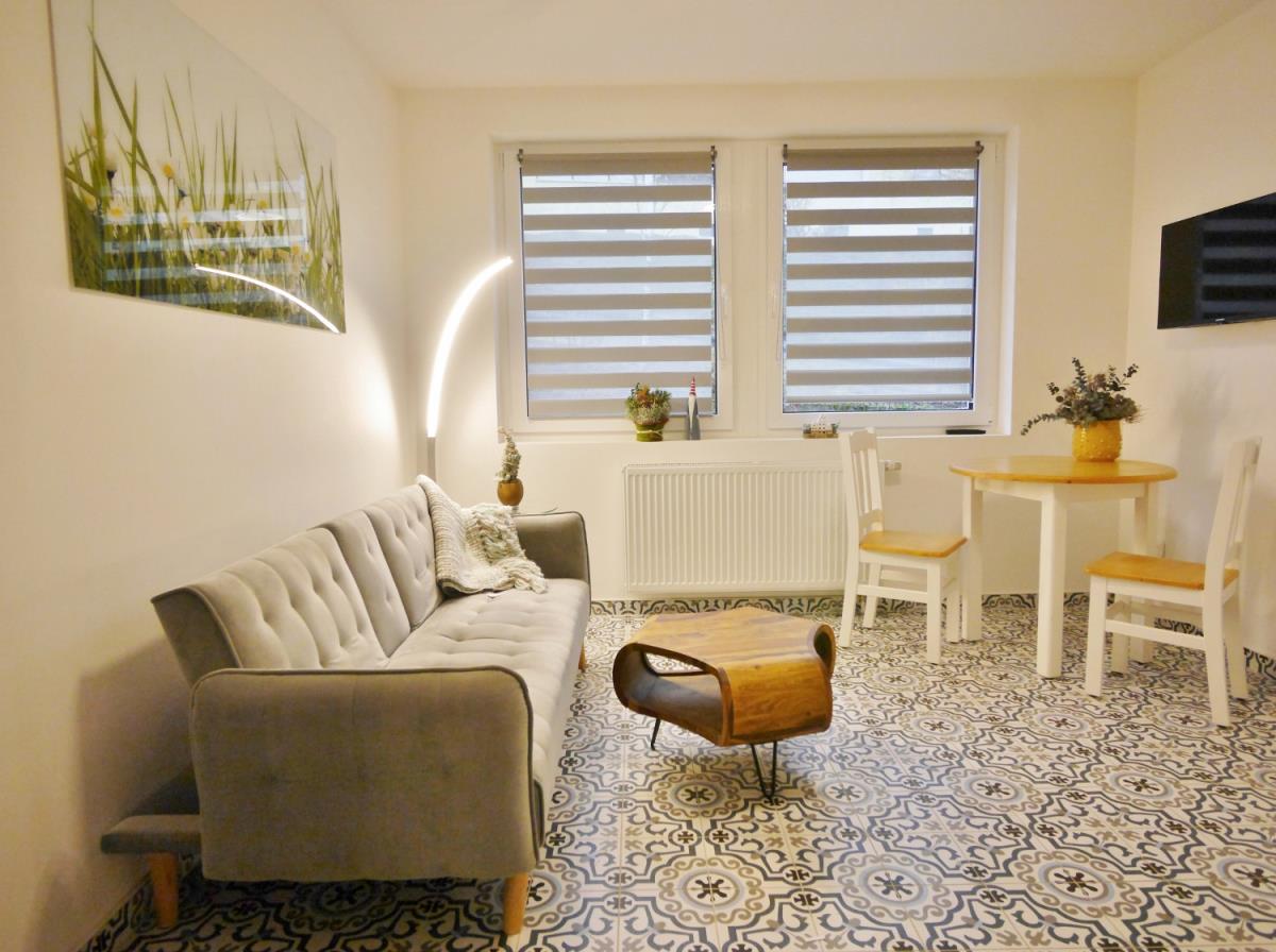 Appt. PRINZESSIN ist eine kompakte 2-Raum-Fewo (36 qm) barrierefrei im Erdgeschoss für 2 Personen - ein mittelgroßer Hund ist willkommen!