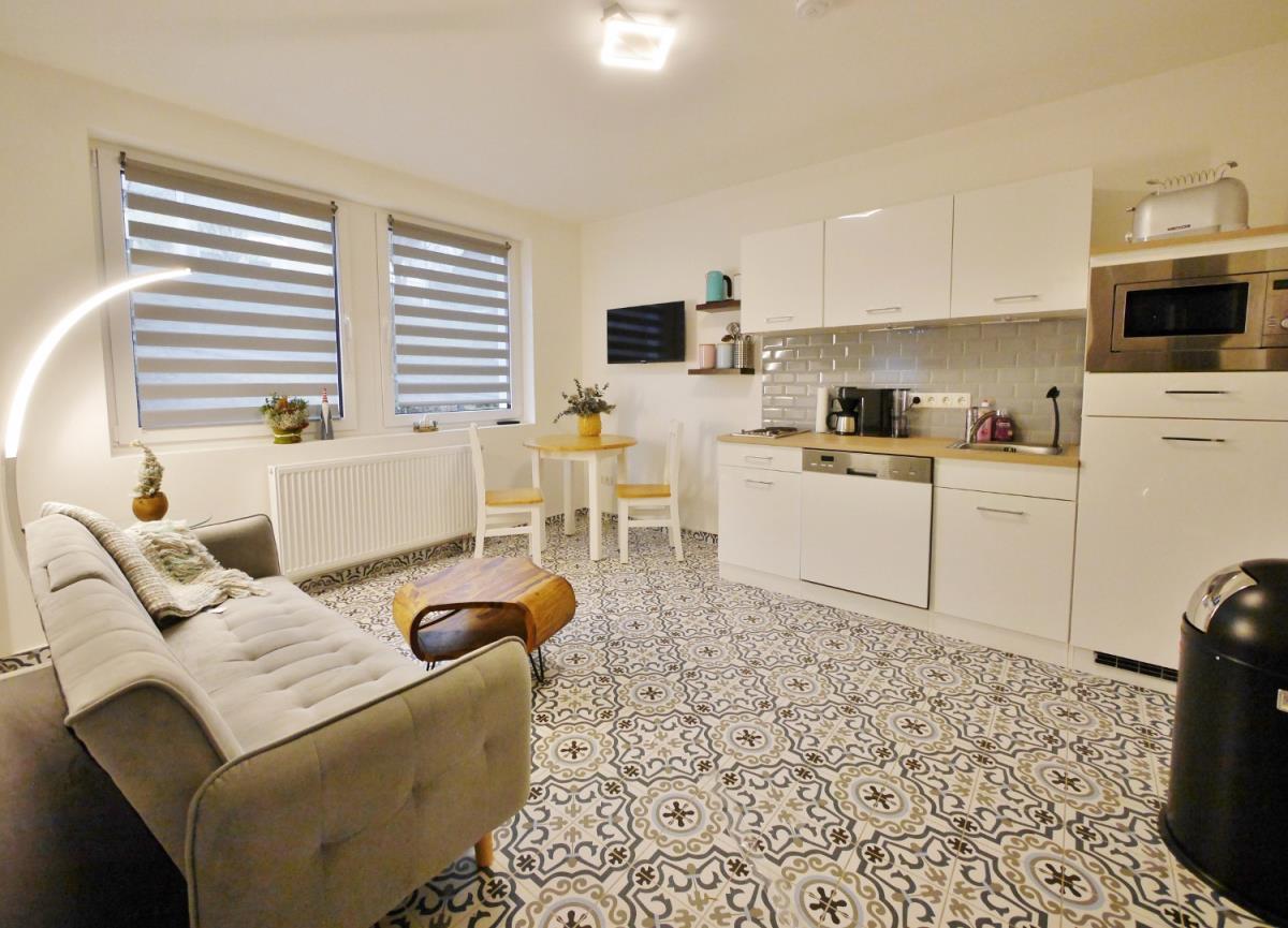 - Wohnküche mit Couch, TV, Esstisch und Küchenzeile mit Geschirrspüler und zweckmäßiger Ausstattung