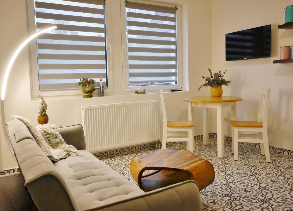 Nach diesem Motto haben die EigentümerInnen Kaiser-Brehme ein Siedlungshaus aus den 50er Jahren kernsaniert, die schöne alte Holztreppe bewahrt und drumherum mit viel Herzblut sechs moderne Appartements mit Chic geschaffen. In den barrierefreien Erdgeschosswohnungen sind Hunde auf Anfrage willkommen.