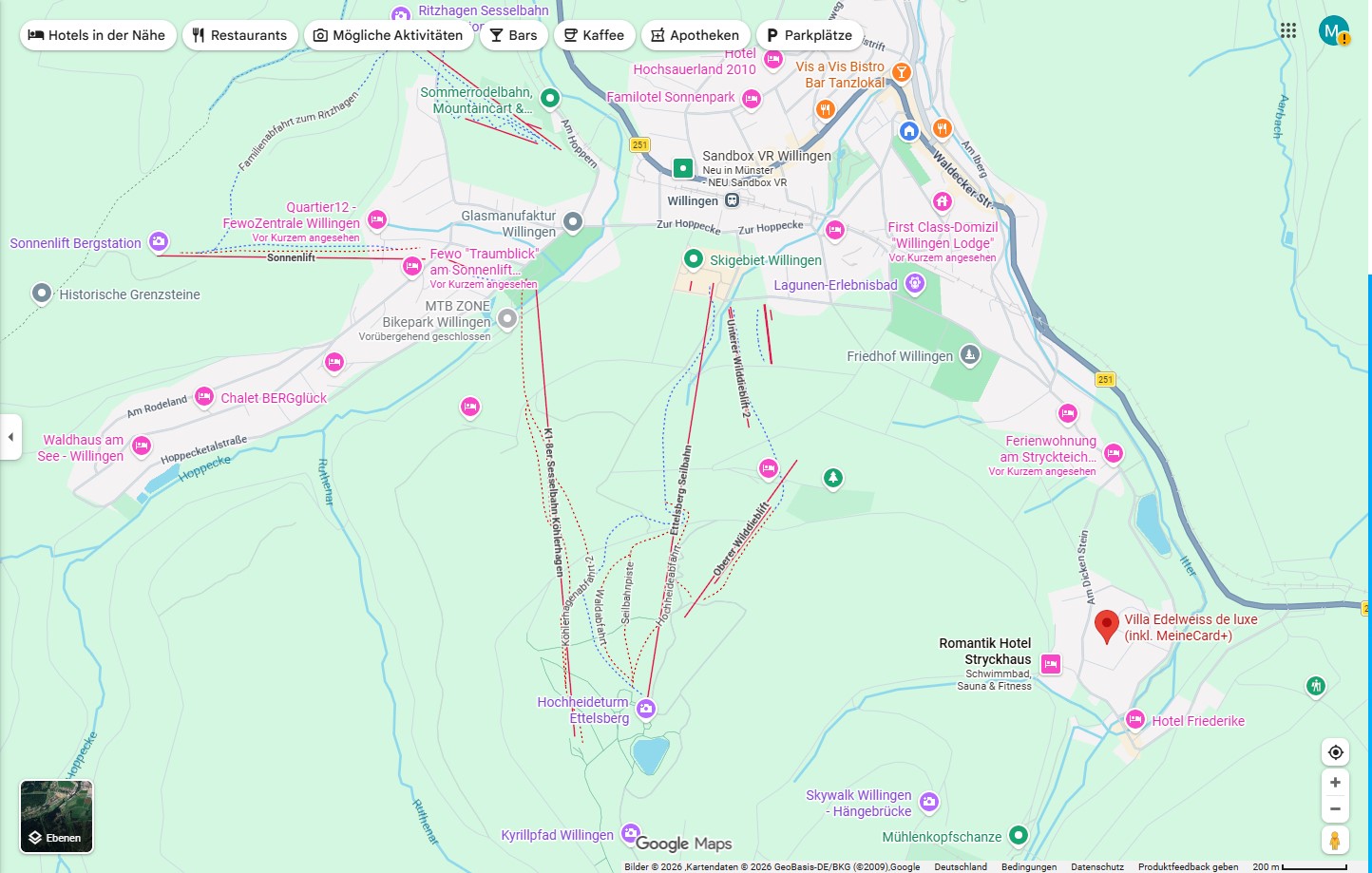 Erleben Sie Ruhe und Erholung inmitten der Natur und erreichen Sie das Zentrum von Willingen durch einen Spaziergang durch den Stryckpark. Ob Skifahren im Winter oder Wandern im Sommer, die Umgebung von Willingen bietet zu jeder Jahreszeit vielfältige Sport- und Freizeitmöglichkeiten für jeden Geschmack. Entdecken Sie den Skywalk - Deutschlands längste Hängebrücke - oder die vielfältigen Wander- und Mountainbike-Strecken direkt vor Ihrer Haustür und nutzen Sie die MeineCardPlus für kostenlosen Eintritt zu über 100 Freizeitattraktionen in Willingen, am Edersee und in Nordhessen sowie kostenlose öffentliche Verkehrsmittel.