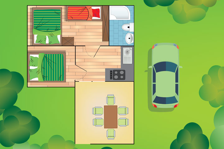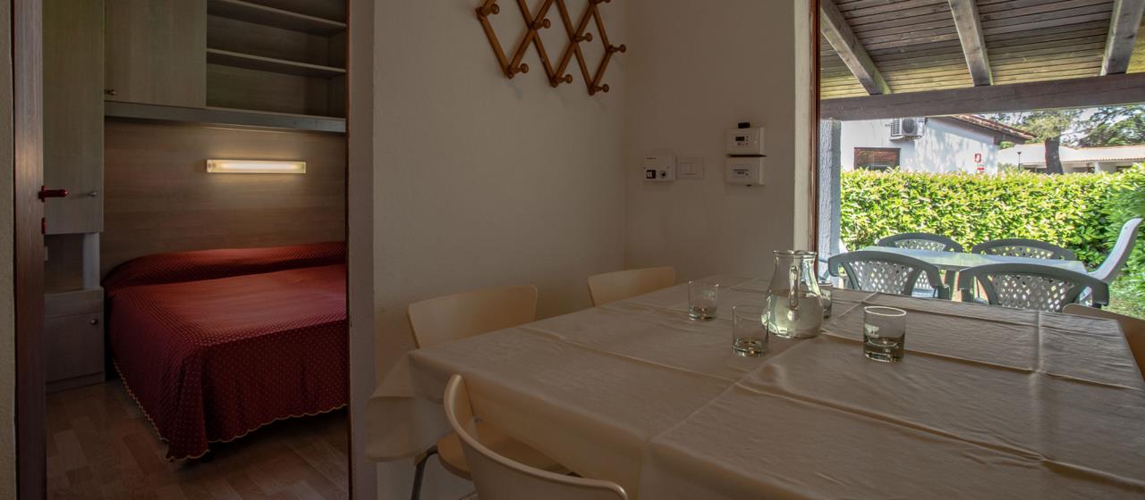 Der 26qm grosse Bungalow Tipo B bietet Platz für max. 5 Personen und besteht aus zwei Schlafzimmern. Eines ist mit einem Doppel- und einem Einzelbett ausgestattet, das zweite mit einem weiteren Doppelbett. Im offenen Wohn- und Essbereich befindet sich neben Tisch und Stühlen die Küche, die mit Gasherd, Geschirr, Besteck, Töpfen und einem Kühlschrank ausgestattet ist. Das Badezimmer verfügt über Dusche, Waschbecken und WC. Die Terrasse ist möbliert, teilweise überdacht, verfügt über einen Steinkamin/-grill und bietet einen entspannenden Ausblick in den Garten. Fahrzeit ab italienischer Grenze ca. 2h. Hinweis: Wenn Sie mehr als eine Unterkunft benötigen, ist dies bei uns in der Regel möglich, da wir über mehrere Objekte des gleichen Haustyps verfügen.