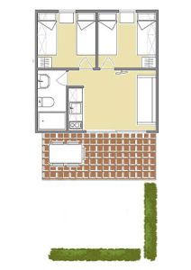 Der Holzbungalow Comfort Garden bietet Platz für max. 5 Personen (inkl. Babys). Die Unterkunft besteht aus zwei Schlafzimmern mit jeweils zwei Einzelbetten, die auch zu Doppelbetten zusammengeschoben werden können. Im Wohnbereich bietet ein Bettsofa einen weiteren Schlafplatz. Ebenfalls im Wohnbereich befindet sich die kleine, gut eingerichtete Küche mit Geschirr, Besteck, Töpfen, einem elektrischen Herd mit zwei Kochplatten, einer Mikrowelle, einer Kaffeemaschine sowie einem kleinen Kühlschrank mit Eisfach. Das Badezimmer ist mit einer Dusche, einem Waschbecken und einem WC ausgestattet. Der Aussenbereich besteht aus einer überdachten und möblierten Terrasse, sowie einem privaten Gartenabschnitt. Fahrzeit ab der spanischen Grenze ca. 1h. Hinweis: Wenn Sie mehr als eine Unterkunft benötigen, ist dies bei uns in der Regel möglich, da wir über mehrere Objekte des gleichen Haustyps verfügen.