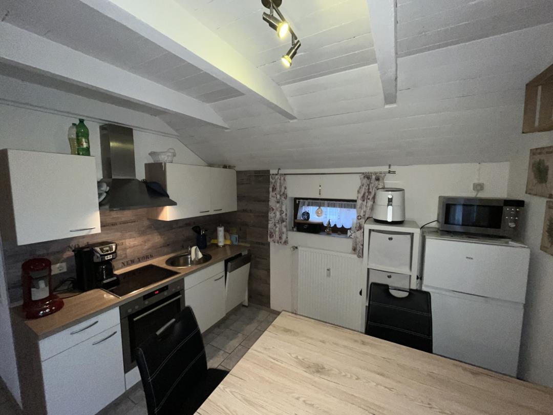 Der Wohn- und Essbereich ist offen gestaltet und schafft mit sichtbaren Deckenbalken und heller Holzverkleidung eine freundliche Atmosphäre. Eine komfortable Sofaecke mit TV lädt zu entspannten Abenden ein. Die integrierte Küche ist modern ausgestattet und verfügt über Cerankochfeld, Backofen, Dunstabzug, Kaffeemaschine, Wasserkocher, Mikrowelle sowie Kühl-Gefrierkombination. Ein Essplatz mit Blick in den Garten ergänzt den Wohnbereich.