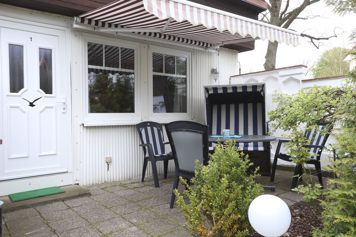 Der Bungalow 1 "Möwe" hat ein Wohnzimmer mit Küchenzeile und eine bequemen Schlafcouch für 1-2 Personen. Das Schlafzimmer mit Doppelbett ist klein aber gemütlich, das Duschbad hat ein Fenster. Die schöne Terrasse mit Terrassenmöbeln und Strandkorb und das kleine Gärtchen laden zum Verweilen im Freien ein. Der PKW-Stellplatz befindet sich auf dem eingezäunten Grundstück.