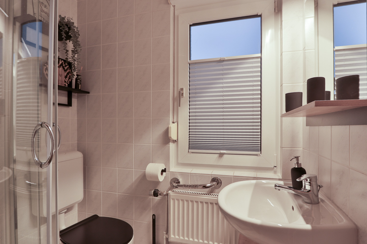 Diese Bungalowhälfte verfügt über ein gemütliches Wohnzimmer mit Couch, Fernseher mit DVD Player. Das Elternschlafzimmer hat 1 Dpoppelbett 140 x 200 cm und das Kinderzimmer hat 2 Einzelbetten ( Etagenbett). Das Duschbad ist mit Fenster ebenso die kleine Küche mit Pantry, Kühlschrank und alle Dinge die man zum tägliche Gebrauch benötigt. Alle Fenster haben Außenrollläden.