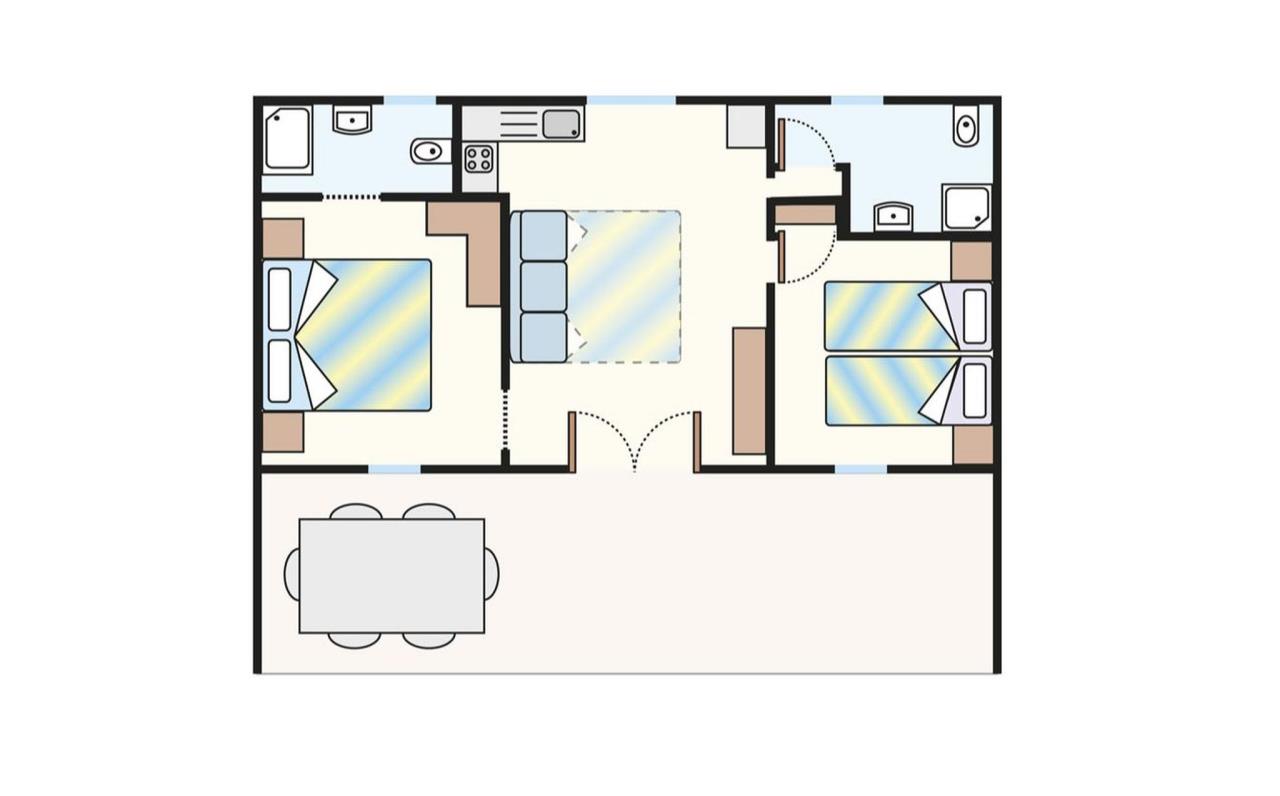 Die Unterkunft "Bungalow B6K PET" für max. 6 Personen besteht aus einem Elternschlafzimmer sowie einem Kinderzimmer mit zwei Einzelbetten. Im Wohnzimmer bietet ein Doppelbettsofa zwei weiteren Personen Platz. Die gut eingerichtete Küche befindet sich im Wohnbereich und verfügt über Geschirr, Besteck und Pfannen sowie Kühlschrank mit Eisfach. TV vorhanden. Die beiden Badezimmer verfügen je über eine Dusche sowie Waschbecken und WC. Der überdachte Sitzplatz mit Tisch und Stühlen lädt zum gemütlichen Entspannen ein, während die Kinder sich auf dem Spielplatz oder am Pool austoben können. Grillen ist an der öffentlichen Grillstelle erlaubt. Fahrzeit ab ital. Grenze ca. 4h. Auf Wunsch kann vor Ort auch Halb- oder Vollpension dazugebucht werden. Hinweis: In dieser Kategorie ist keine Zusatzperson möglich. Hinweis Wenn Sie mehr als eine Unterkunft benötigen, ist dies bei uns in der Regel möglich, da wir über mehrere Objekte des gleichen Haustyps verfügen.