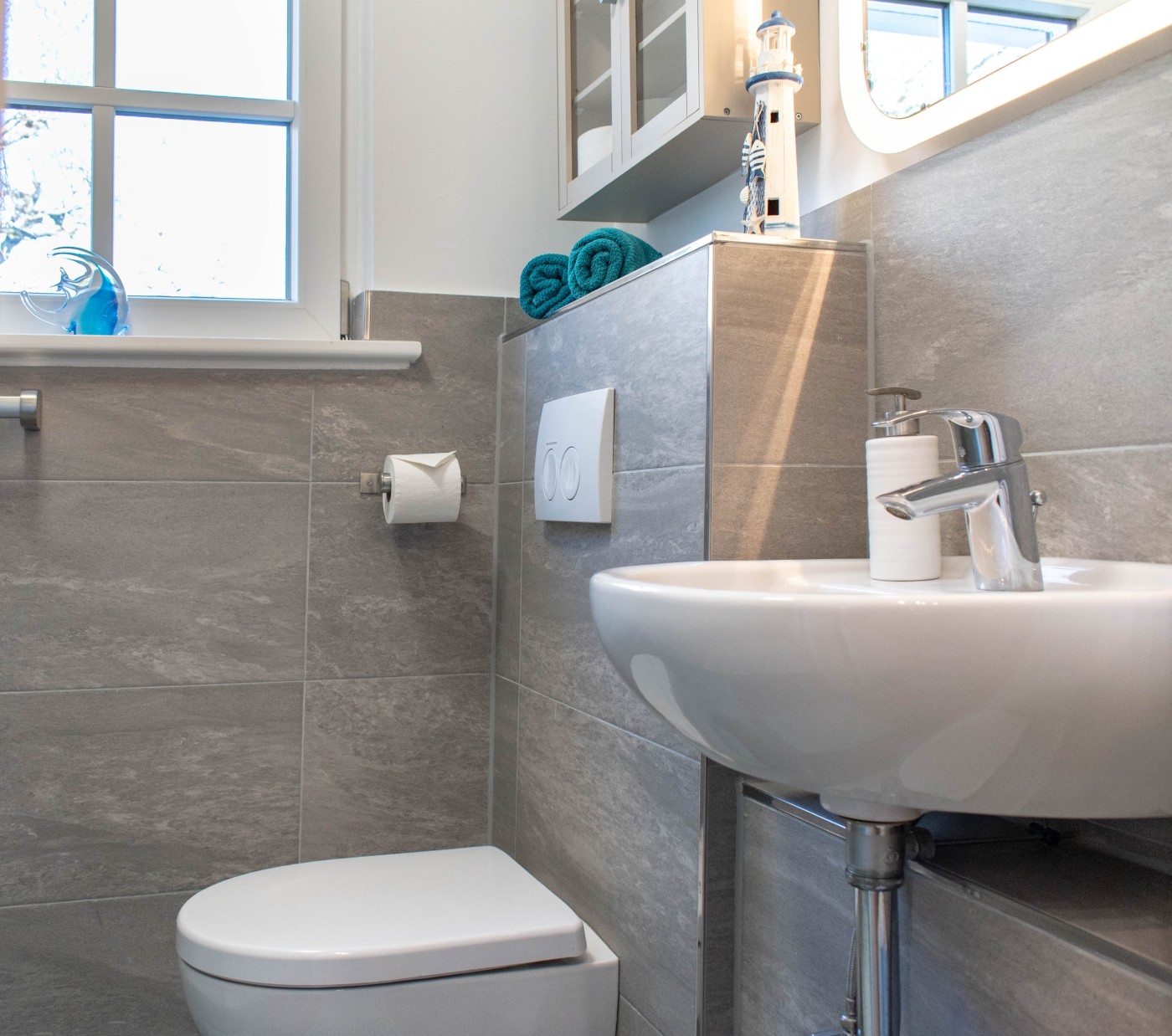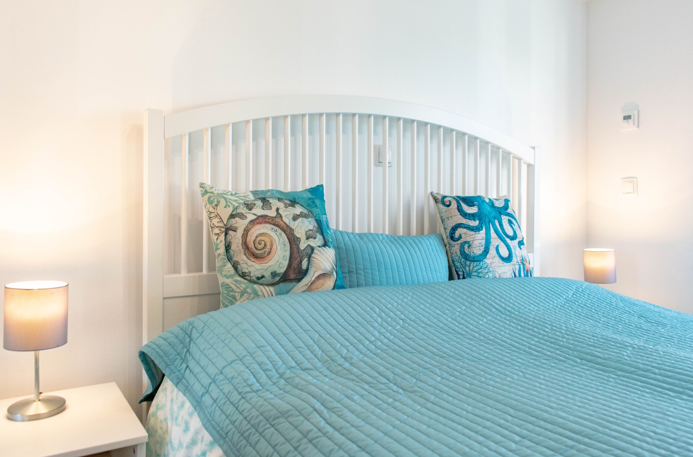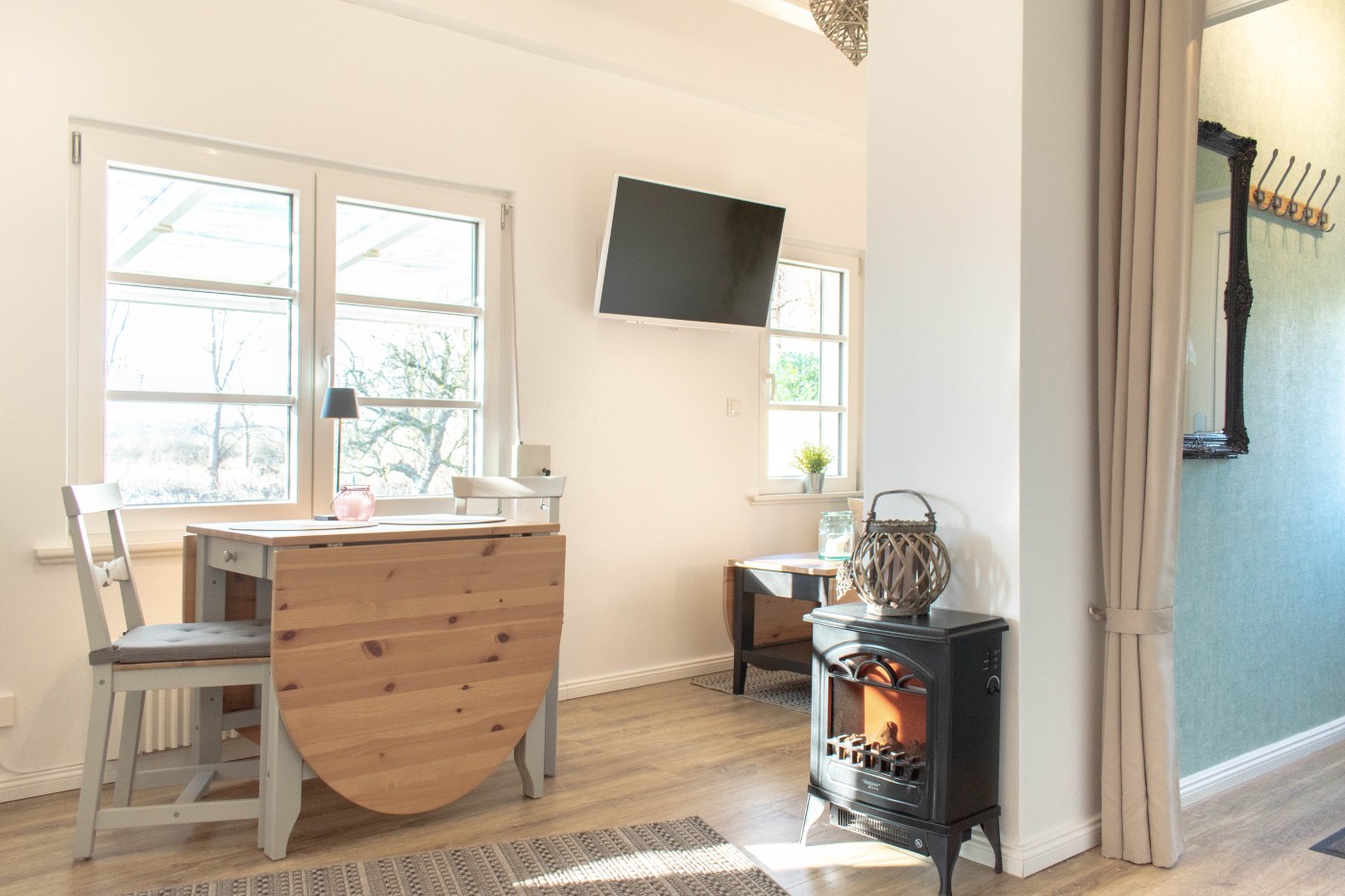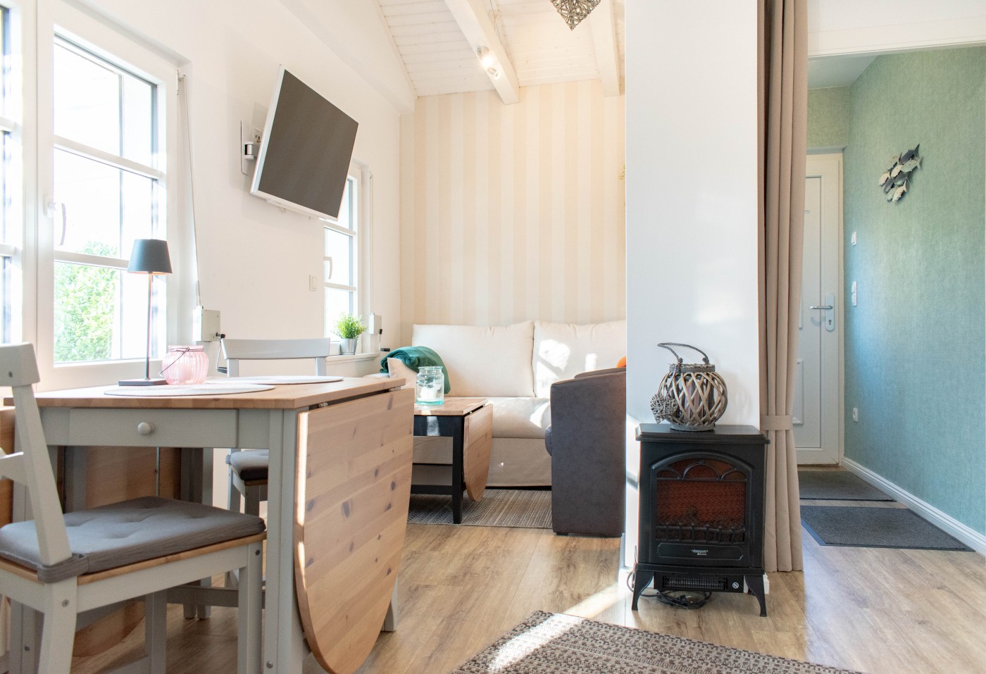 Der Bungalow ist modern im charmanten Landhausstil eingerichtet und mit liebevollen maritimen Details versehen. Ein besonderer Blickfang ist der helle, offene Dachstuhl, der dem Raum eine luftige und freundliche Atmosphäre verleiht.
