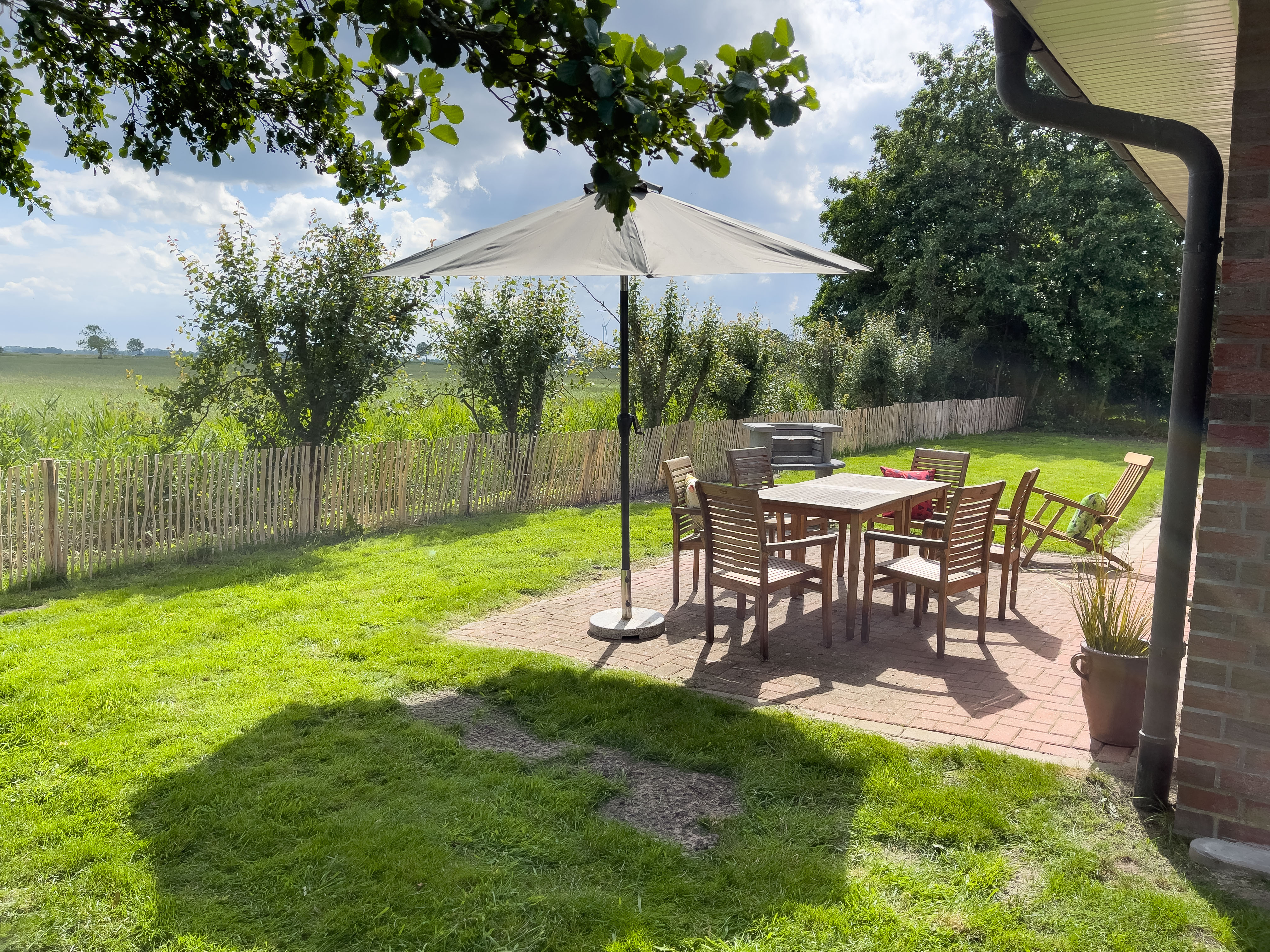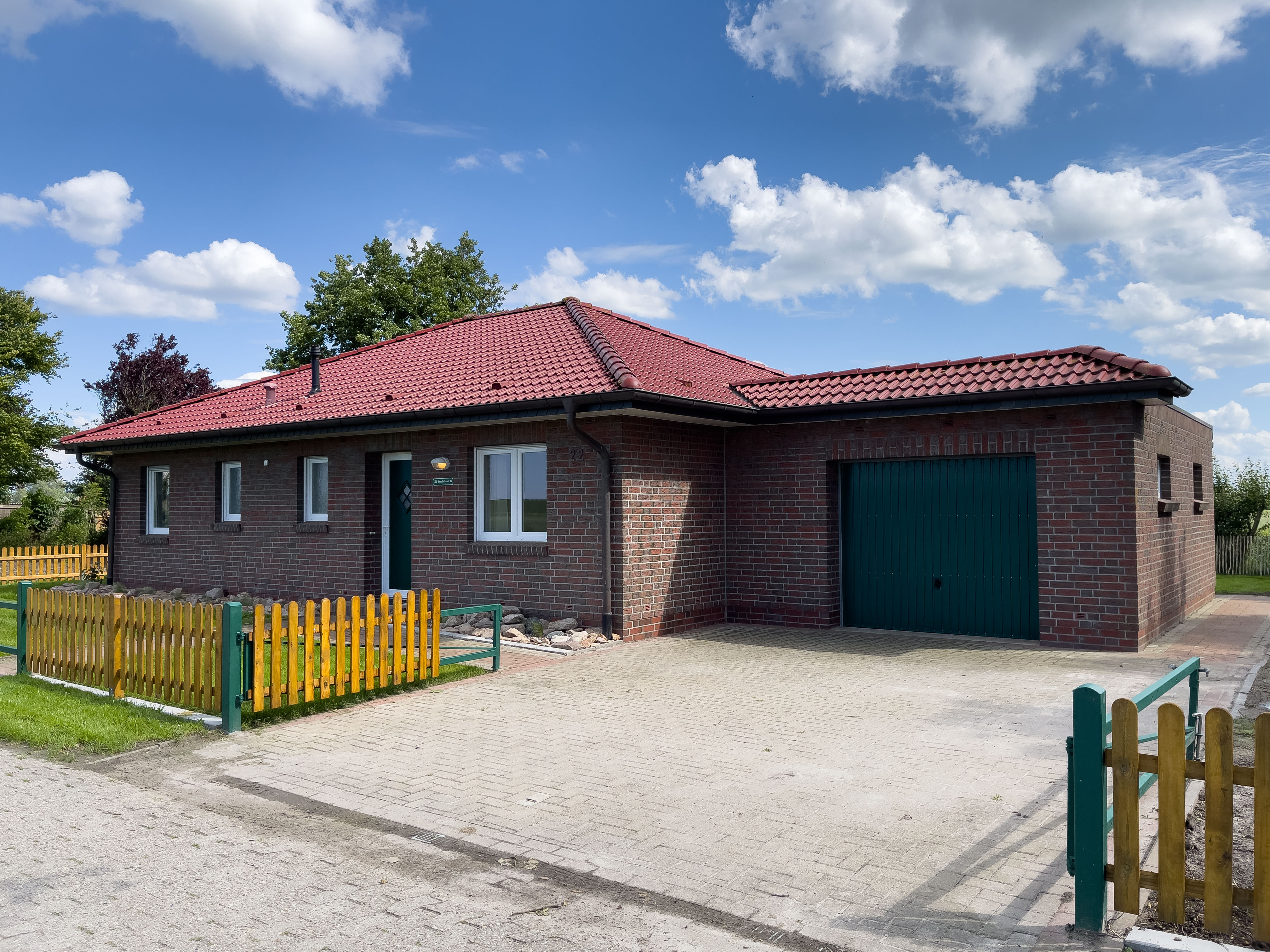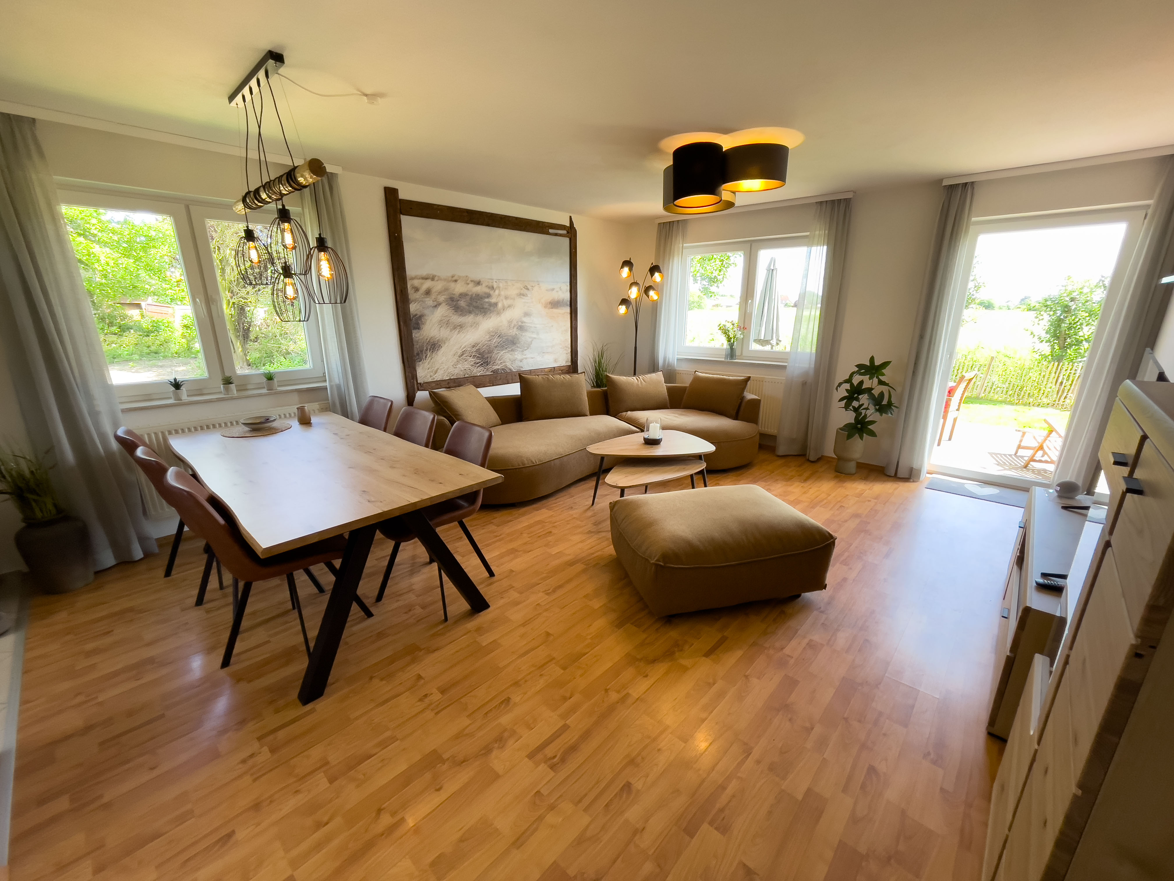 Der stilvoll und mit viel Liebe zum Detail eingerichtete Bungalow überzeugt mit einem großzügigen Wohn- und Essbereich, in dem sich die offene, voll ausgestattete Küche, ein gemütlicher Essplatz und ein behagliches Wohnzimmer mit Smart-TV harmonisch verbinden. Von hier aus gelangen Sie direkt in den eingezäunten Garten mit Sonnenterrasse und herrlich freiem Blick über die Felder – perfekt für ruhige Stunden im Freien oder gesellige Grillabende. Gartenmöbel und ein Steingrill stehen selbstverständlich bereit.