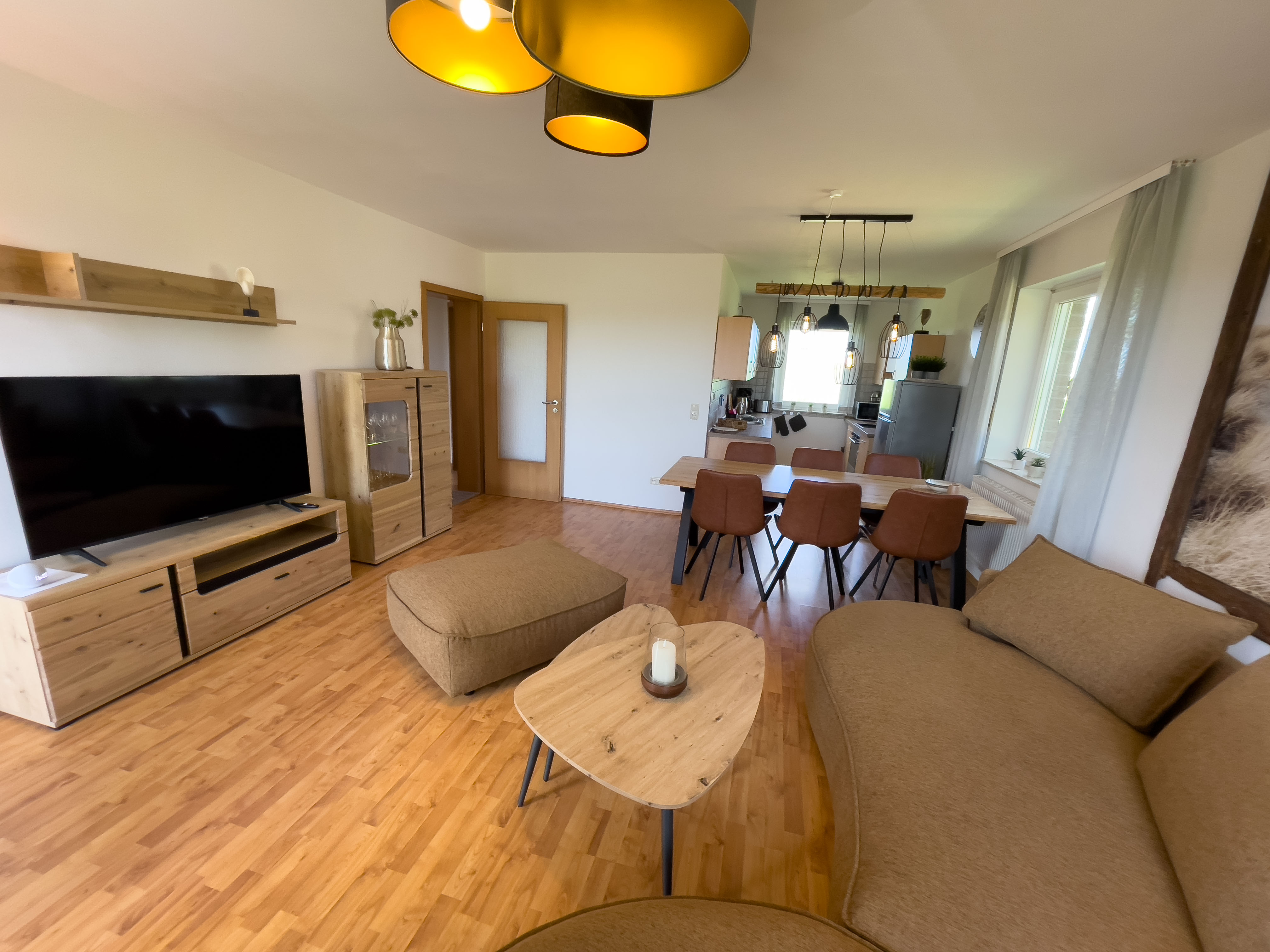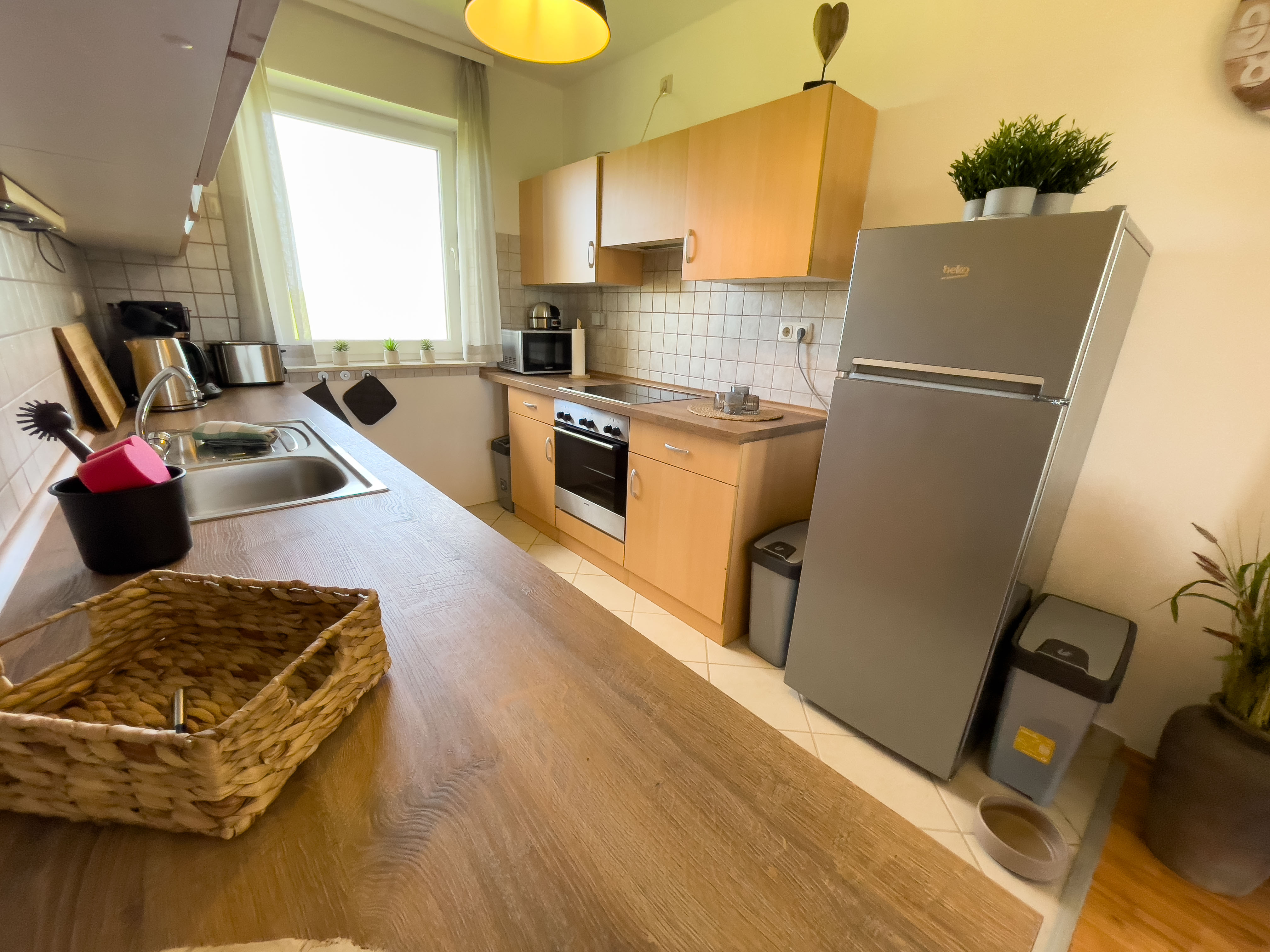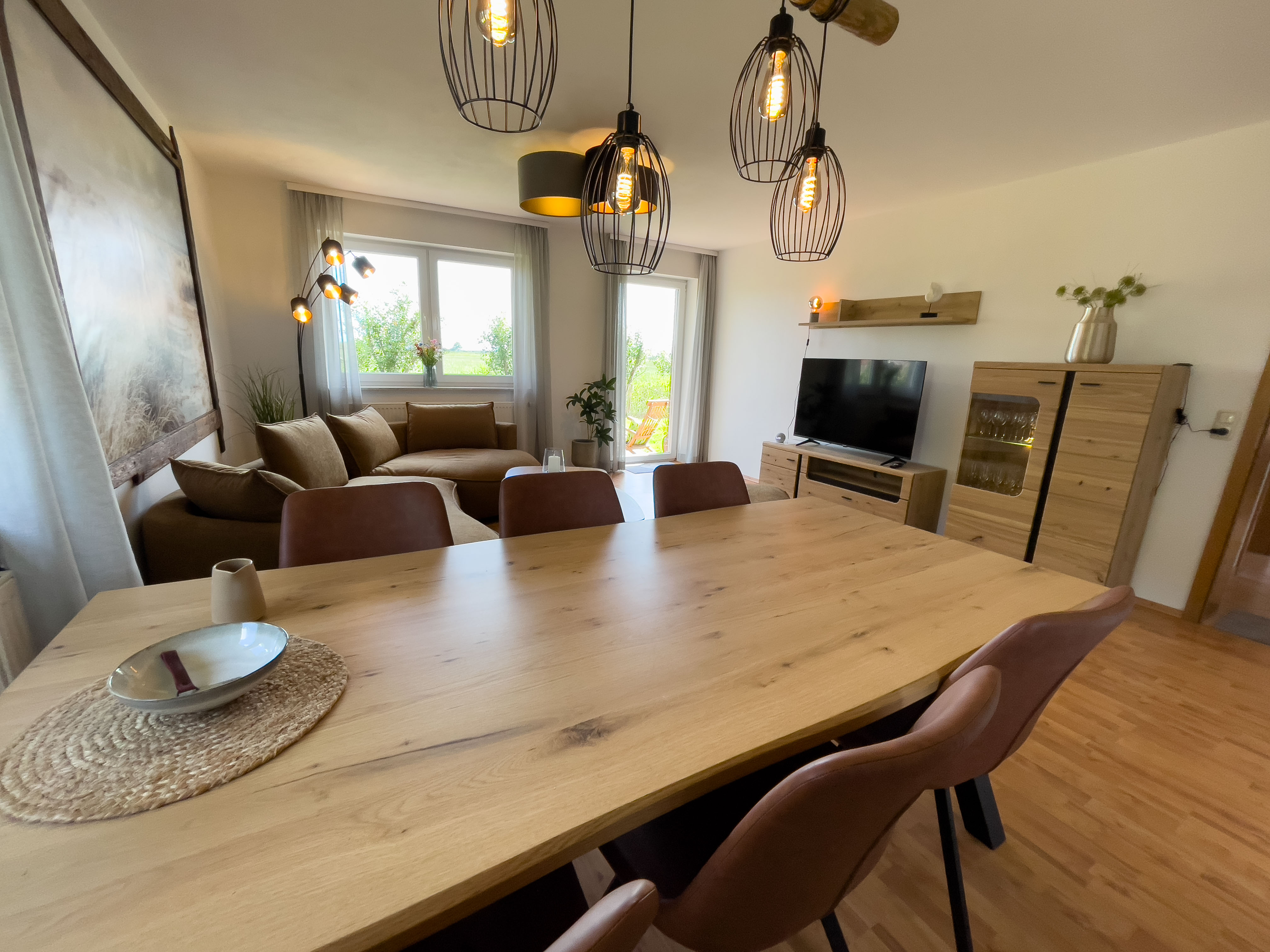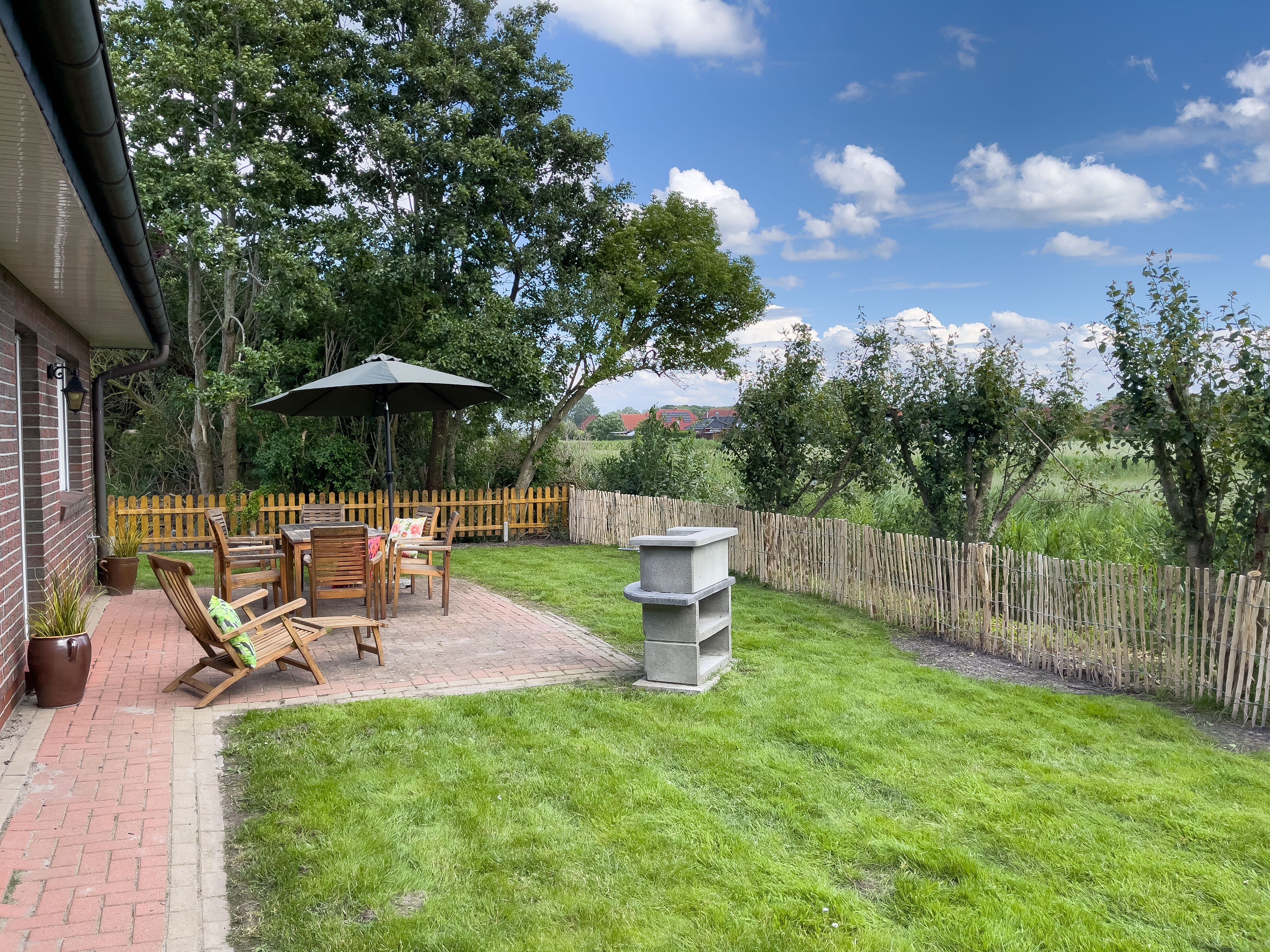Der stilvoll und mit viel Liebe zum Detail eingerichtete Bungalow überzeugt mit einem großzügigen Wohn- und Essbereich, in dem sich die offene, voll ausgestattete Küche, ein gemütlicher Essplatz und ein behagliches Wohnzimmer mit Smart-TV harmonisch verbinden. Von hier aus gelangen Sie direkt in den eingezäunten Garten mit Sonnenterrasse und herrlich freiem Blick über die Felder – perfekt für ruhige Stunden im Freien oder gesellige Grillabende. Gartenmöbel und ein Steingrill stehen selbstverständlich bereit.