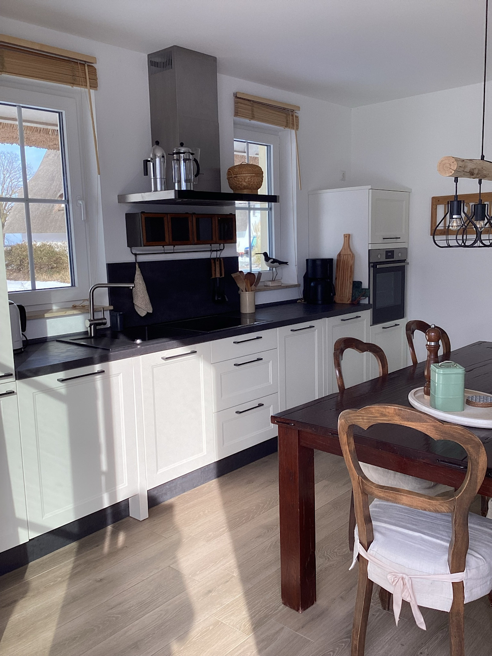 Haus 24 "Haffkoje" Die „Haffkoje" bietet Platz für sechs Personen. Insgesamt sind es vier Schlafzimmer. Im Erdgeschoß befindet sich das Erste von zwei Schlafzimmern mit einem Doppelbett (180/200cm). Ebenso ein großer Esstisch, an dem alle gemütlich sitzen können und in netter Runde bis spät in die Nacht zusammen geklönt werden kann. An kalten Tagen sorgt das Feuer in einem Kaminofen zusätzlich für Heimeligkeit.