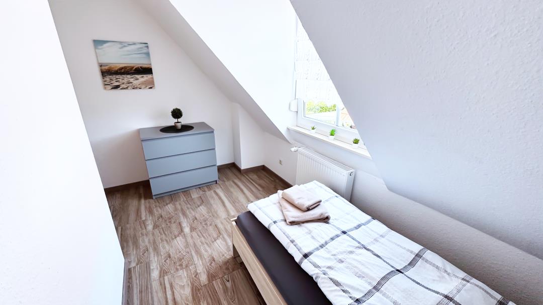 Das Ferienhaus bietet im 1. OG zwei Schlafzimmer: Eines ist mit einem Doppelbett 180 x 200cm und einem Kleiderschrank als Elternschlafzimmer hergerichtet. Dazu gehört ein zweites Schlafzimmer mit einem Einzelbett 90 x 200 cm und einer Kommode.