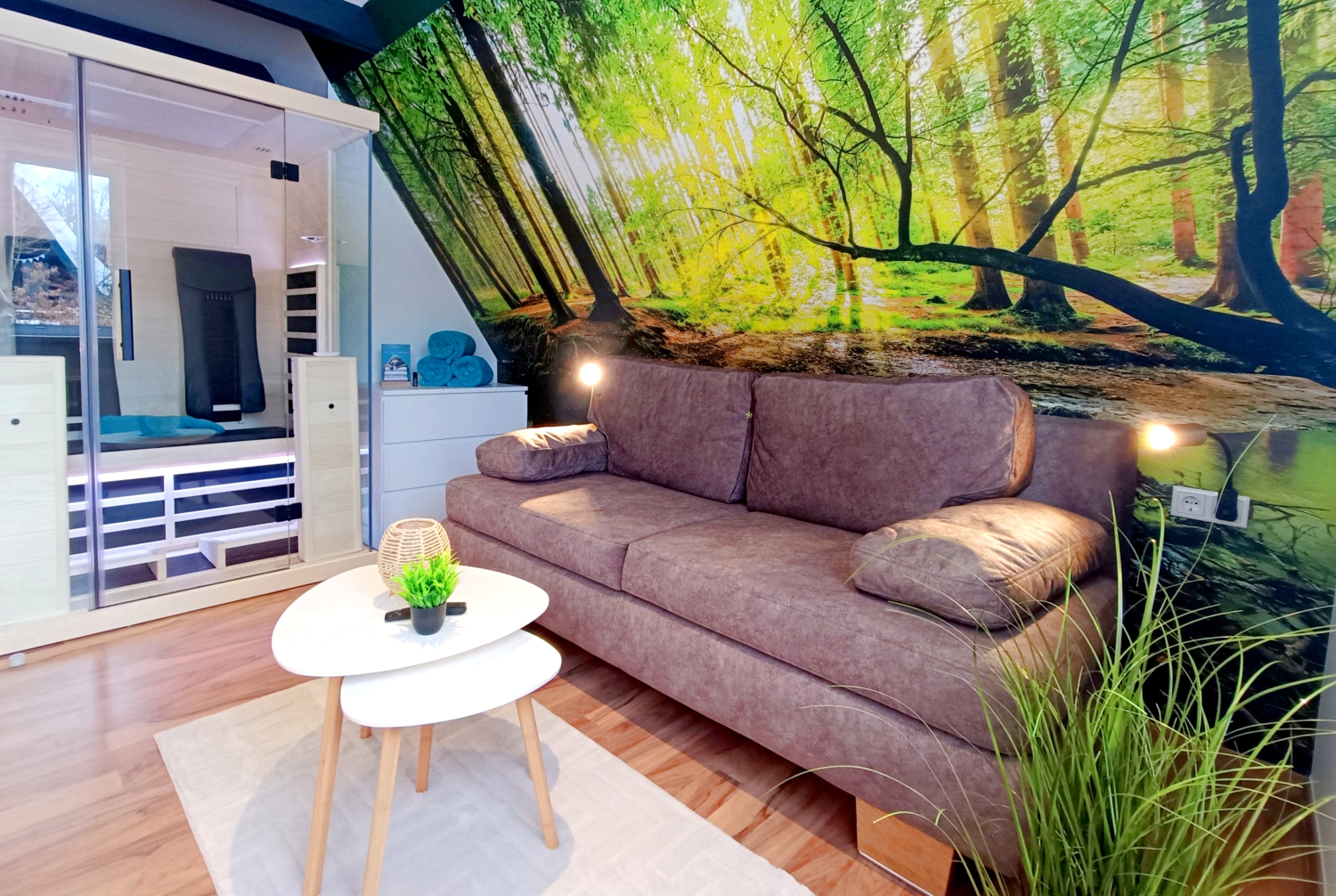 - variables Relax-Zimmer mit 2-Personen-Infrarotsauna, Relaxsofa und TV. Das Sofa ist wandelbar zur Schlafstätte für zusätzliche Personen 5-6.