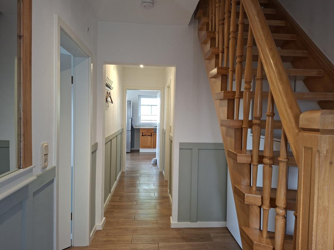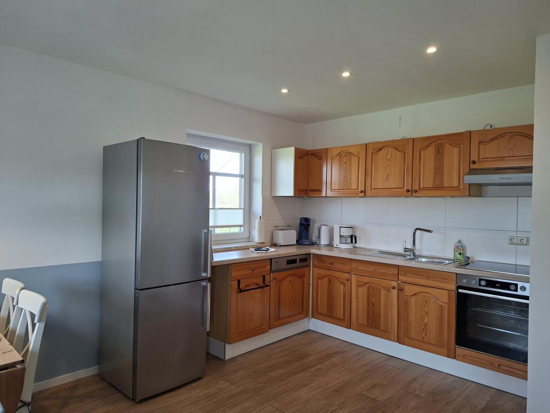 Im Untergeschoss der Ferienwohnung befindet sich eine große helle Wohnküche. Die Küche verfügt über einen Backofen mit Ceranfeld und einer Spülmaschine. Außerdem steht Ihnen eine große Kühl-Gefrierkombination zur Verfügung. Finden Sie Platz am gemütlichen Esstisch für vier Personen. Der Wohnbereich bietet außerdem eine übereck stehende Couch, einen TV und einen Sessel zum Entspannen oder auch gemütlichem Lesen. Im Erdgeschoss befindet sich ein Badezimmer mit ebenerdiger Dusche, ein Schlafzimmer mit einem Bett 1,40m breite. Im Obergeschoss erwartet Sie ein großzügiges Schlafzimmer mit einem Doppelbett 1,80m breite. Die Bettwäsche und Handtücher sind bereits im Mietpreis enthalten. Bei längeren Aufenthalt werden die Handtücher wöchentlich gewechselt. Auch eine E-Ladestation für Ihr Elektroauto steht am Haus zur Verfügung. Der Kurbeitrag ist bei Anreise in bar zu entrichten.