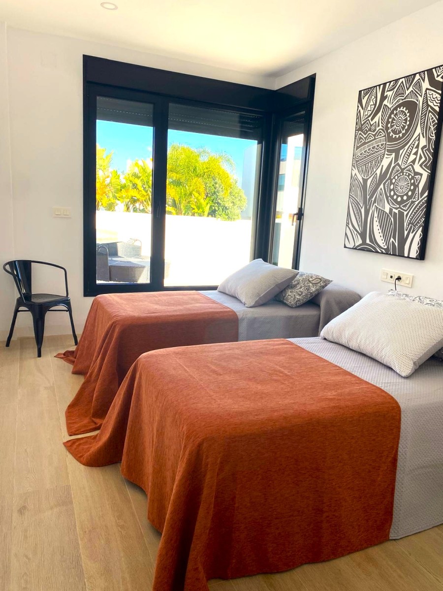 Villa al Mar ist eine fantastisch durchdachte Villa mit privatem Pool nur wenige Schritte von der schönen Bucht Cala Puntalejos in Conil Fuente del Gallo. Die Villa bietet allen Komfort, ist voll klimatisiert und kann das ganze Jahr genutzt werden. Im hellen Wohnzimmer gibt es ein großes Ecksofa und einen Kamin für die kältere Jahreszeit. Am großen Esstisch haben alle Platz und die bodentiefe Fensterfront bietet einen herrlichen Blick in den Garten und auf den Pool. Die Küche ist mit Glaselementen abgetrennt, so dass Sie immer optisch verbunden bleibt. Sie hat eine Kochinsel mit Barhockern und bietet genug Platz, wenn man mal zusammen kochen möchte. Die über zwei Stockwerke gehenden Fensterfront bietet viel Licht und betont die offene Architektur. Im Erdgeschoß befinden sich zwei der vier Schlafzimmer: Das linke Schlafzimmer hat zwei Einzelbetten und ein großzügiges Duschbad mit Overhead Shower und Bidet. Eine Terrassentür führt direkt zum Pool. Das zweite Schlafzimmer hat ein Schlafsofa guter Qualität (es wird eventuell noch durch zwei Einzelbetten ersetzt). Es gibt ein kleineres Duschbad ensuite. Im Erdgeschoß befinden sich außerdem noch ein Gäste WC und ein Abstellraum, in dem auch die Waschmaschine untergebracht ist. Im ersten Stock sind zwei weitere Schlafzimmer. Das Hauptschlafzimmer hat ein Doppelbett (150 cm) und ein größeres Duschbad mit Bidet und 2 Waschbecken ensuite. Die großen Fensterfronten mit Balkons bieten zur einen Seite den Blick auf den Pool und zur anderen kann man das Meer sehen. Das zweite Schlafzimmer hat ein Etagenbett mit einem etwas breiteren unteren Bett und auch ein Duschbad ensuite. Es hat auch Zugang zum Balkon und schon morgens nach dem Aufstehen kann man den Meerblick genießen. Die beiden Schlafzimmer oben haben neben der Klimaanlage auch Ventilatoren. Eine Tür führt zur Wendeltreppe draußen, über die man die große (unmöblierte) Dachterrasse erreicht, von der aus der Blick noch schöner ist und die ein herrlicher Platz für einen Drink am Abend ist. Rund um den 7,5 x 3,5 m großen Pool gibt es Sitzmöglichkeiten und ein Esstisch auf der Terrasse bietet die Möglichkeit auch draußen zu essen. Die Palmen und Strelitzien betonen die südliche Atmosphäre. Zur Cala Puntalejos sind es nur wenige Schritten und mit dem Auto ist man schnell in Conil oder an weiteren Stränden der Umgebung. Im Sommer ist das Restaurant Cala Puntalejos geöffnet und ein herrlicher Ort, um Essen zu gehen oder bei einem Glas Wein den Sonnenuntergang zu genießen.