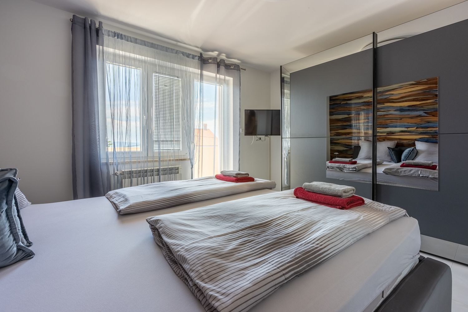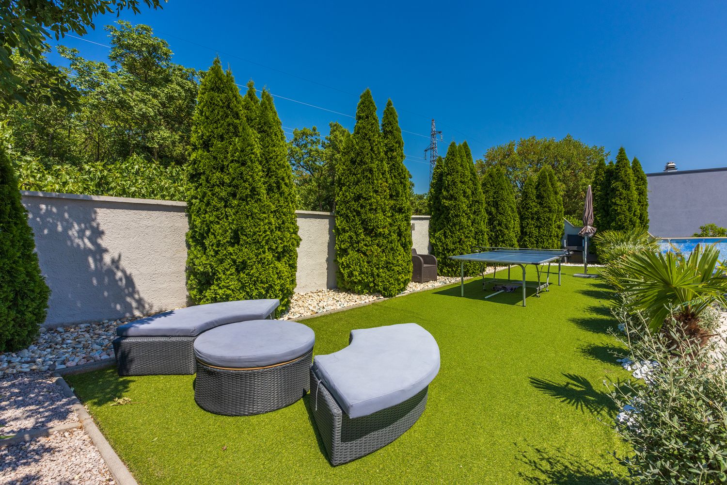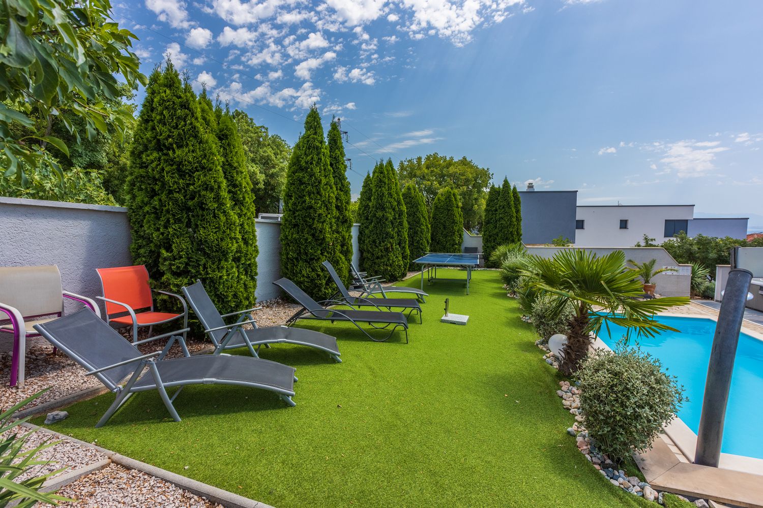 Dieses moderne Ferienhaus liegt in einem ruhigen Stadtteil des Urlaubsortes Crikvenica an der Kvarner Bucht. Es ist stilvoll und charmant eingerichtet. Der wundervolle Außenbereich bietet viel Platz und zahlreiche Freizeitmöglichkeiten. Der Wohnbereich sowie alle Schlafzimmer verfügen über Satellitenfernsehen. Im Keller des Hauses befindet sich ein separater Raum mit einem Billardtisch. Das Erdgeschoss besteht aus einer voll ausgestatteten Küche mit einem stilvollen Essbereich für bis zu acht Personen, einem Wohnraum, zwei Schlafzimmern mit Balkon, zwei Badezimmern und einem Wäscheraum. Von der Wohn-/Ess-/Küche aus hat man Zugang zum hinteren Außenbereich. Die übrigen zwei Schlafzimmer und zwei Badezimmer befinden sich im ersten Obergeschoss. Dort stehen Ihnen auch einige Fitnessgeräte zur Verfügung. Der gut ausgestattete Außenbereich wird durch den Poolbereich dominiert, der über eine schattige Terrasse, acht Sonnenliegen, einen Whirlpool für sechs Personen, einen Tischtennistisch und viel Grün verfügt. Diese Villa befindet sich in einer ruhigen und idyllischen Umgebung und ist daher für Partyurlauber nicht geeignet. Buchungen von Jugendgruppen unter 25 Jahren sind nicht möglich.