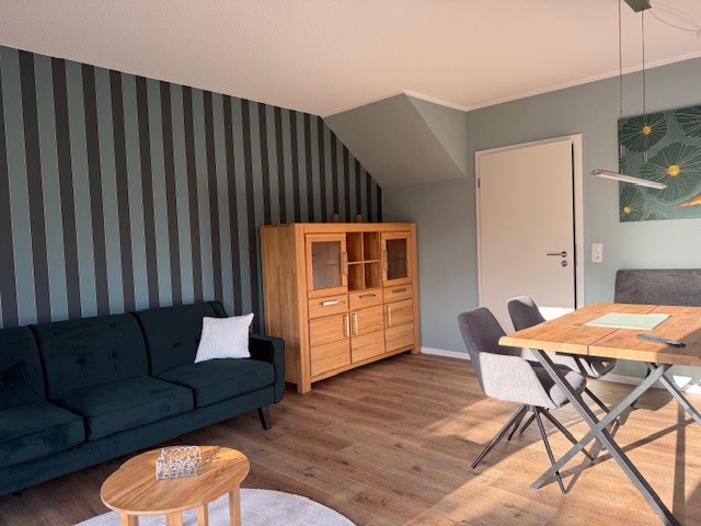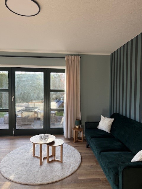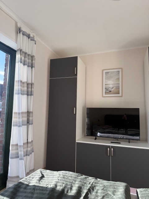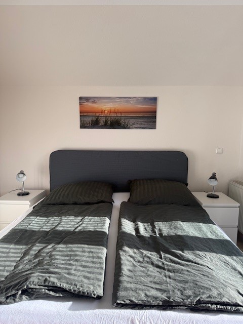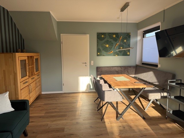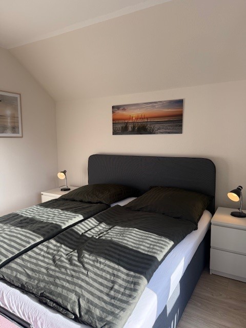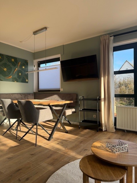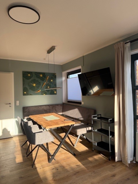Der Wohnpark Achtern Diek besteht aus 10 Reihenhäusern. Das Reihenaus 1j ist ein Endhaus mit Süd/West ausgerichteter Terrasse. Das Erdgeschoß besteht aus einem Wohnzimmer mit Zugang zur Terrasse, gemütlicher Sitzecke mit TV und eine Eckbank mit Platz für 4 Personen. Die kleine Küche geht vom Flur aus und hat Geschirrspülmaschine, Kaffeemaschine etc. Im Erdgeschoß befindet sich aus das Gäste-WC. Im Obergeschoß finden Sie die beiden Schlafzimmer. Das Elternschlafzimmer hat ein Doppelbett, Schrank, TV und einen kleinen Balkon. Das Kinderzimmer hat 2 Einzelbetten, TV und eine Kommode. In diesem Geschoß befindet sich auch das Bad mit Dusche/WC. Einen Abstellraum finden Sie rechts neben der Hauseingangstür. Hier steht auch die Waschmaschine
