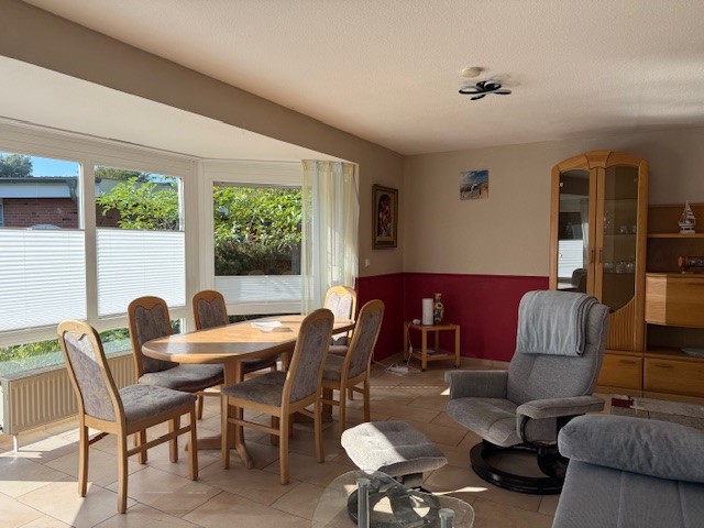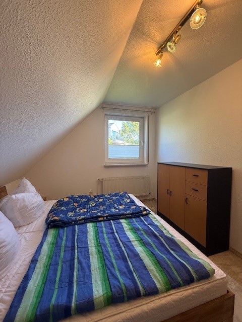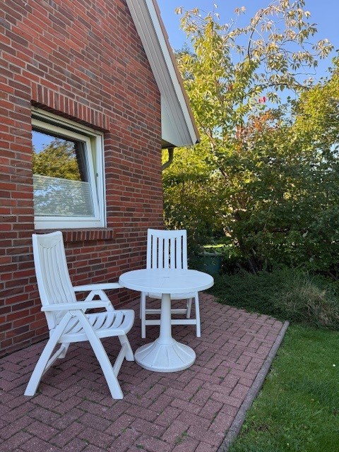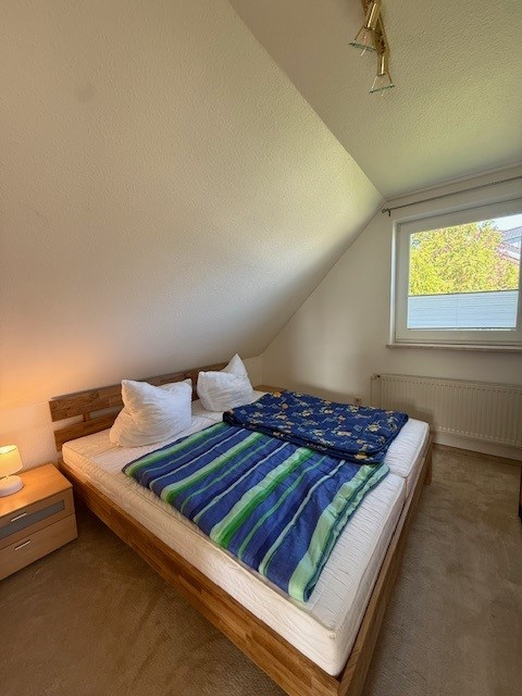 Das kleine Ferienhaus liegt in einer Sackgasse in ruhiger Lage. Im Untergeschoß befindet sich das Wohnzimmer, die Küche und ein Gäst-WC. All diese Zimmer gehen von einem großen Flur ab. Im Obergeschoß finden Sie ein Schlafzimmer mit Doppelbett und TV und ein zweites Schlafzimmer mit Doppelbett und Kommode. Das großzügige Bad mit Dusche und Badewanne befindet sich ebenfalls im Obergeschoß. Zum Haus gehört eine Terrasse mit Strandkorb und Terrassenmöbel und eine große Rasenfläche, die eingezäunt ist. Fahrradschuppen und 2 PKW-Stellplätze sind auch am Haus