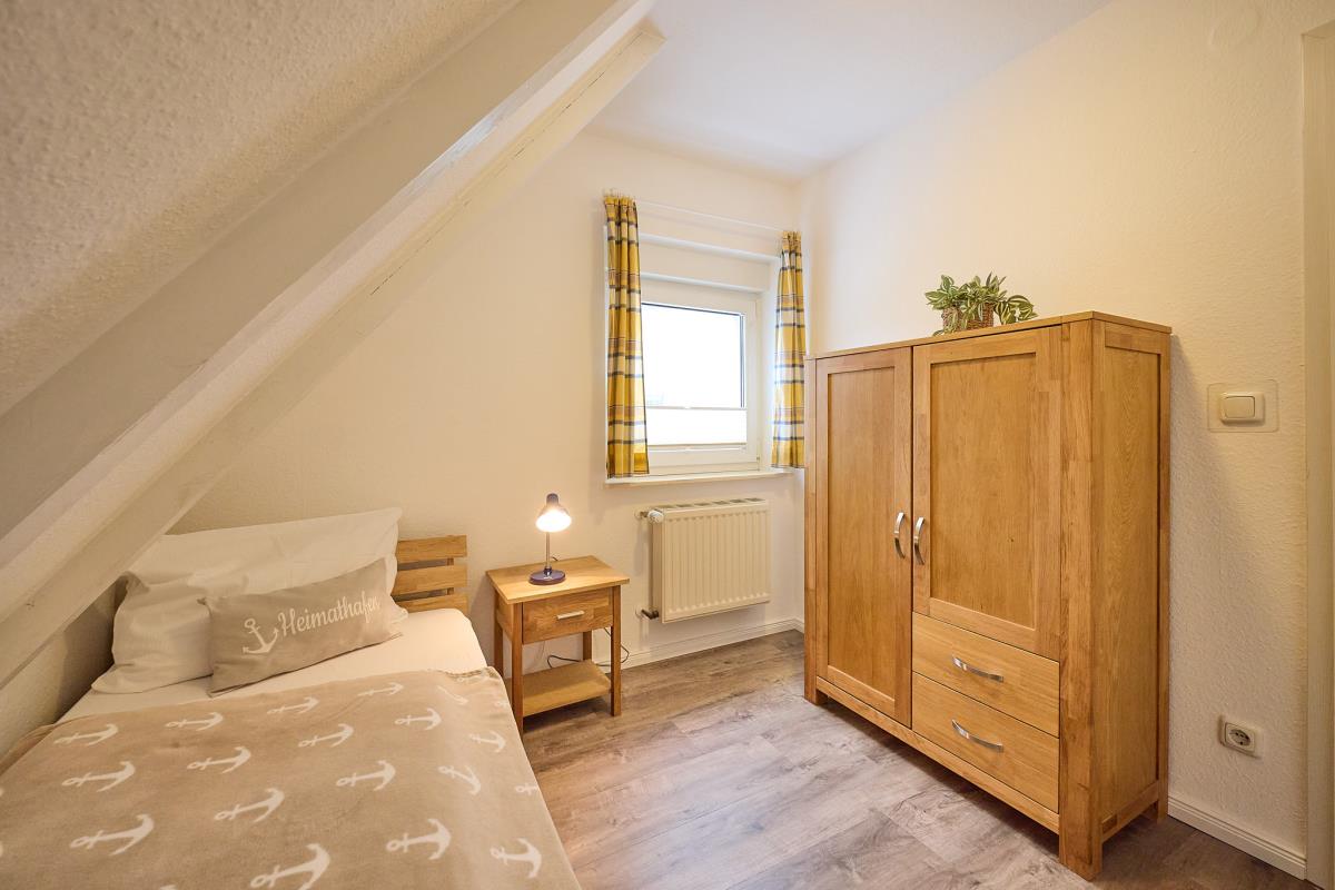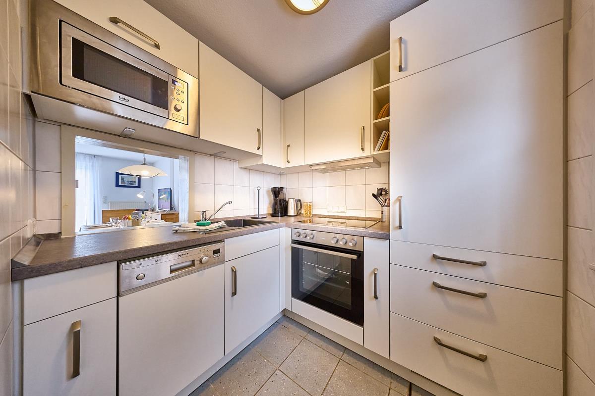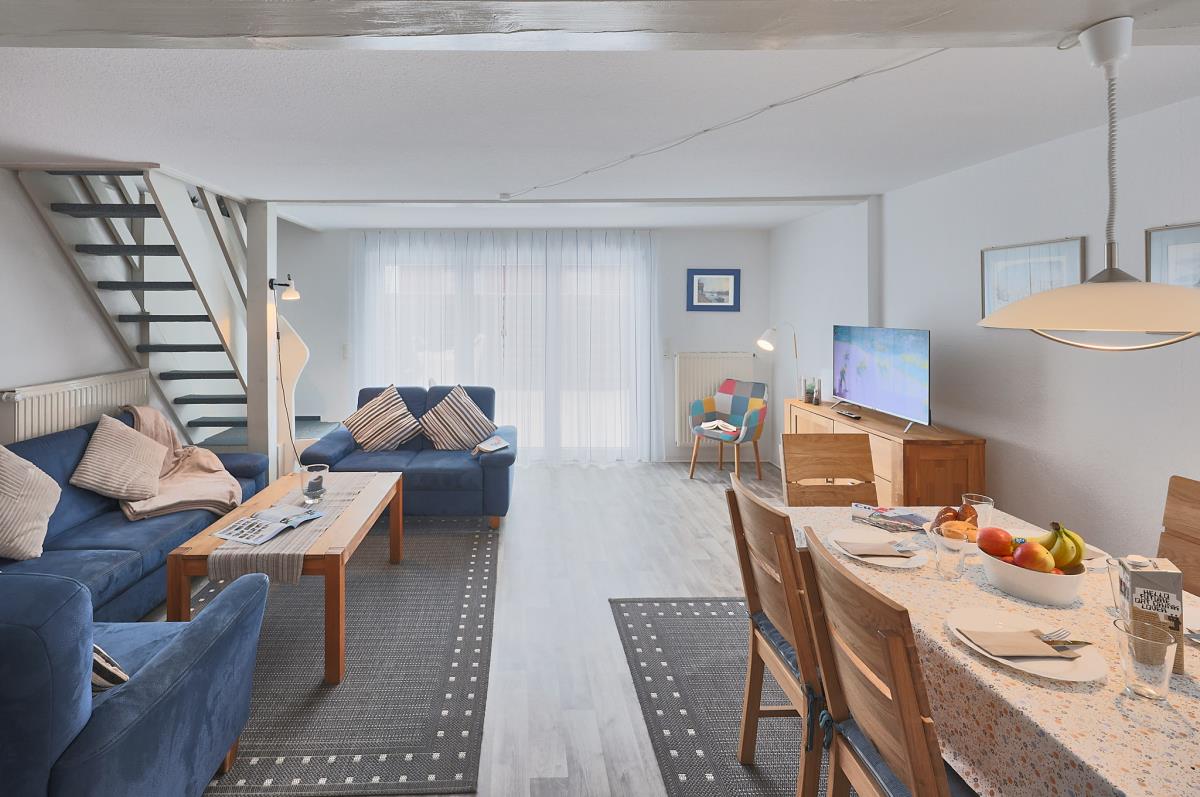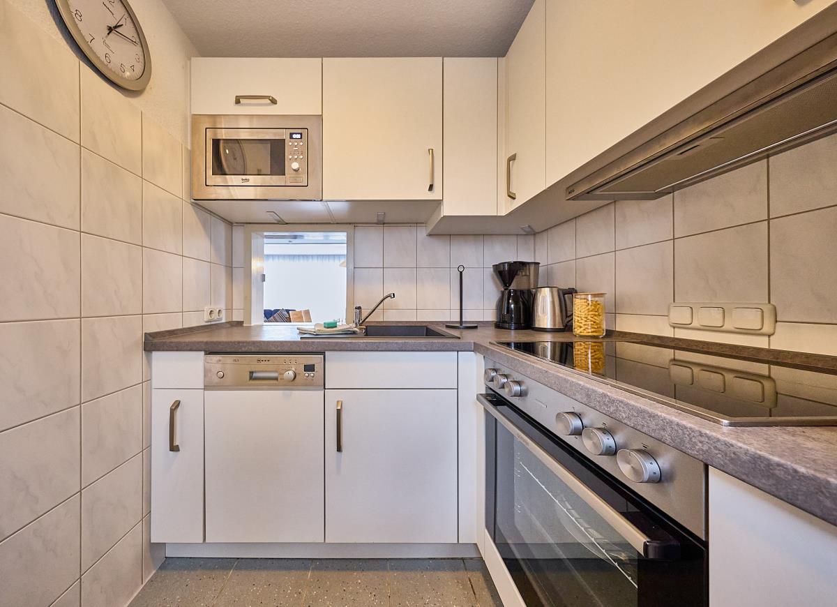 Das Ferienhaus bietet Platz für bis zu fünf Personen, die in drei separaten Schlafzimmern untergebracht sind. Ein Schlafzimmer verfügt über ein Doppelbett, das zweite über zwei Einzelbetten, und im dritten Schlafzimmer findet eine weitere Person ein gemütliches Einzelbett. Zusätzlich steht im Obergeschoss eine Gästetoilette zur Verfügung. Die voll ausgestattete Küche bietet alles, was Sie für die Selbstversorgung benötigen – Geschirr, Töpfe, Pfannen und Kochgeschirr sind selbstverständlich vorhanden. Der Wohn‑ und Essbereich ist hell und einladend; von der Essecke aus genießen Sie einen schönen Blick auf die Terrasse, und der gemütliche Wohnbereich lädt auch bei schlechtem Wetter zum Entspannen ein.