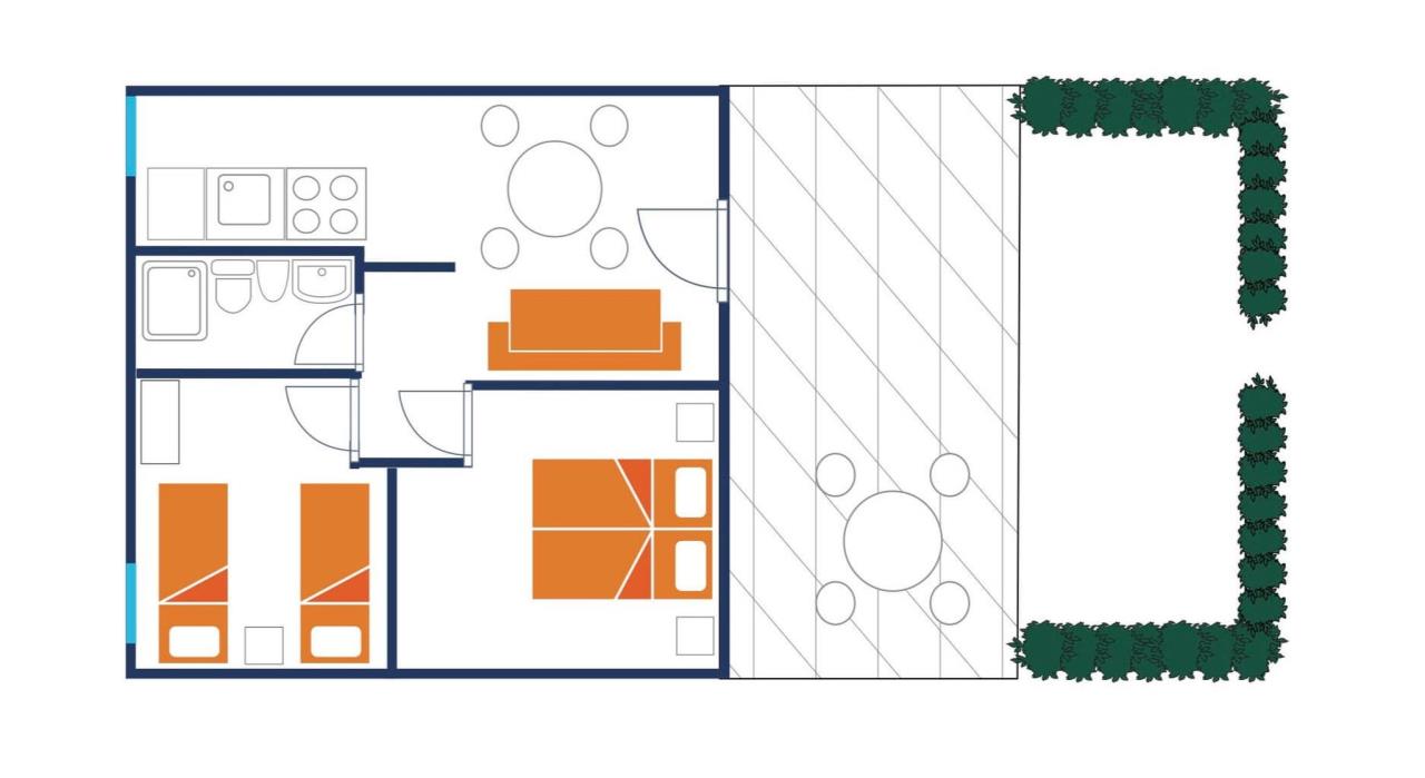 Das ebenerdige Holiday Home 6 mit eigenem Garten ist für max. 6 Personen geeignet und besteht aus zwei Schlafzimmern mit je zwei zu einem Doppelbett zusammenschiebbaren Einzelbetten. Zwei weitere Schlafmöglichkeiten befinden sich im Wohnzimmer. Die Kochnische, welche komplett mit Geschirr, Besteck, Töpfen, einer Mikrowelle, einer italienischen Espressokanne und Kühlschrank mit Eisfach eingerichtet ist. Das Badezimmer ist mit einer Dusche, einem Waschbecken, einem Bidet und einem WC ausgestattet. Der überdachte Sitzplatz mit Tisch und Stühlen lädt zum gemütlichen Entspannen ein, während die Kinder sich auf dem Spielplatz oder am Pool austoben können. Fahrzeit ab ital. Grenze ca. 4h. Grillen erlaubt (Gas oder Elektrisch). Hinweis: Wenn Sie mehr als eine Unterkunft benötigen, ist dies bei uns in der Regel möglich, da wir über mehrere Objekte des gleichen Haustyps verfügen.