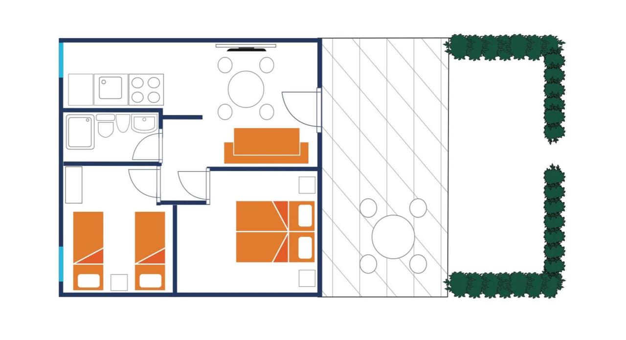 Das Holiday Home Blue Ivy ist ein Reihenhaus, das sowohl auf zwei Ebenen als auch komplett im ersten Stock verfügbar ist. Es ist für maximal 5 Personen geeignet und besteht aus zwei Schlafzimmern: eines mit zwei Einzelbetten, die zu einem Doppelbett zusammengeschoben werden können, und eines mit zwei Einzelbetten. Im Wohnzimmer gibt es ein Bettsofa, das zwei weitere Schlafgelegenheiten bietet. Der Wohnbereich ist mit einem TV ausgestattet. Die Kochnische ist komplett eingerichtet und verfügt über Geschirr, Besteck, Töpfe, eine Mikrowelle, eine italienische Espressokanne sowie einen Kühlschrank mit Eisfach. Das Badezimmer ist mit einer Dusche, einem Waschbecken, einem Bidet und einem WC ausgestattet. Der überdachte Sitzplatz oder Balkon (bei Apartments im ersten Stock) ist mit einem Tisch und Stühlen ausgestattet und lädt zum gemütlichen Entspannen ein. Zweistöckige Apartments verfügen über einen kleinen eingezäunten Garten, während andere einen Panoramablick bieten. Kinder können sich auf dem Spielplatz oder am Pool austoben. Die Grenze liegt bei ca. 4 Stunden. Grillen ist erlaubt (Gas oder elektrisch). Hinweis: Wenn Sie mehr als eine Unterkunft benötigen, ist dies bei uns in der Regel möglich, da wir über mehrere Objekte des gleichen Haustyps verfügen.
