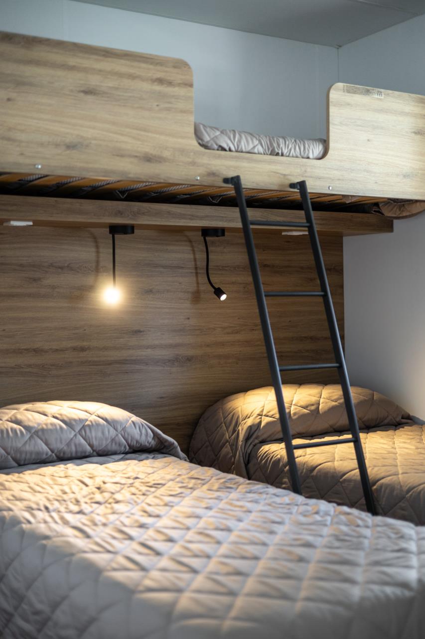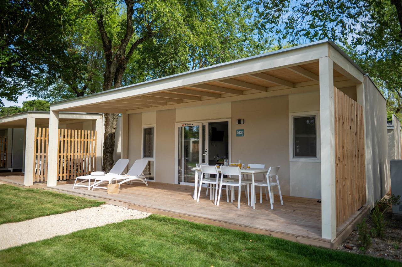 Die brandneue, exklusive Unterkunft bieten Platz für bis zu 6 Personen. Das Mobilehome verfügt über ein Schlafzimmer mit einem Doppelbett (160 x 200 cm) und zwei Kinderzimmer mit zwei Einzelbetten. Die gut eingerichtete Küchenzeile im kombinierten Wohn- und Essbereich ist mit einem Herd, Geschirr, Besteck, Töpfen, einer typisch italienischen Espressokanne, einer Mikrowelle sowie einem Kühlschrank mit Eisfach ausgestattet. Die Unterkunft verfügt über zwei Badezimmer mit einem Waschbecken, einer Dusche sowie einem WC pro Badezimmer. Das eine Badezimmer ist direkt mit dem Elternschlafzimmer verbunden. Die grosszügige und überdachte Holzterrasse ist mit einem Tisch und Stühlen ausgestattet – der ideale Ort also, um einen erlebnisreichen Badetag gemeinsam mit seinen Liebsten ausklingen zu lassen. Das Grillen bei der Unterkunft ist ebenfalls erlaubt, sodass einem gemeinsamen Grillabend nichts mehr im Wege steht (ein Elektro- oder Gasgrill ist selbst mitzubringen). SAT-TV ist vorhanden. Die Fenster sind mit Mückennetzen ausgestattet und es hat einen Wäscheständer. Fahrzeit ab ital. Grenze ca. 4h. Hinweis: Wenn Sie mehr als eine Unterkunft benötigen, ist dies bei uns in der Regel möglich, da wir über mehrere Objekte des gleichen Haustyps verfügen.