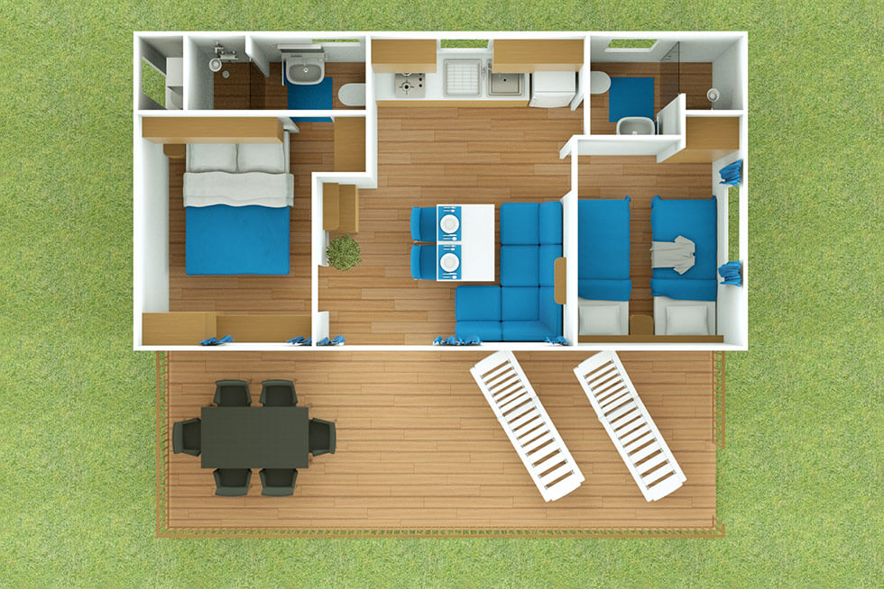 Die Unterkunft Istrian Home bietet Platz für max. 4 Erwachsene und 2 Kinder und besteht aus einem Elternschlafzimmer mit Doppelbett sowie einem Kinderzimmer mit zwei Einzelbetten. Zwei weitere Schlafgelegenheiten bietet das schöne Wohnzimmer mit einem ausziehbaren Bettsofa. Die gut eingerichtete Küche befindet sich im Wohnbereich und verfügt über einen Kochherd, Geschirr, Mikrowelle, Besteck, Wasserkocher, Kaffeemaschine, Kochtöpfe und einen Kühlschrank. Die beiden Badezimmer sind jeweils mit einer Dusche, einem Waschbecken und einem WC ausgestattet. Ein LCD TV mit Satellitenempfang ist vorhanden. Die überdachte Holzterrasse mit Tisch, Stühlen und zwei Liegen/Liegestühlen lädt zum gemütlichen Entspannen ein, während die Kinder sich auf dem Spielplatz oder am Pool austoben können. Die Unterkunft liegt nur einen Steinwurf vom Kinderpool entfernt. Grillen ist erlaubt (Gas oder elektrisch). Auf Wunsch kann vor Ort auch Halb- oder Vollpension dazu gebucht werden. Fahrzeit ab kroatischer Grenze ca. 3h. Hinweis: Wenn Sie mehr als eine Unterkunft benötigen, ist dies bei uns in der Regel möglich, da wir über mehrere Objekte des gleichen Haustyps verfügen.