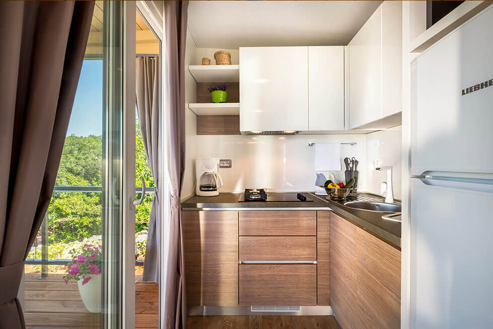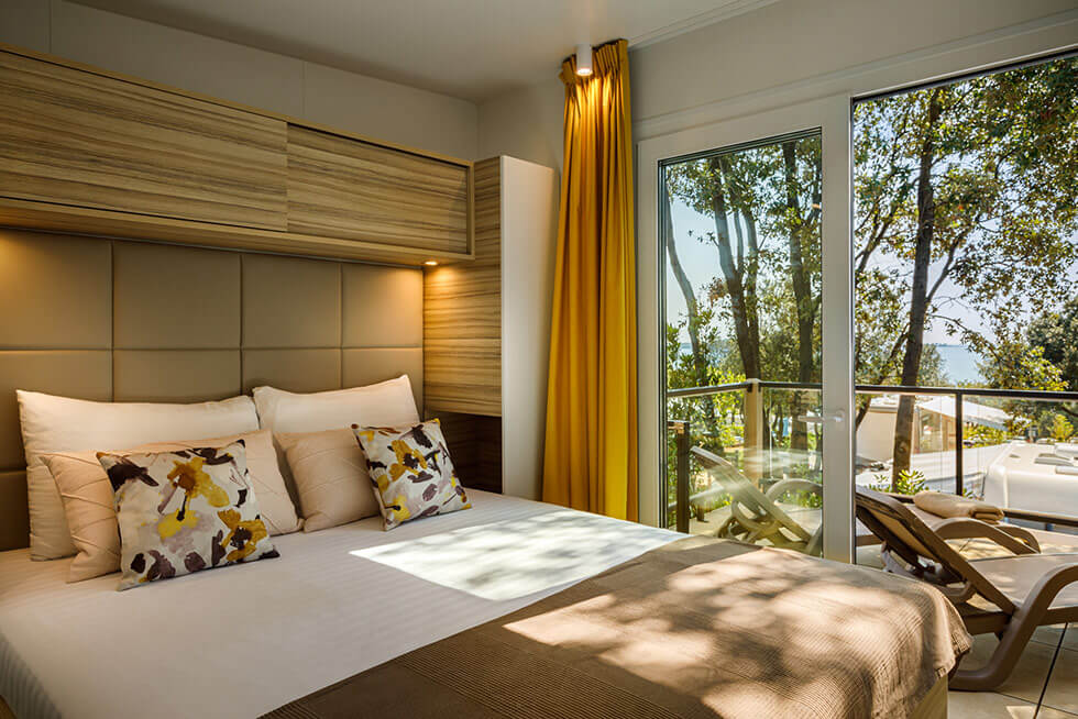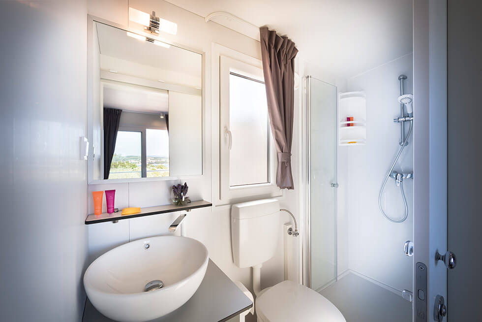 Das Mobilehome Bella Vista bietet Platz für max. 4 Erwachsene und 2 Kinder. Die Unterkunft ist im ruhigen Teil des Camping-Resorts, auf einer leichten Anhöhe mit herrlichem Blick auf das Meer gelegen und besteht aus einem Schlafzimmer mit Doppelbett, sowie einem zweiten Schlafzimmer mit zwei Einzelbetten. Eine weitere Schlafmöglichkeit für zwei Personen bietet das Schlafsofa im offenen Wohn- und Essbereich. Die gut eingerichtete Küche verfügt über einen Elektroherd, Geschirr, Besteck, Töpfe, Mikrowelle, Geschirrspüler und einen Kühlschrank mit Eisfach. Es gibt zwei Badezimmer, eines mit Dusche, Waschbecken und WC, das zweite Badezimmer bietet die gleiche Ausstattung und grenzt direkt an das Doppelzimmer. Die grosszügige, überdachte Terrasse mit Tisch, Stühlen, zwei Sonnenliegen und einem Grill lädt zum herrlichen Entspannen ein. Ein SAT-TV ist vorhanden. Fahrzeit ab kroatischer Grenze ca. 40 Minuten. Hinweis: Wenn Sie mehr als eine Unterkunft benötigen, ist dies bei uns in der Regel möglich, da wir über mehrere Objekte des gleichen Haustyps verfügen.