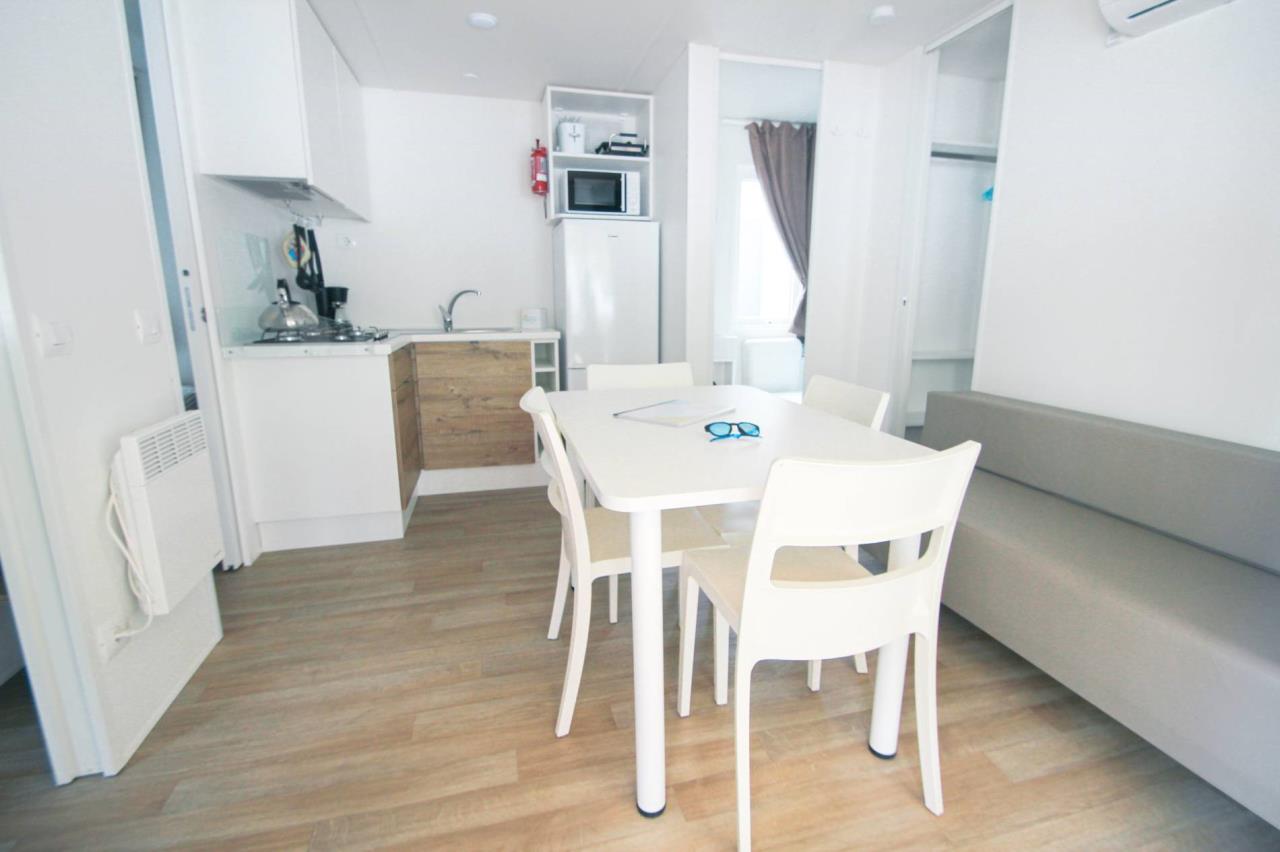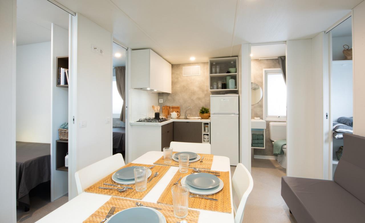 Das Mobilehome Happy Premium ist modern, hell und bequem eingerichtet und bietet Platz für max. 5 Personen (davon 3 Kinder bis max. 12 Jahre). Die Unterkunft besteht aus einem Elternschlafzimmer sowie zwei Kinderzimmern mit je zwei Einzelbetten. Eine weitere Schlafgelegenheit befindet sich im Wohnzimmer. Die gut eingerichtete Küche befindet sich im Wohnbereich und verfügt über 4-Flammen-Gasherd, Geschirr, Besteck, Töpfe sowie einen Kühlschrank mit Eisfach. Eine italienische Espressokanne ist auch vorhanden. Die beiden Badezimmer sind mit einer Dusche, einem WC und einem Waschbecken ausgestattet, es gibt ebenefalls einen Haartrockner. An allen Schlafzimmerfenstern sind Moskitonetze vorhanden. Die überdachte Holzterrasse mit Tisch, Stühlen und einem Hängesessel, sowei zwei Liegen im Aussenbereich, lädt zum gemütlichen Entspannen ein, während die Kinder sich auf dem Spielplatz oder am Pool austoben können. Eine Klimaanlage ist vorhanden. Eine elektrische Grillplatte ist vorhanden. Fahrzeit ab ital. Grenze ca. 10h. Bitte beachten Sie, dass bis zu 7 Personen auf Anfrage zugelassen werden, allerdings nur, wenn alle 7 Personen Eltern mit ihren eigenen Kindern sind (andere Verwandte sind nicht zugelassen). Die gleichen Gäste, die bei der Ankunft eingecheckt haben, müssen bis zum Ende des Aufenthalts bleiben. Änderungen der angemeldeten Personen oder der Anzahl der angemeldeten Personen sind nicht zulässig. Hinweis: Wenn Sie mehr als eine Unterkunft benötigen, ist dies bei uns in der Regel möglich, da wir über mehrere Objekte des gleichen Haustyps verfügen.