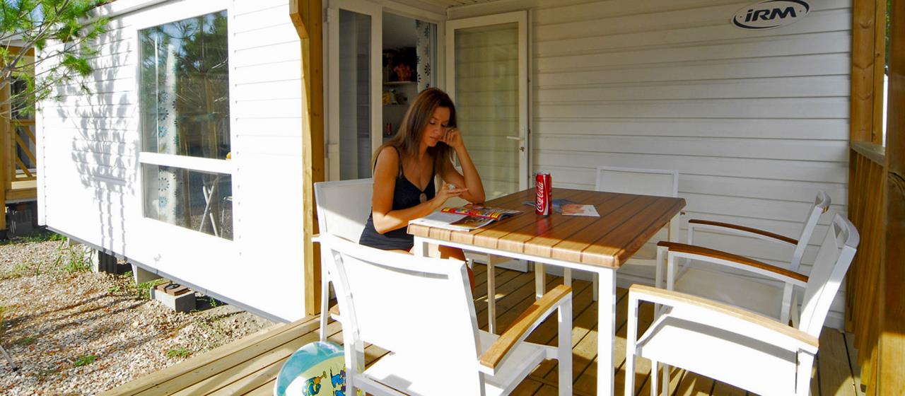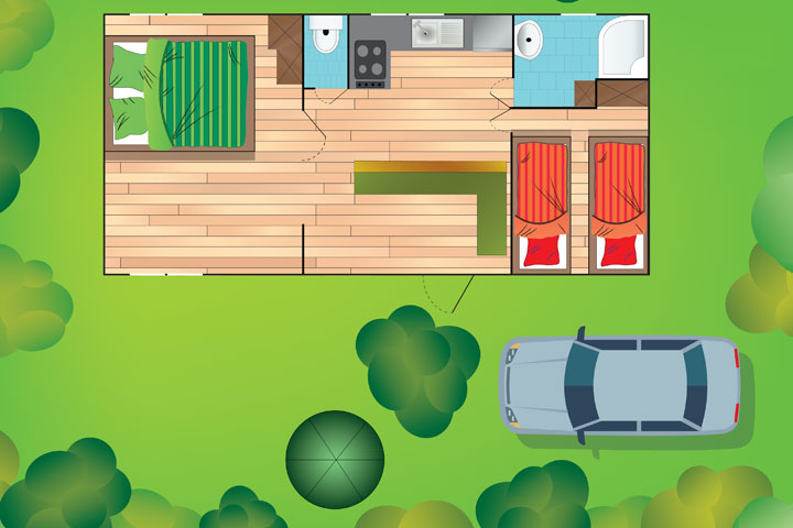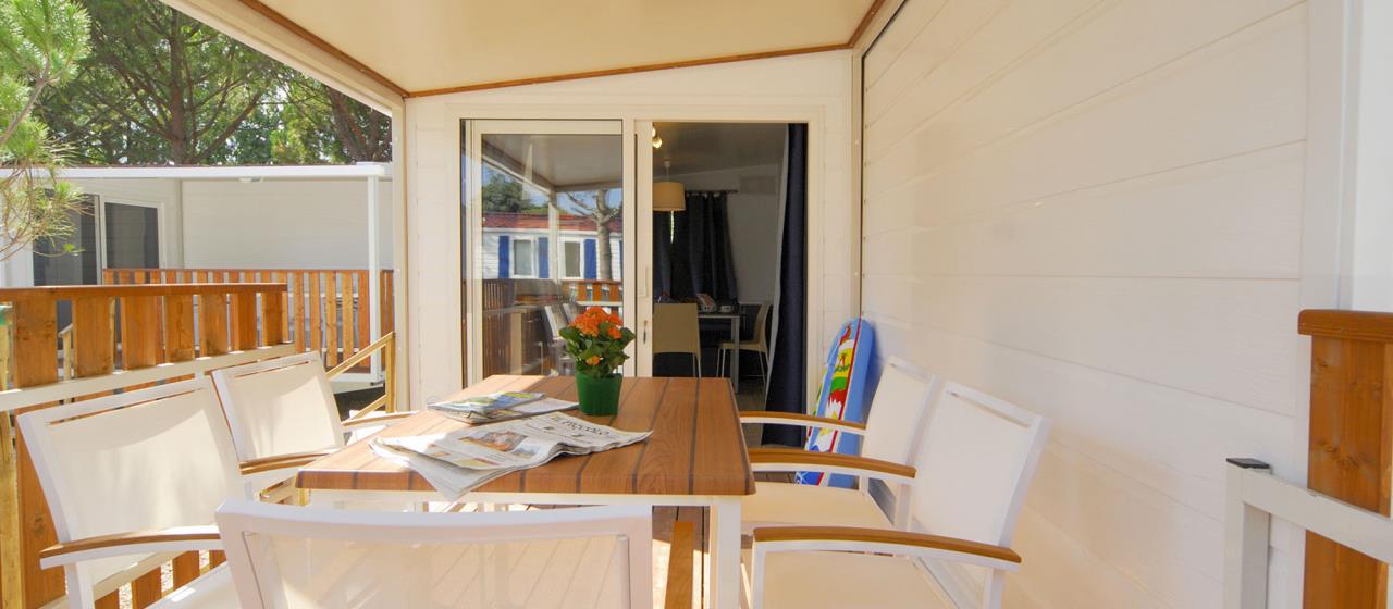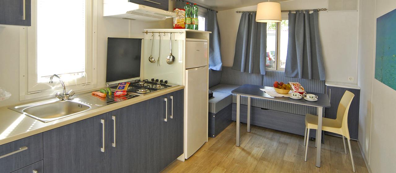 Das komfortable Mobilehome bietet Platz für max. 6 Personen und besteht aus einem Schlafzimmer mit Doppelbett, sowie einem zweiten Schlafzimmer mit zwei Einzelbetten. Im offenen Wohn- und Essbereich bietet ein Bettsofa bei Bedarf zwei weitere Schlafplätze. Ebenfalls im Wohnbereich befindet sich ein SAT-TV, sowie ein Tisch mit Stühlen. Die Küche verfügt über einen Gasherd, Geschirr, Besteck, Töpfe und einen Kühlschrank. Das Badezimmer ist mit Dusche, Waschbecken und WC ausgestattet. Die Terrasse ist möbliert und überdacht und lädt zum Entspannen ein. Fahrzeit ab italienischer Grenze ca. 2h. Hinweis: Wenn Sie mehr als eine Unterkunft benötigen, ist dies bei uns in der Regel möglich, da wir über mehrere Objekte des gleichen Haustyps verfügen.