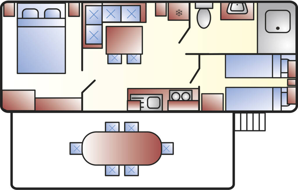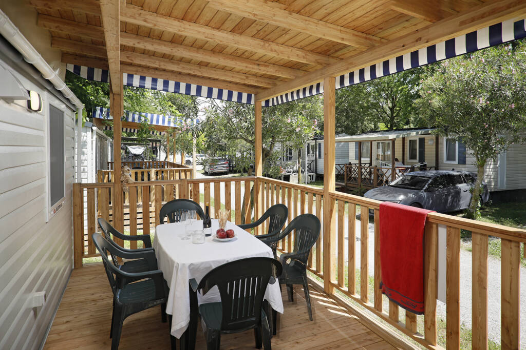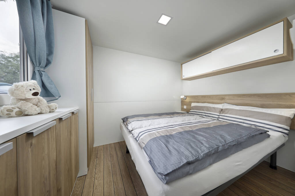 Das Mobilehome Mars bietet Platz für max. 5 Personen (davon ein Kind bis max. 6 Jahre). Die Unterkunft besteht aus einem Elternschlafzimmer mit Doppelbett sowie einem Kinderzimmer mit zwei Einzelbetten. Eine weitere Schlafgelegenheit für ein Kind bis 6 Jahre bietet das Bettsofa im Wohnzimmer. Die gut eingerichtete Küche befindet sich im Wohnbereich und verfügt über einen Gasherd, Spüle, Besteck, Geschirr, Töpfe, Filterkaffeemaschine, Mikrowelle, Wasserkocher sowie einen Kühlschrank mit Eisfach. Das Badezimmer ist mit einer Dusche sowie Waschbecken und WC ausgestattet. Die überdachte Holzterrasse mit Tisch und Stühlen lädt zum gemütlichen Entspannen ein, während die Kinder sich auf dem Spielplatz oder am Pool austoben können. Grillen mit einem Elektrogrill und mit Gas ist erlaubt. Fahrzeit ab italienischer Grenze ca. 2h. Hinweis: Wenn Sie mehr als eine Unterkunft benötigen, ist dies bei uns in der Regel möglich, da wir über mehrere Objekte des gleichen Haustyps verfügen.