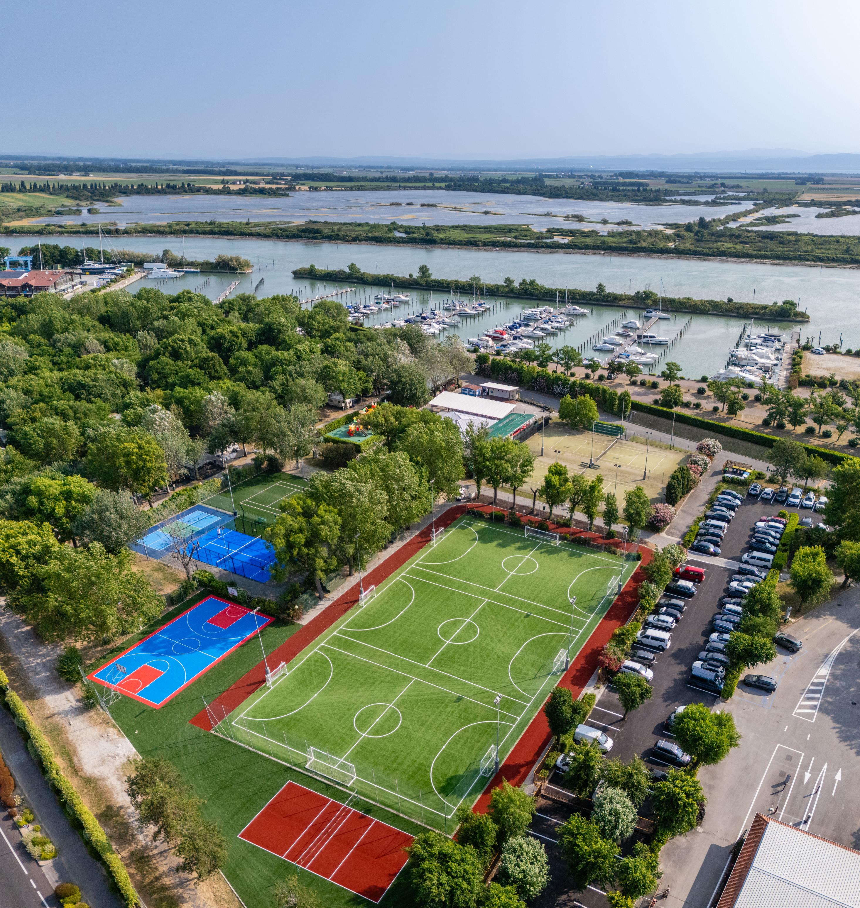 Die familienfreundliche Ferienanlage Tenuta Primero liegt direkt am Meer bei Grado, eingebettet in die malerische Lagunenlandschaft der nördlichen Adria. Unmittelbar neben dem Naturreservat „Valle Cavanata“ erwartet Sie das Resort mit einem 800m langen Lagunenstrand, einem eigenen Hafen und einer grosszügigen Poollandschaft inklusive Kinderbecken. Während die Poolbar für Erfrischungen sorgt, stehen rund um die Becken bequeme Liegestühle und Schirme (gegen Gebühr) für Sie bereit. Sportbegeisterte finden hier ein wahres Paradies: Neben einem 18-Loch-Golfplatz mit Blick auf die Lagune bietet die Anlage Plätze für Fussball, Basketball und Tennis sowie einen eigenen Skatepark. Die hauseigene Wassersportschule lädt zum Windsurfen, Kiten oder Katamaranfahren ein; zudem lassen sich Boote, Fahrräder und Schnorchelausrüstung bequem ausleihen. Ein besonderes Highlight für Familien ist der neue schwimmende Wasserpark direkt im Meer sowie der Spielplatz für die kleinen Gäste. Mehrere Restaurants und Bars sorgen für kulinarische Abwechslung, während Annehmlichkeiten wie WLAN und Münzwaschsalons den Komfort abrunden.