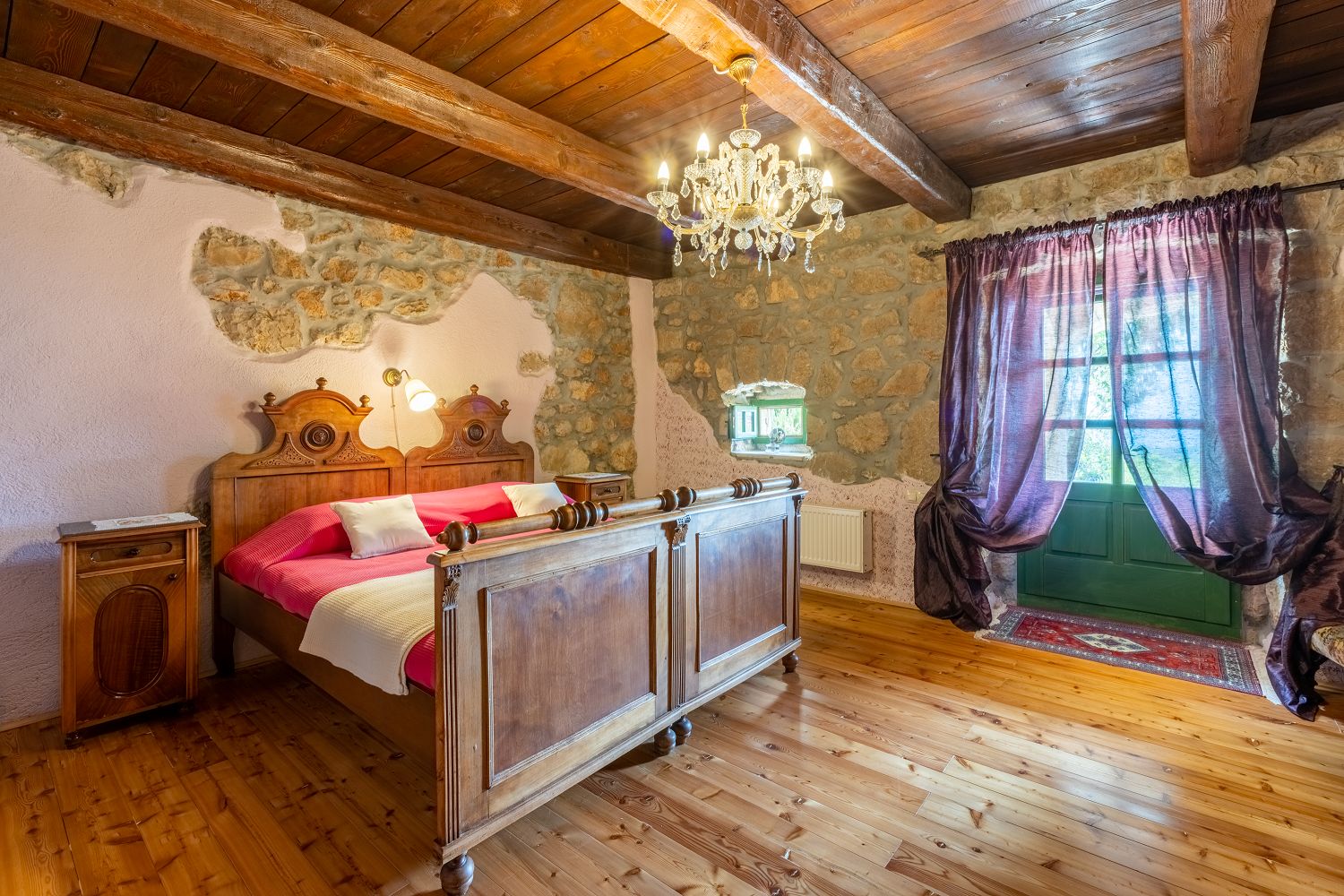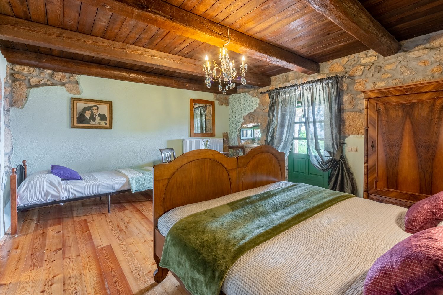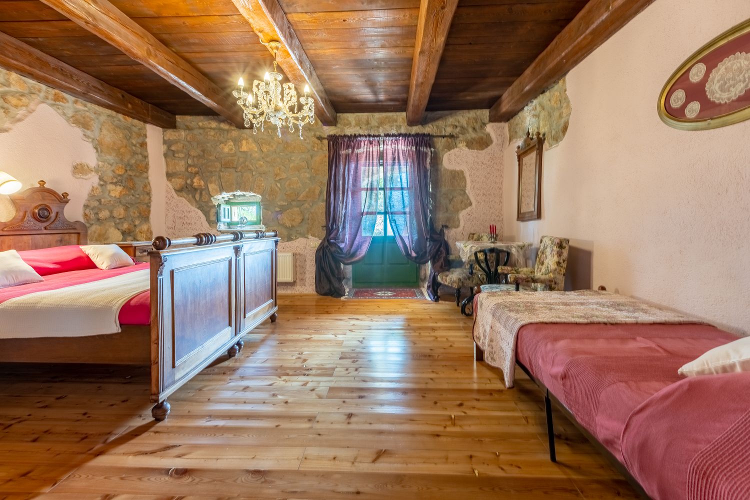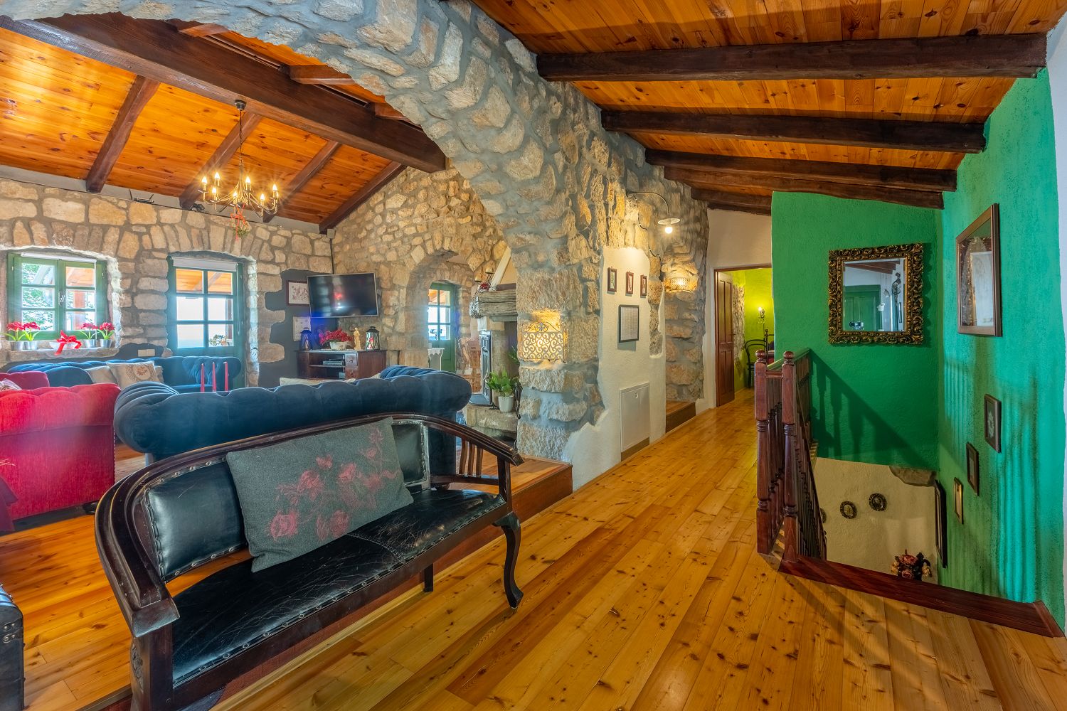 Das Ferienhaus erstreckt sich über zwei Etagen und bietet auf ca. 220 m² Wohnfläche mehrere Eingänge von allen Seiten. Die Räume sind sehr groß: Das Wohnzimmer ist ca. 30 m² groß, die Küche mit Esszimmer ebenfalls. Die Räume sind offen und vermitteln dadurch ein Gefühl von Freiheit. Die Schlafzimmer sind jedoch für ruhiges Schlafen voneinander getrennt. Es gibt luxuriös eingerichtete und sehr große Bäder, eine Terrasse mit Meerblick, einen Garten vor dem Haus und einen weiteren großen Garten hinter dem Haus. Das Haus wird ganzjährig vermietet und ist komplett beheizt, die Bäder verfügen sogar über Fußbodenheizung. Zwei größere Schlafzimmer befinden sich im Erdgeschoss und haben direkten Zugang zur Terrasse. Auf der anderen Seite befinden sich zwei große Bäder mit jeweils zwei Waschbecken aus Stein. In beiden Zimmern steht jeweils ein rustikales Doppelbett (ca. 160 x 200 cm) mit Top-Matratzen sowie ein weiteres Einzelbett. Ob Sie das Einzelbett benutzen möchten, ist Ihnen überlassen. Durch die Treppe im Flur sind beide Zimmer mit dem ersten Geschoss verbunden. Dort befindet sich ein weiteres, jedoch kleineres Schlafzimmer mit einem Doppelbett (140 x 200 cm). Neben dem Zimmer steht eine Toilette mit Waschbecken zur Verfügung. Weiter geht es zum Wohnzimmer, in dem sich auch eine Klimaanlage befindet. Von hier aus gelangt man zur Terrasse/zum Balkon sowie durch eine massive gewölbte Steinöffnung in die Küche und das Esszimmer. Vom Wohnzimmer aus gelangt man auch zur Garage. Auf der anderen Seite befindet sich der Haupteingang. Im Wohnzimmer stehen ein SAT-TV mit DVD-Player und Surround-System zur Verfügung. Es ist auch Wireless Internet vorhanden. Die Küche ist mit Besteck, Pfannen, Töpfen und Küchentüchern ausgestattet. Weiterhin vorhanden sind ein Toaster, eine Mikrowelle, ein Wasserkocher und natürlich eine Kaffeemaschine. Ein Geschirrspüler ist ebenfalls vorhanden. Alle Betten sind mit Bettwäsche bezogen. Die Bettwäsche wird einmal wöchentlich gewechselt, sofern der Aufenthalt mindestens zwei Wochen beträgt. Handtücher für das Badezimmer werden ebenfalls zur Verfügung gestellt.