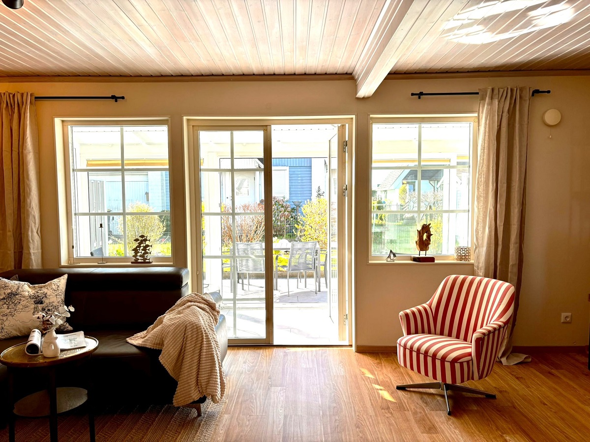 Helles Wohnzimmer mit Zugang zu Terrasse und GartenIm lichtdurchfluteten Erdgeschoss erwartet Sie ein großzügiges Wohnzimmer mit direktem Zugang zur Sonnenterrasse, offenen Wintergarten und dem sonnigen Garten in Südlage. Hier können Sie den Tag mit einem Frühstück im Freien beginnen oder den Abend entspannt ausklingen lassen.