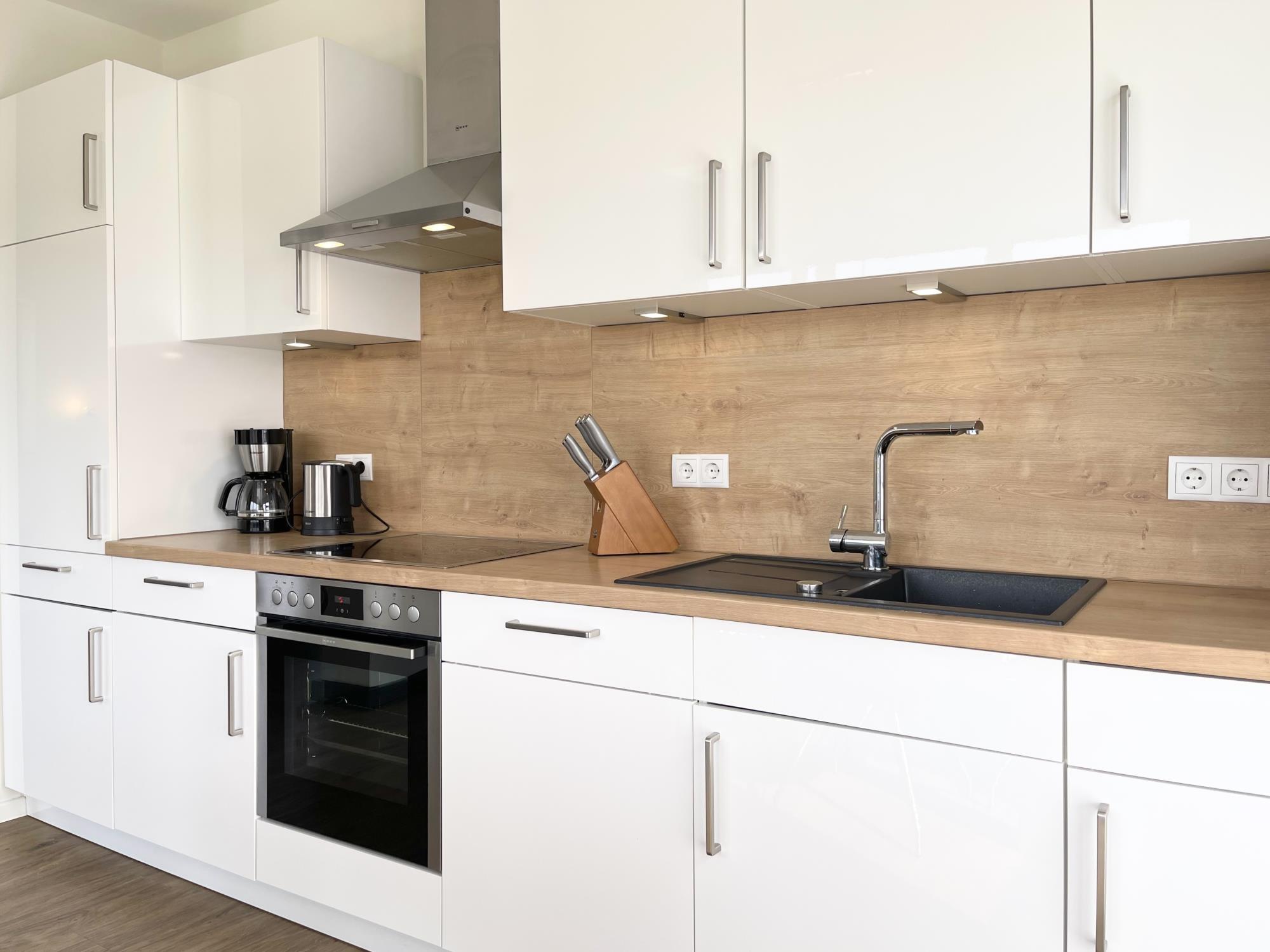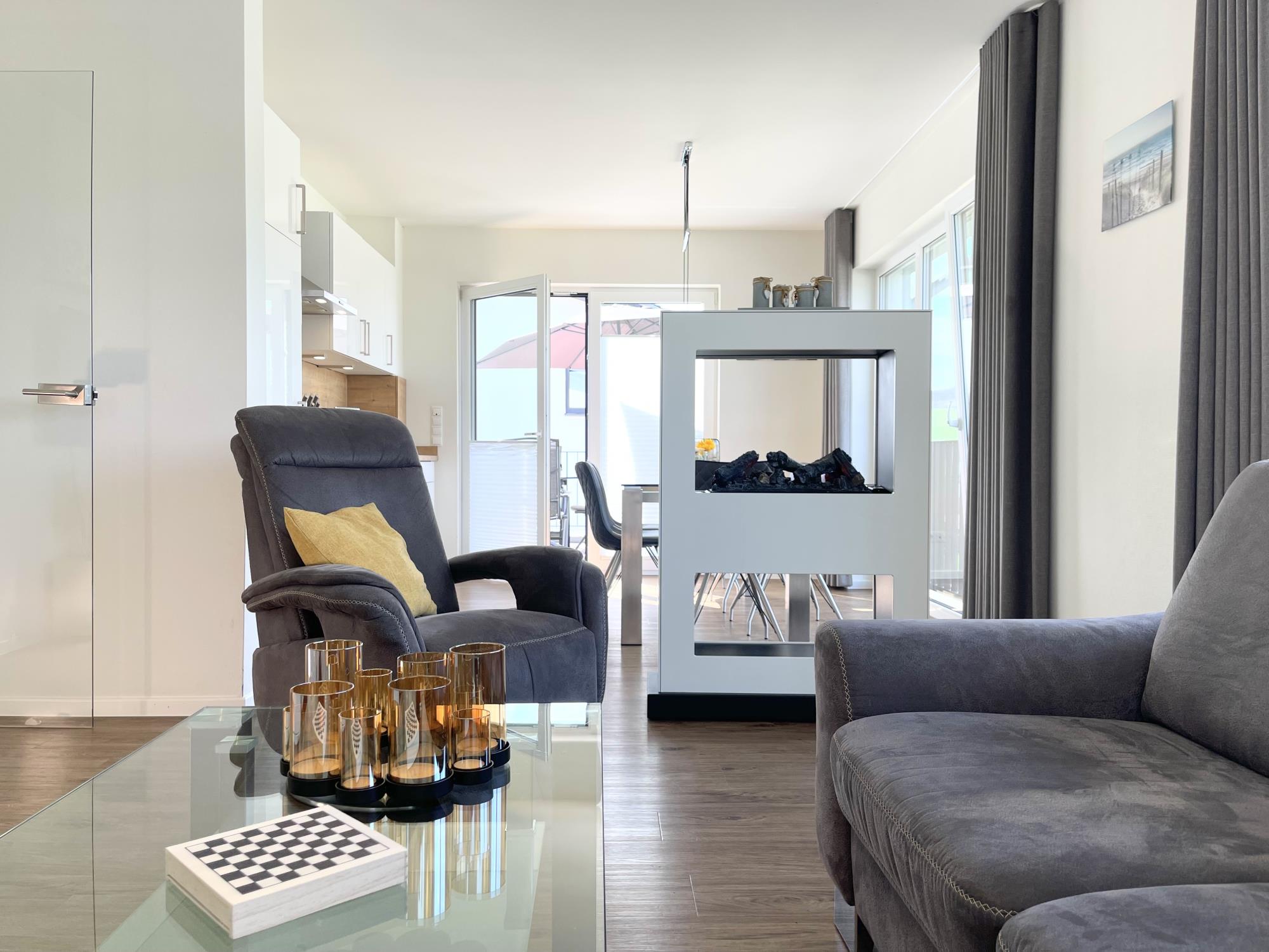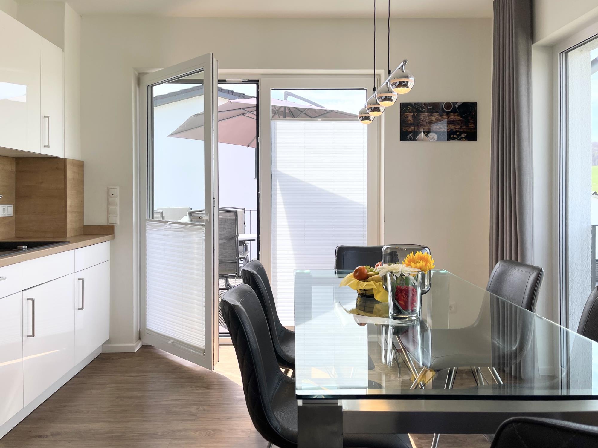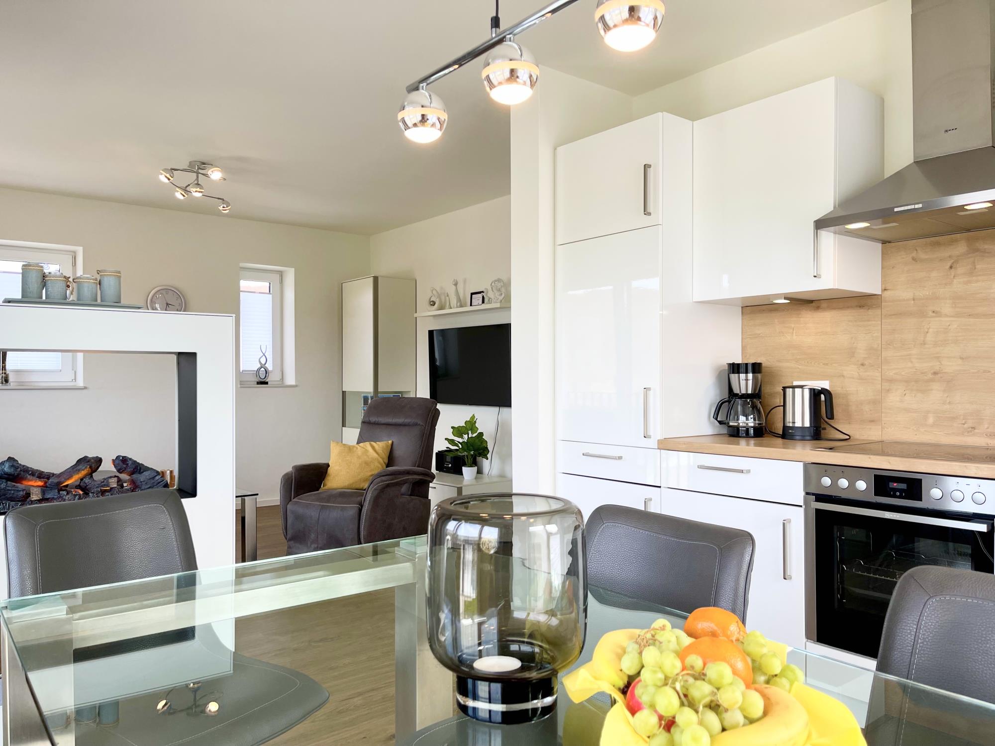 Der großzügige Wohn-/Essbereich mit offenem Küchenbereich und direkt angeschlossener Dachterrasse ist das Zentrum des schicken Ferienhauses.