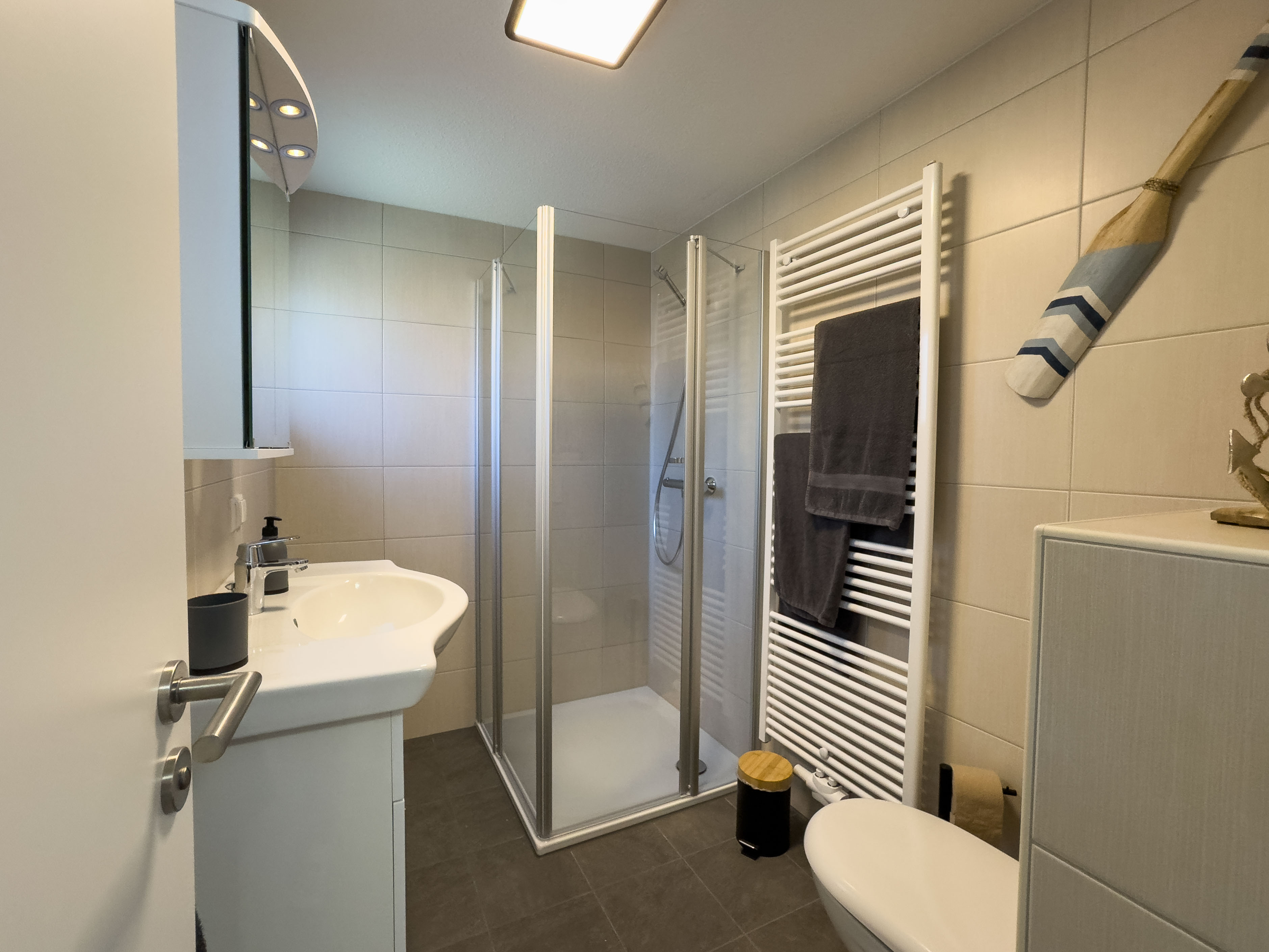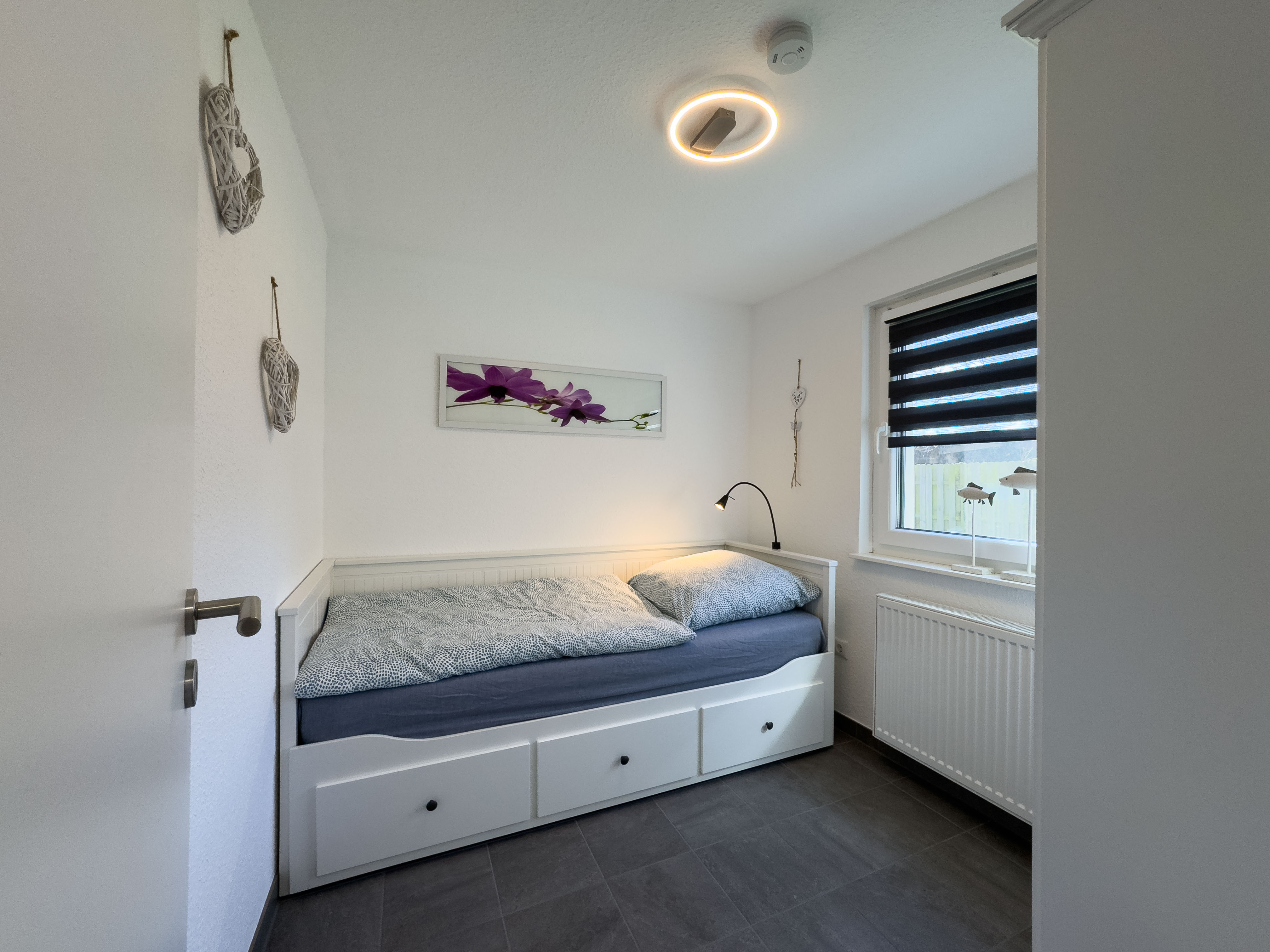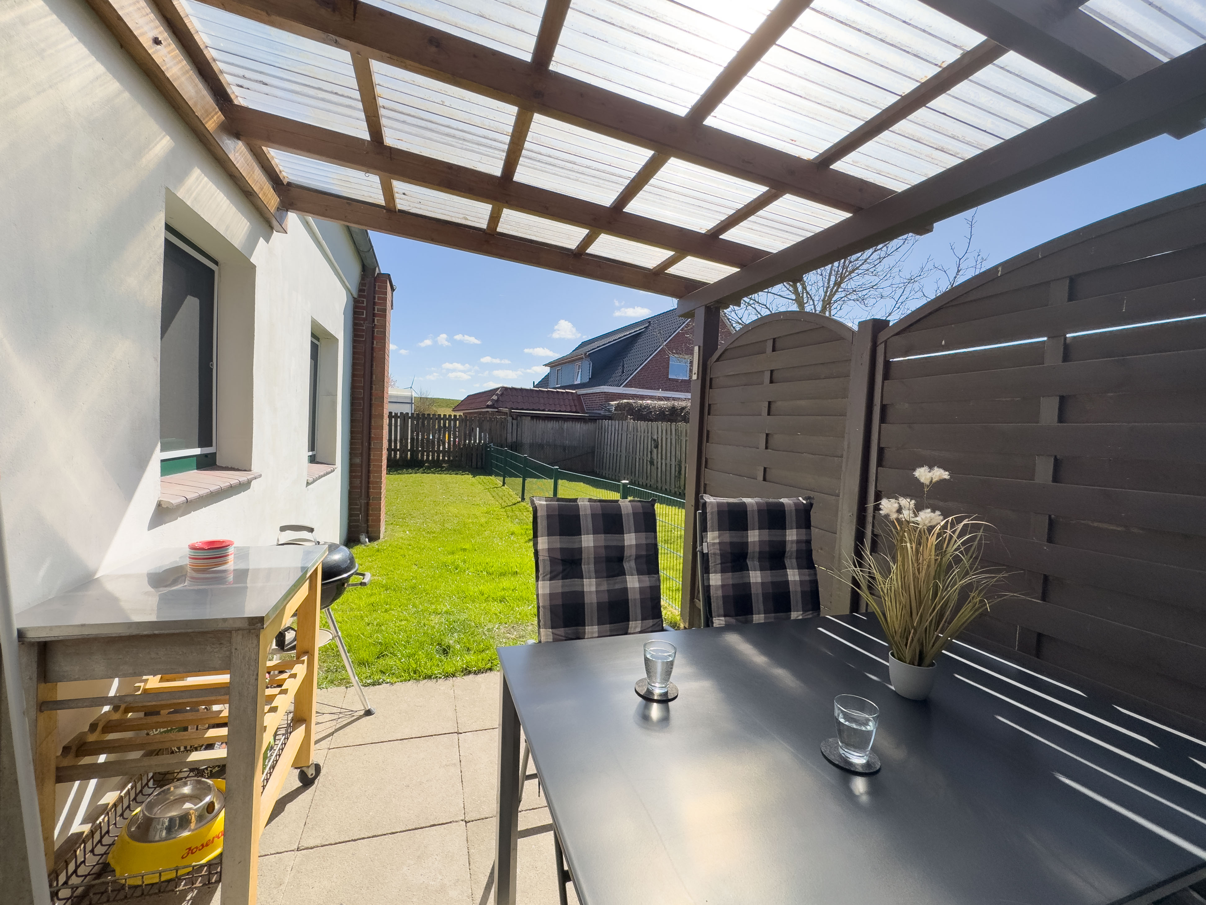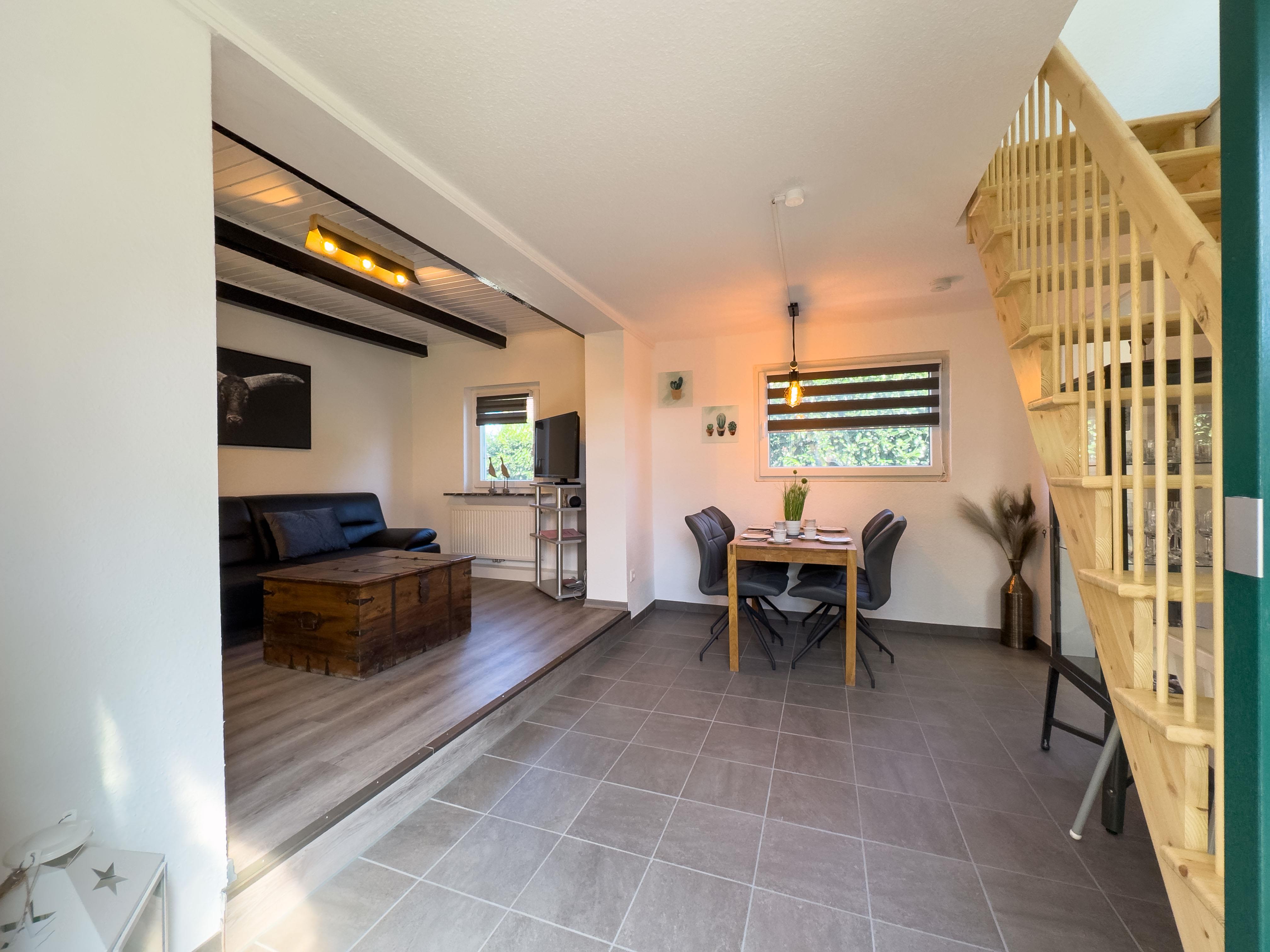 Im Erdgeschoss erwartet Sie ein heller Eingangsbereich, von dem aus Sie direkt in die gut ausgestattete Küche sowie in den offenen Wohn- und Essbereich gelangen. Ein gemütliches Sofa mit TV, ein Esstisch für vier Personen und der direkte Zugang zur überdachten Terrasse mit eingezäuntem Garten schaffen eine wohnliche Atmosphäre mit viel Freiraum. Ebenfalls im Erdgeschoss befindet sich ein Schlafzimmer mit ausziehbarem Einzelbett (nutzerfreundlich als Doppelbett) sowie ein modernes Badezimmer mit großer Dusche und WC.