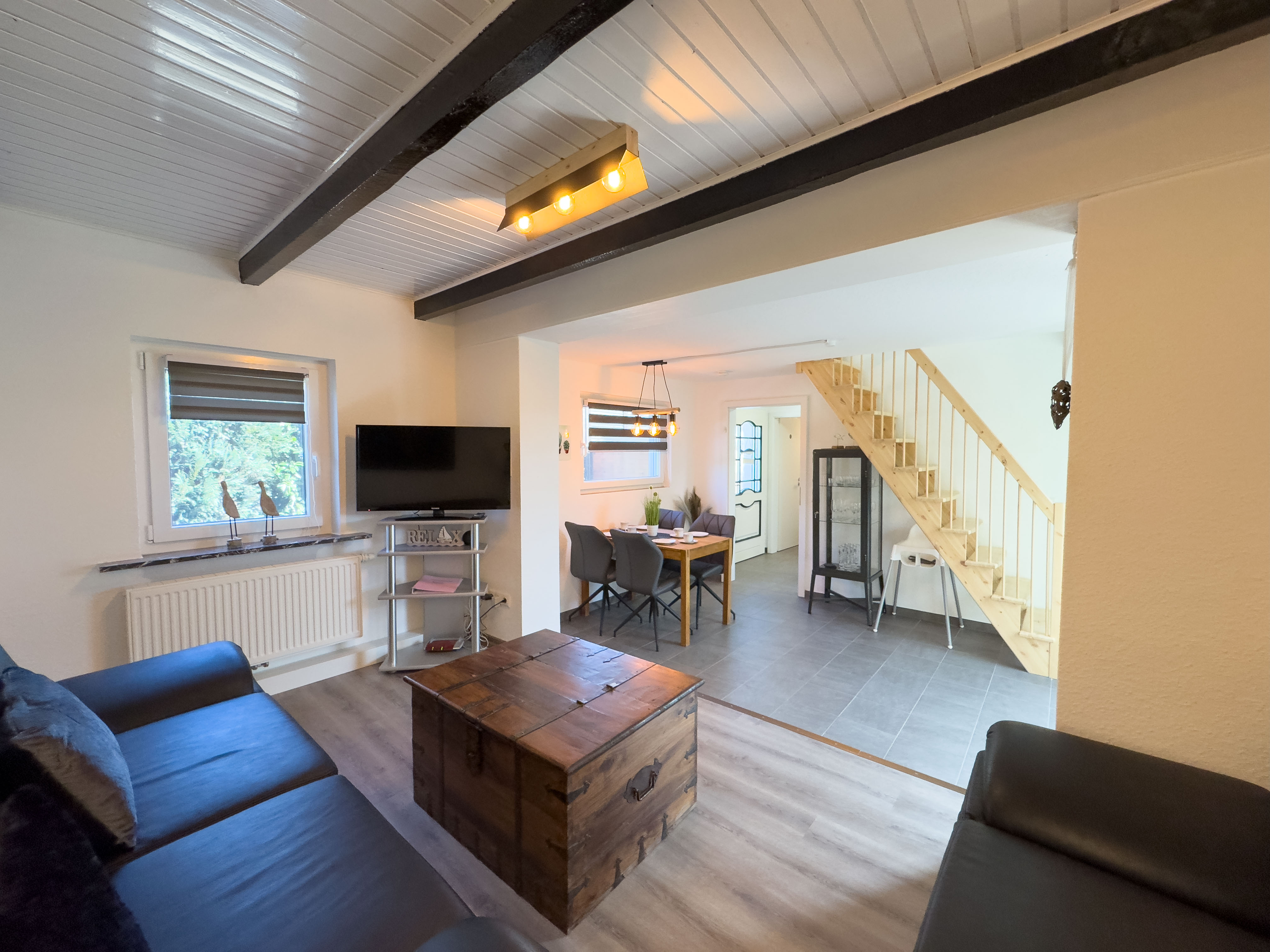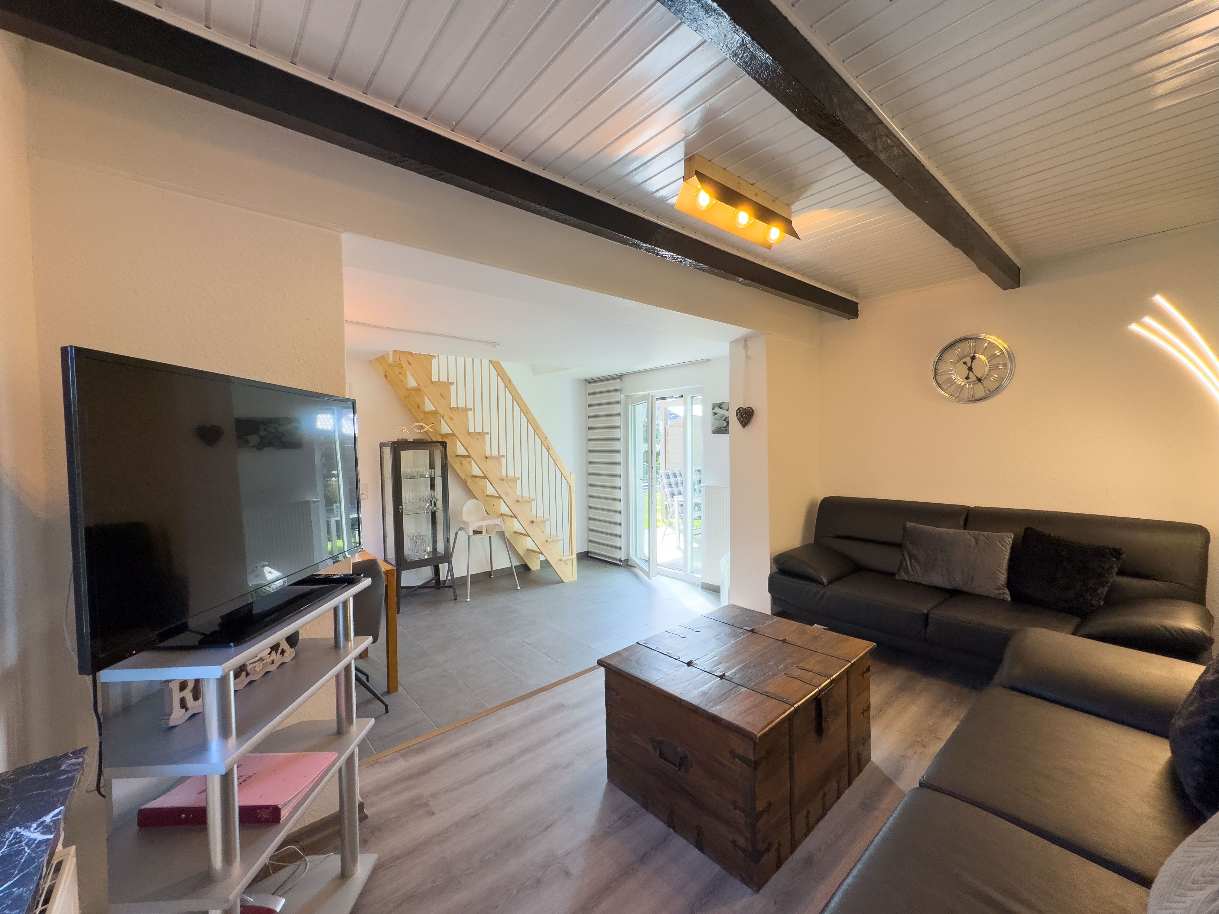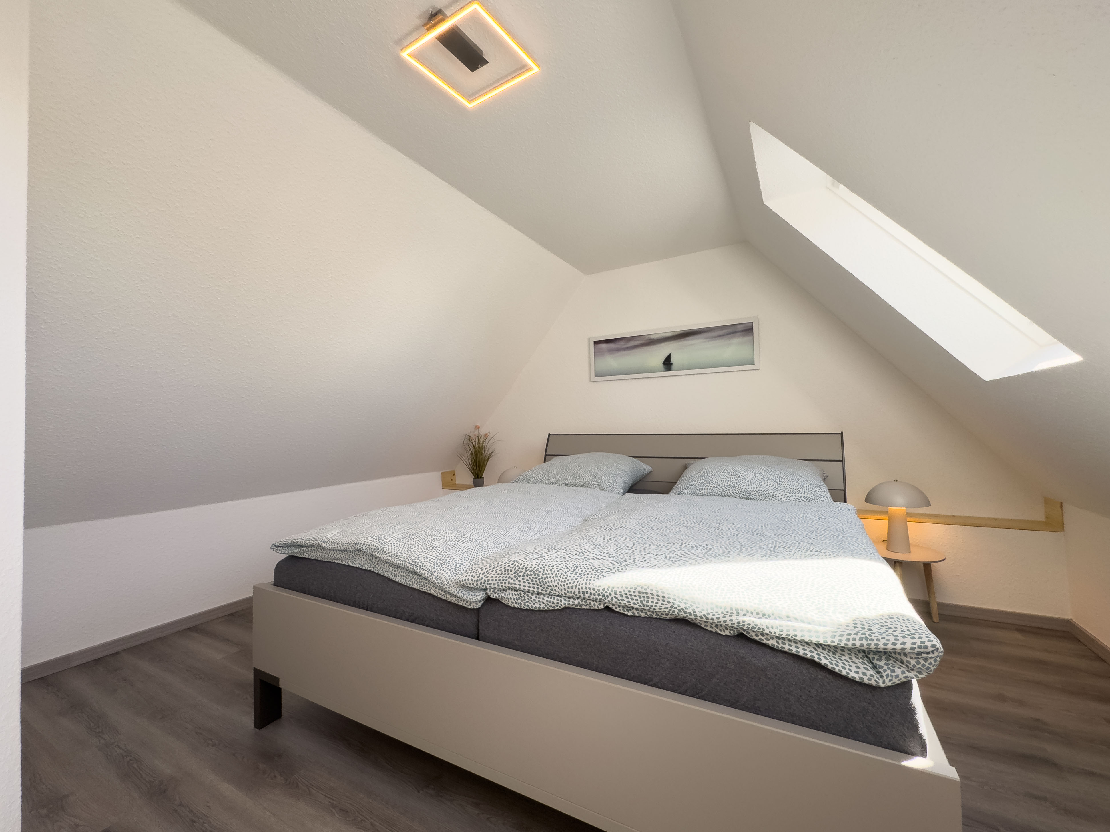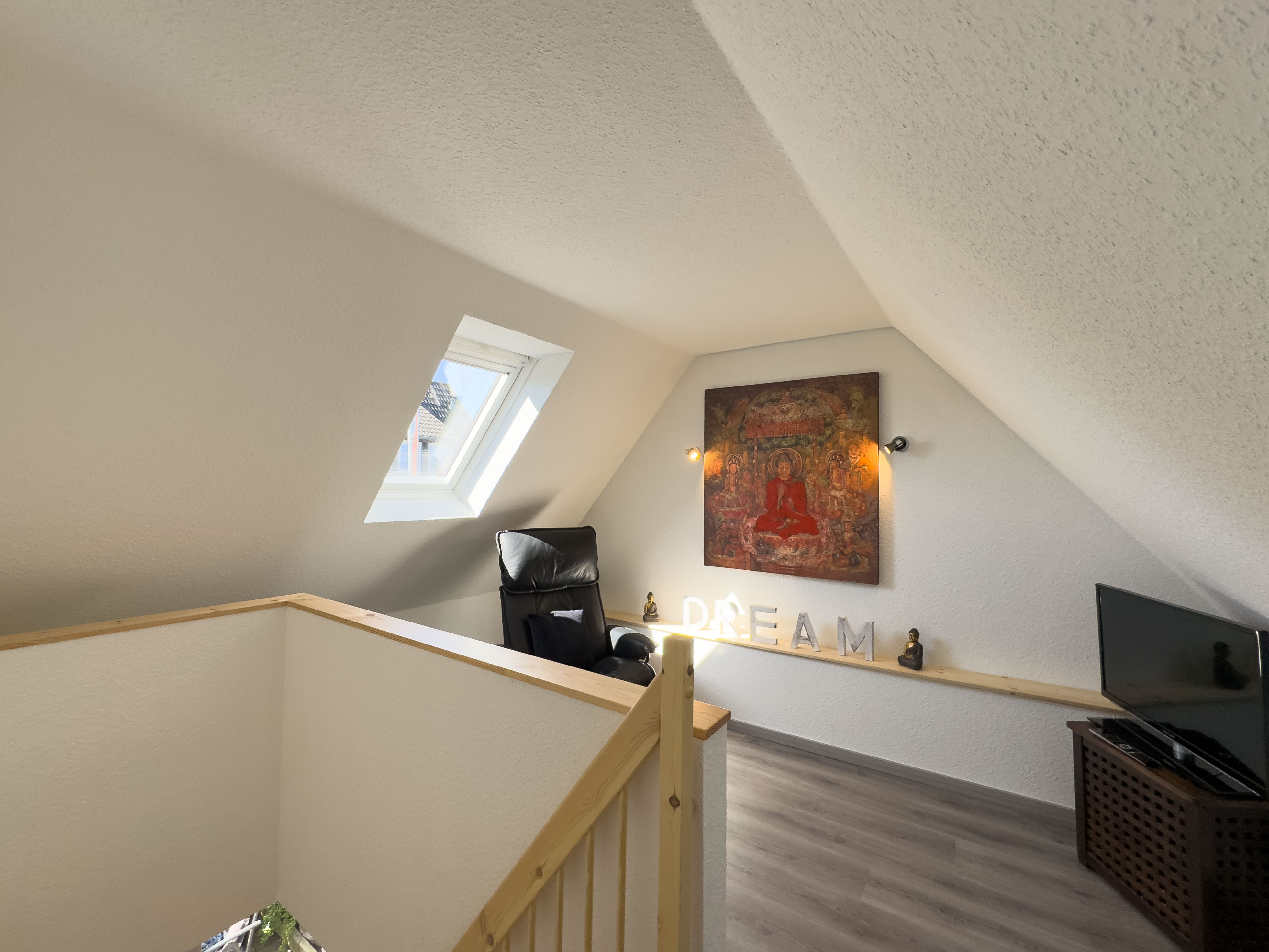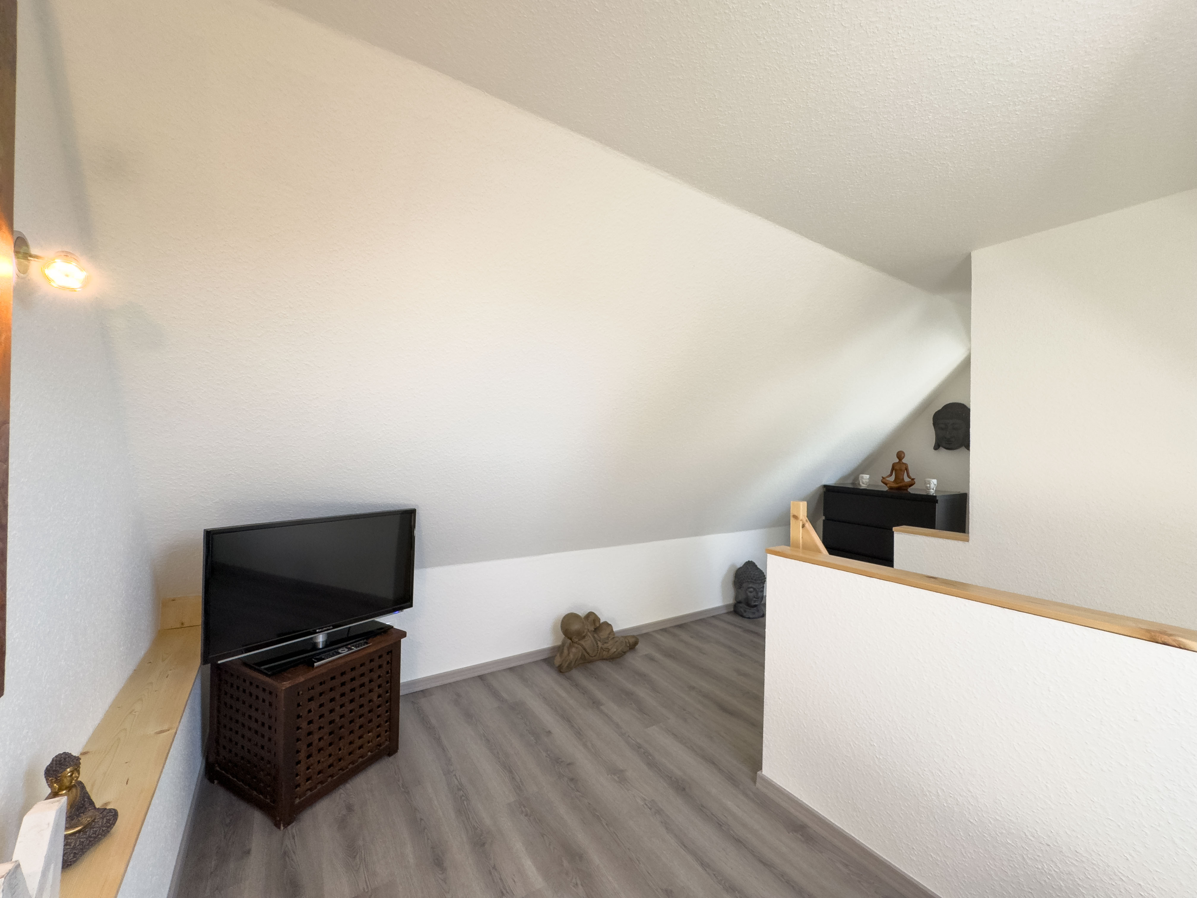 Über eine offene Holztreppe im Wohnzimmer erreichen Sie das Obergeschoss. Hier laden eine kleine Fernsehecke mit Relaxsessel sowie ein Schlafzimmer mit Doppelbett und Kleiderschrank zum Entspannen ein.