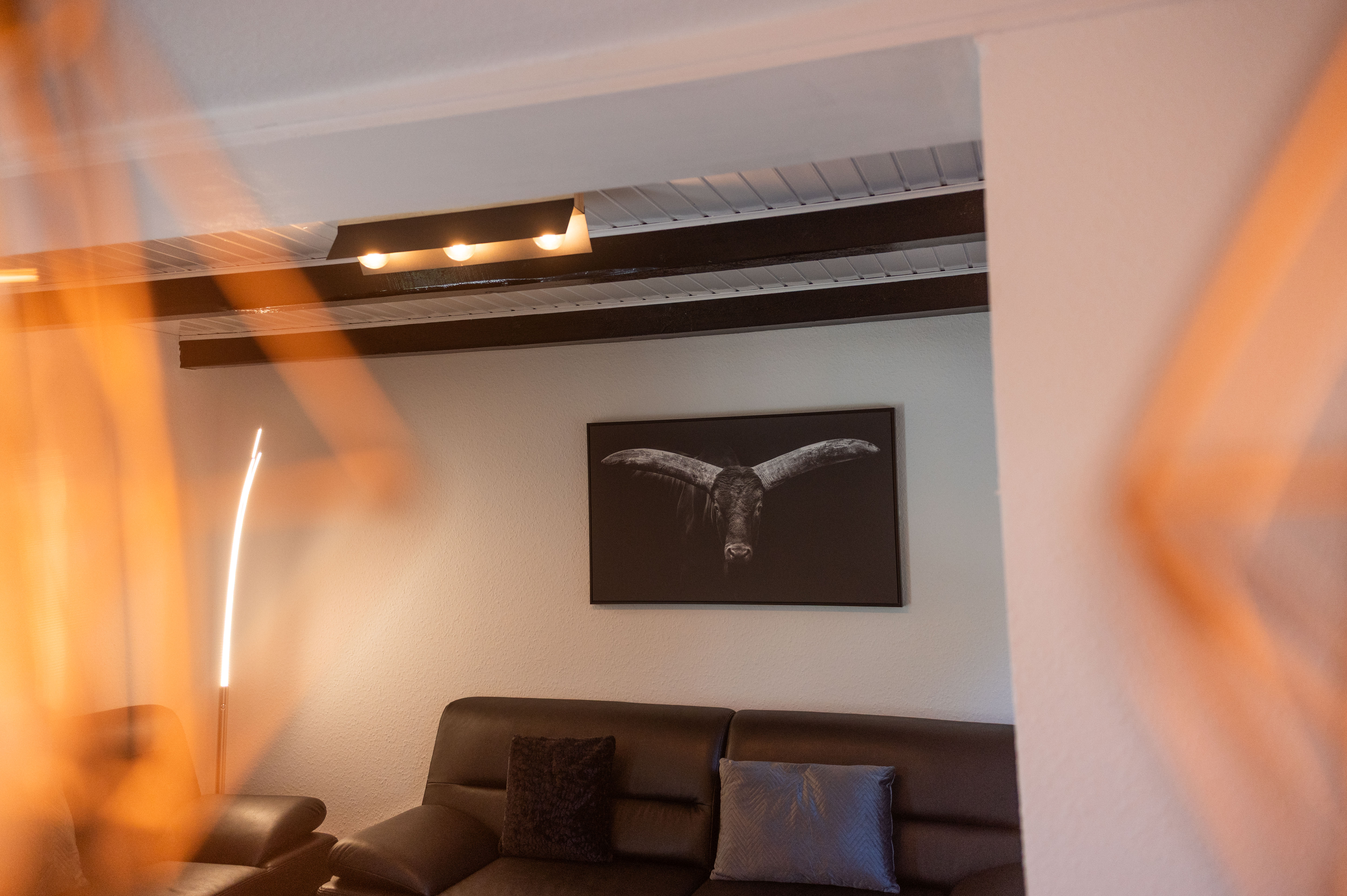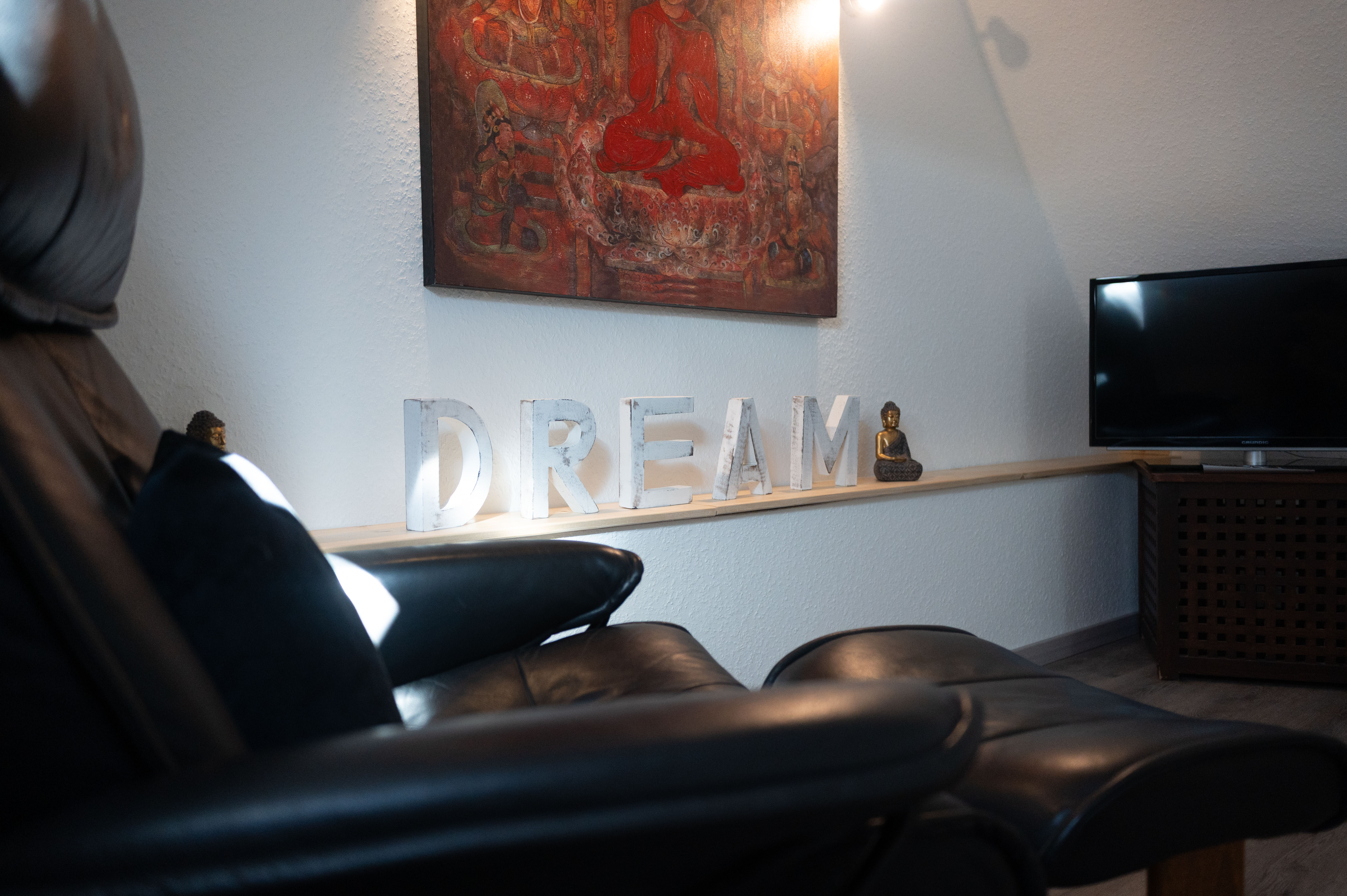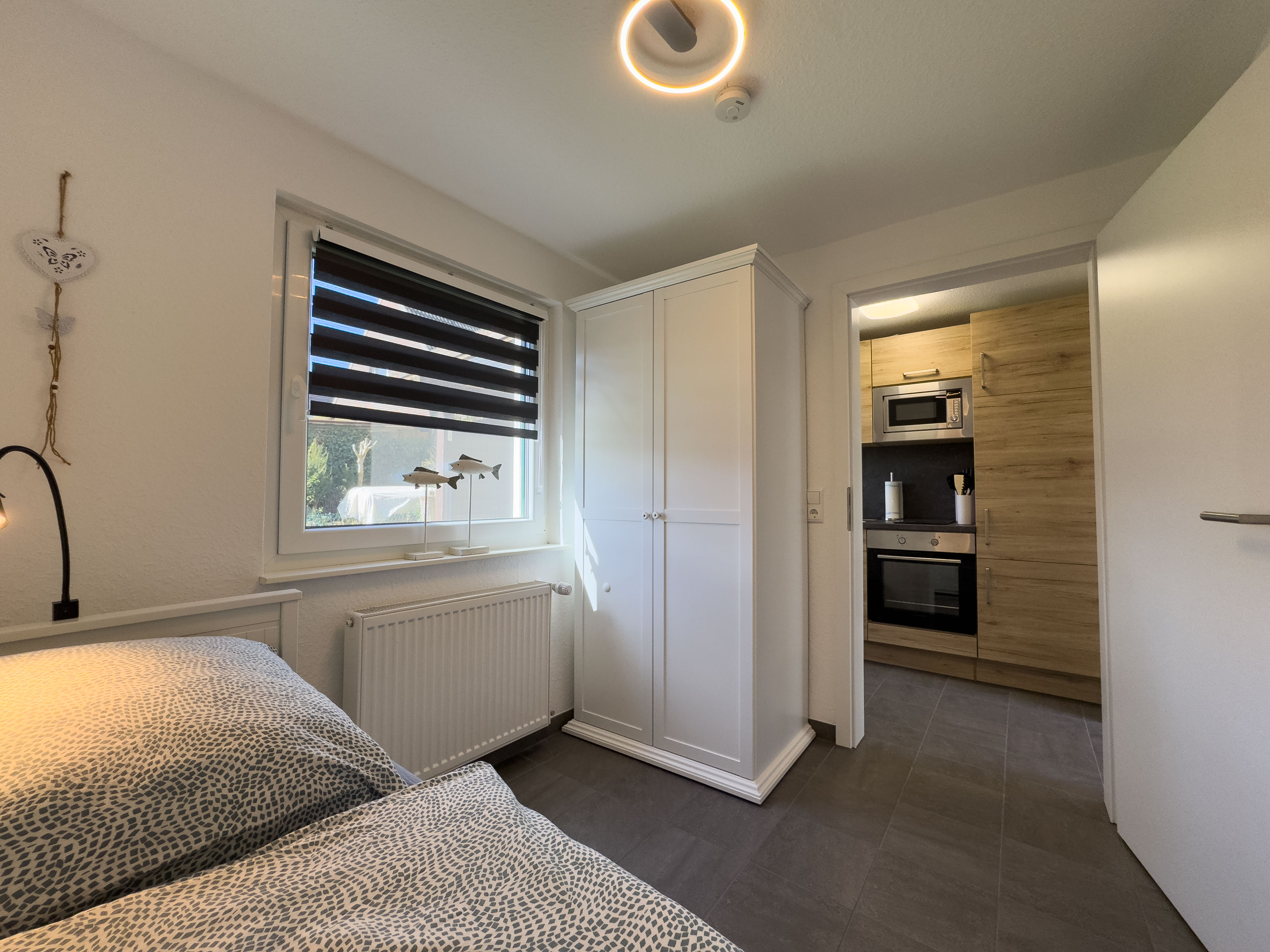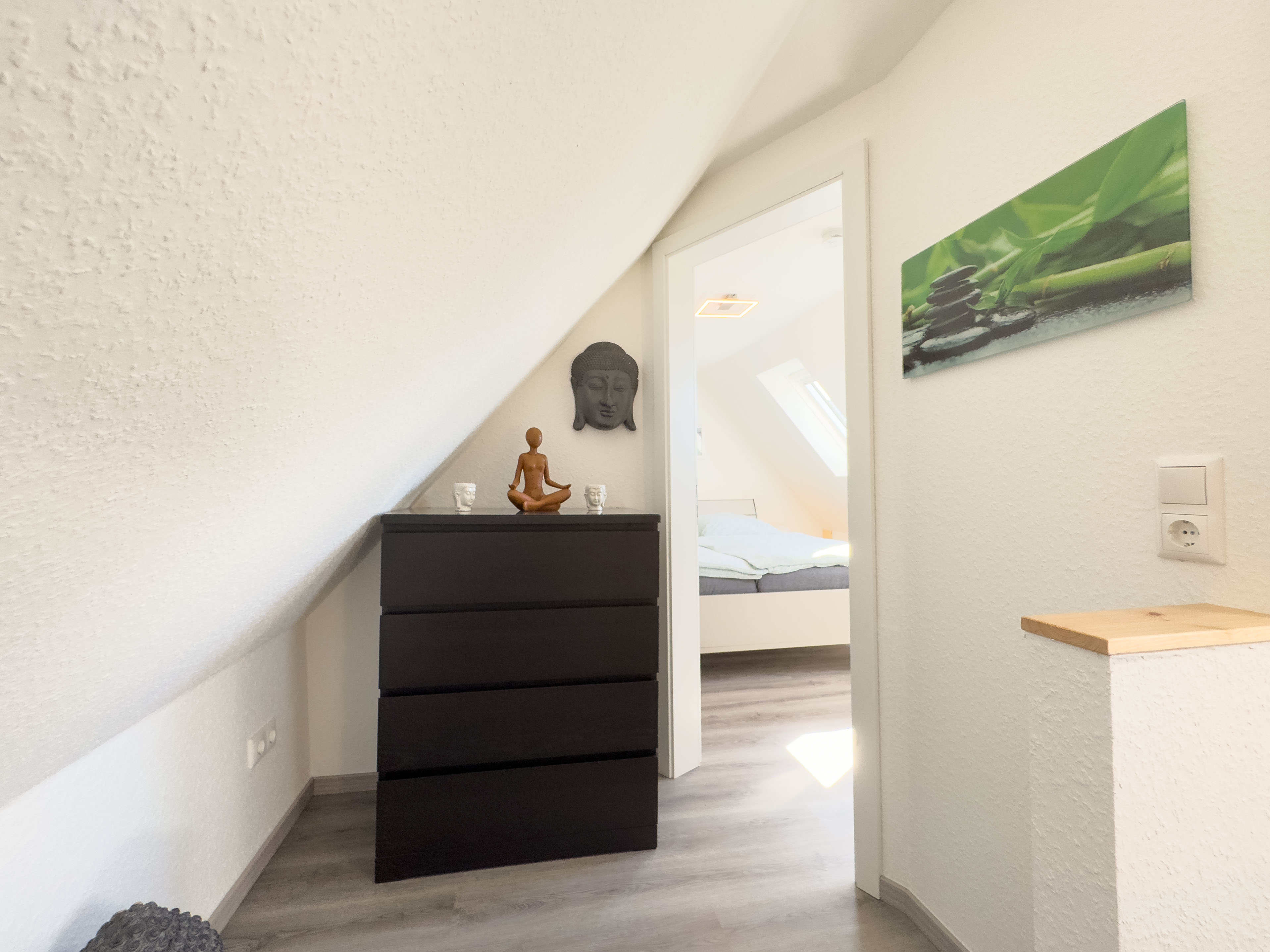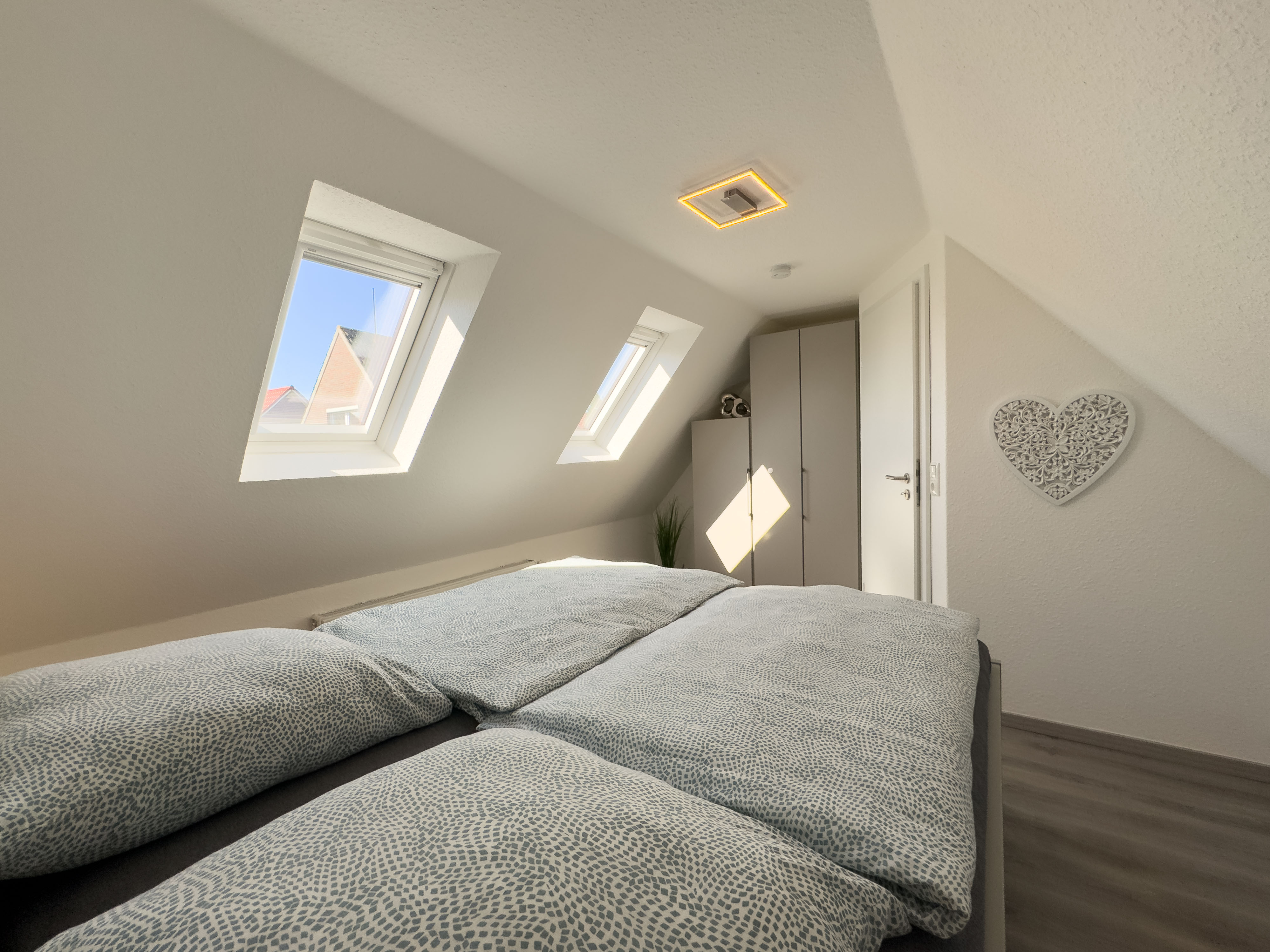 Über eine offene Holztreppe im Wohnzimmer erreichen Sie das Obergeschoss. Hier laden eine kleine Fernsehecke mit Relaxsessel sowie ein Schlafzimmer mit Doppelbett und Kleiderschrank zum Entspannen ein.