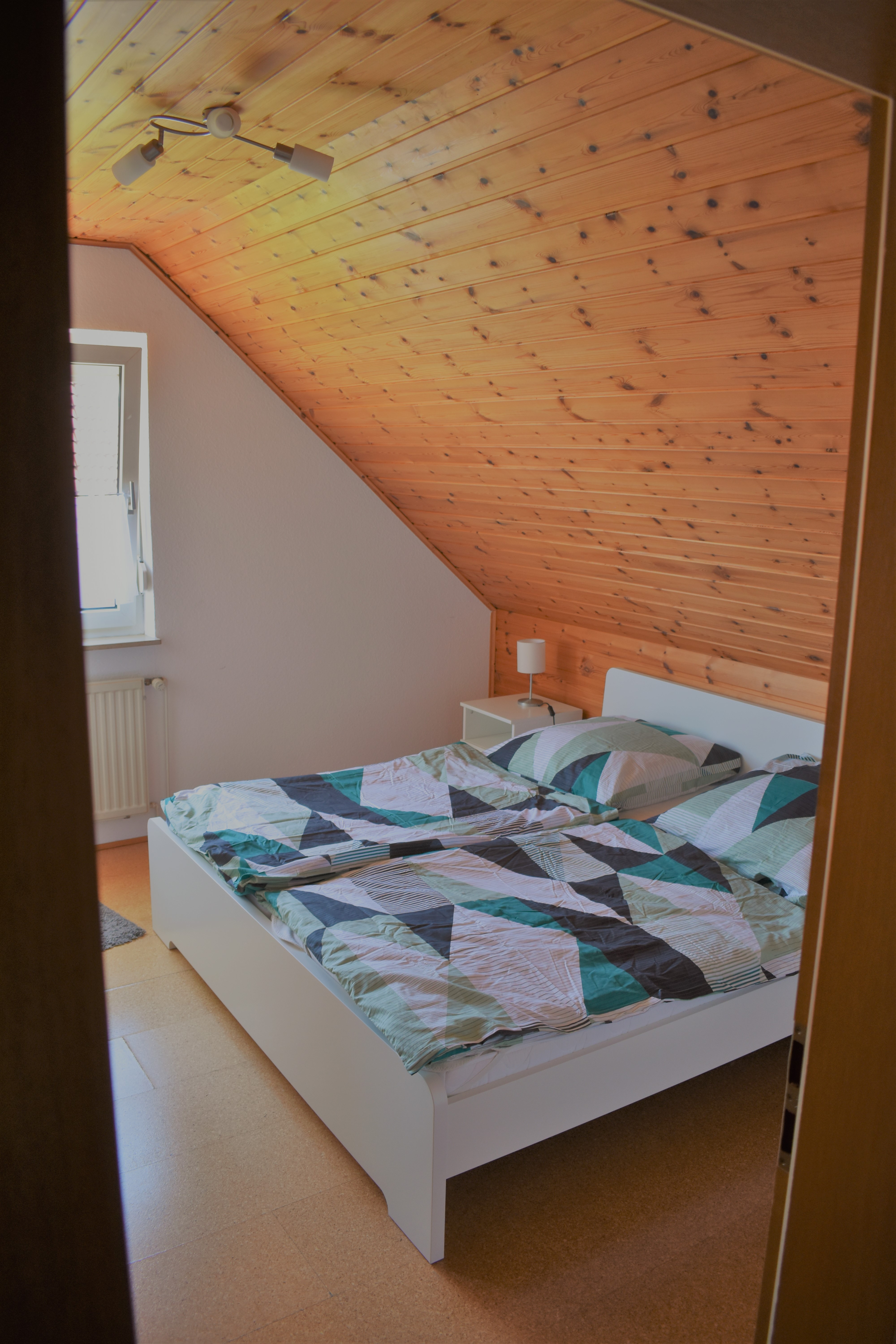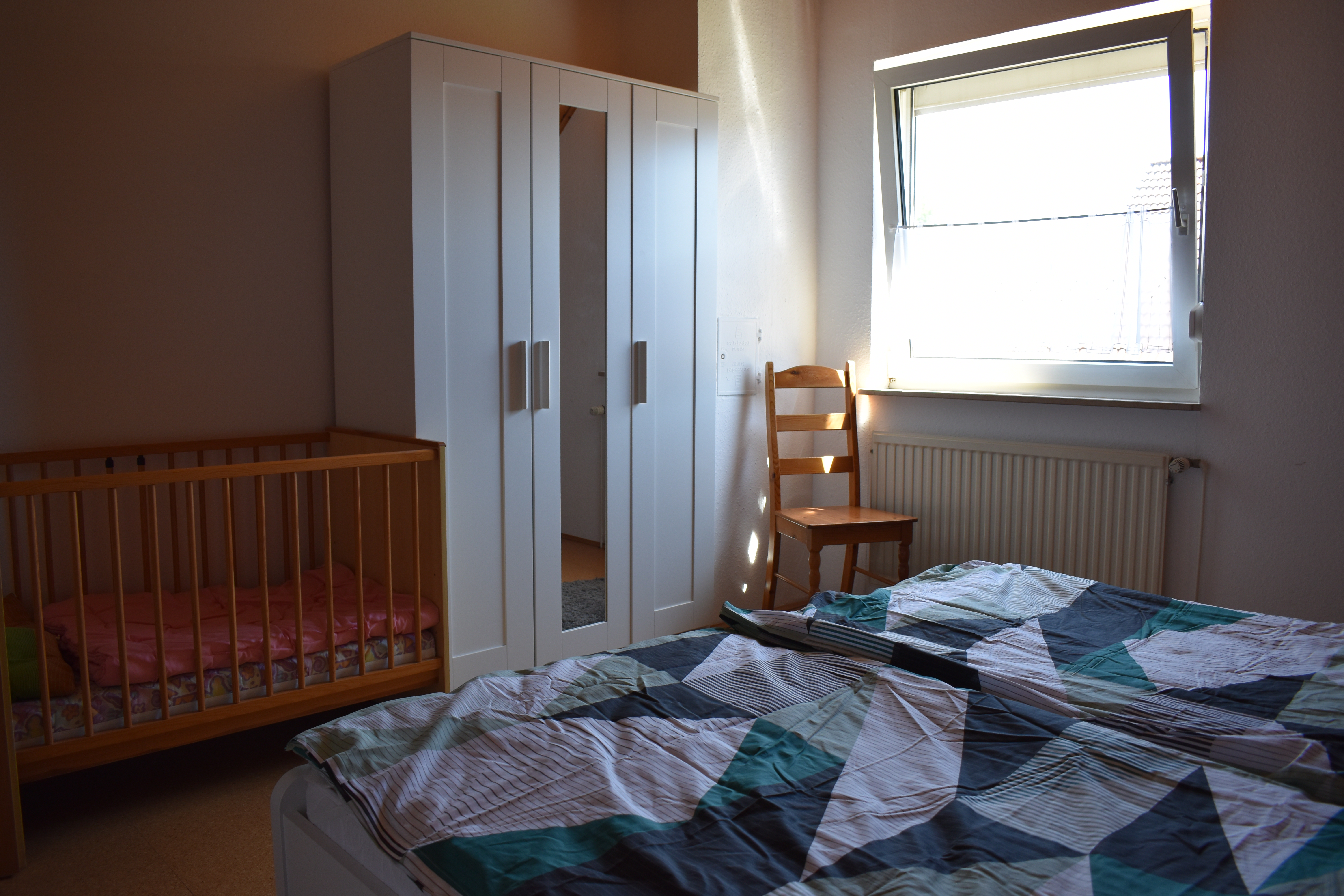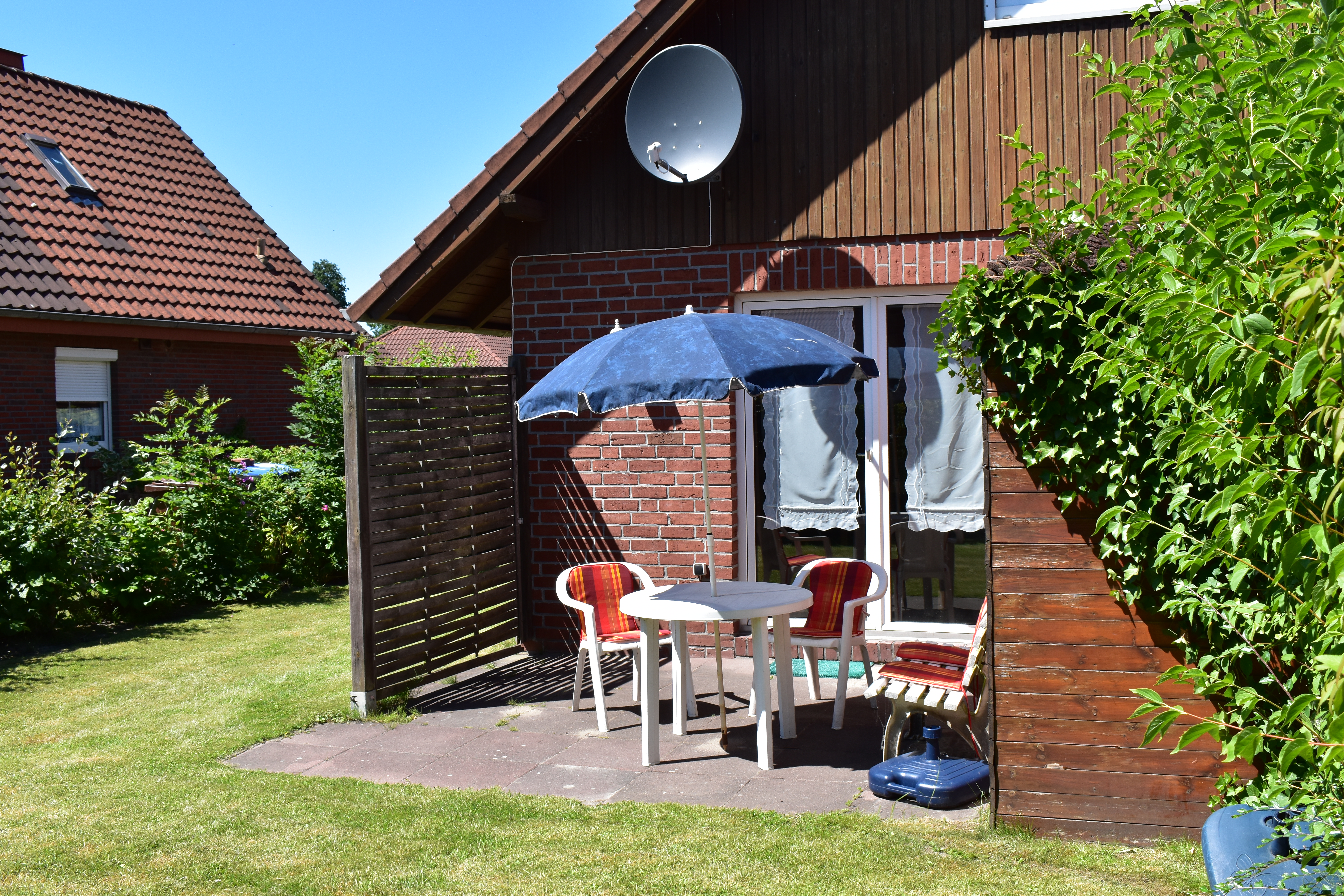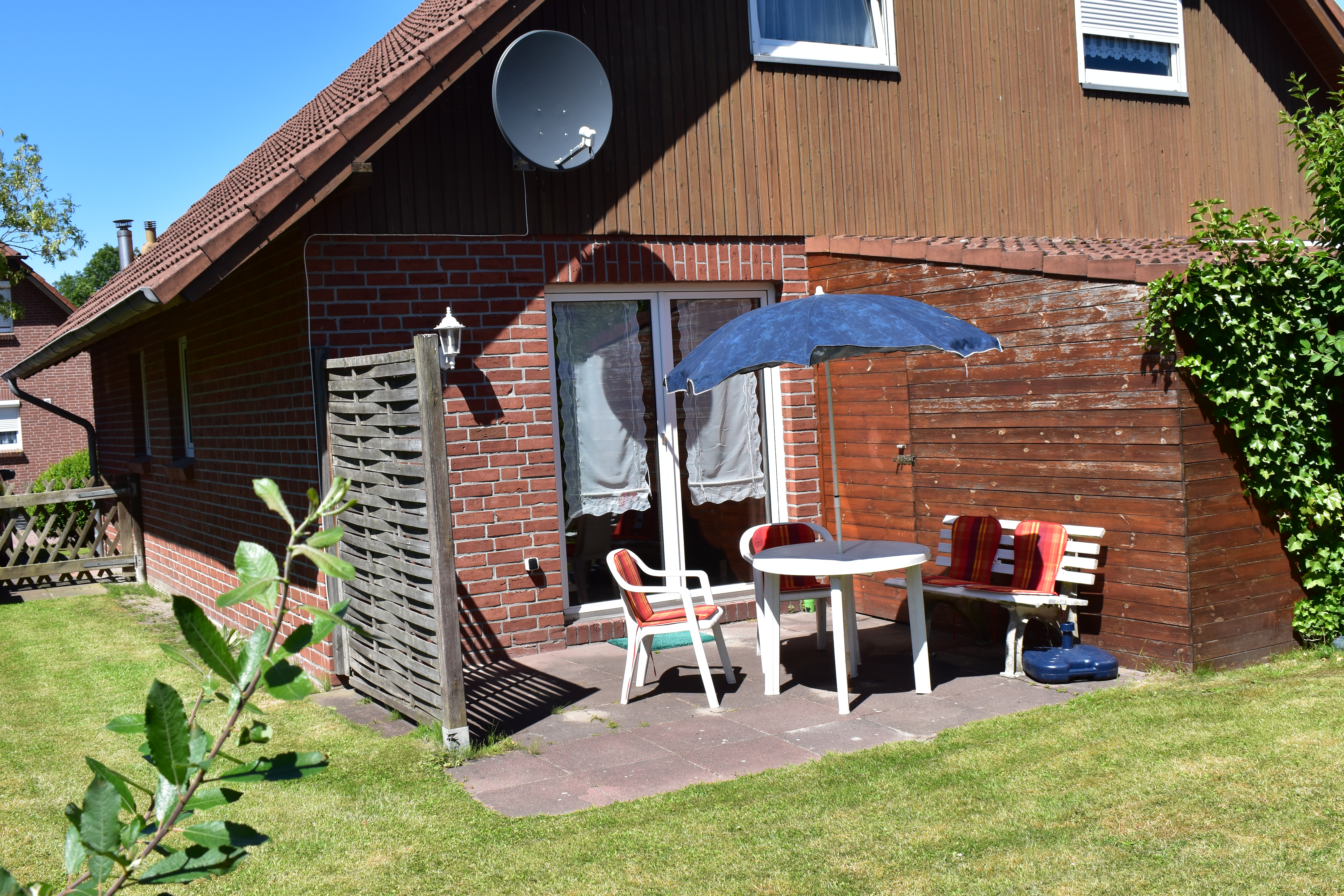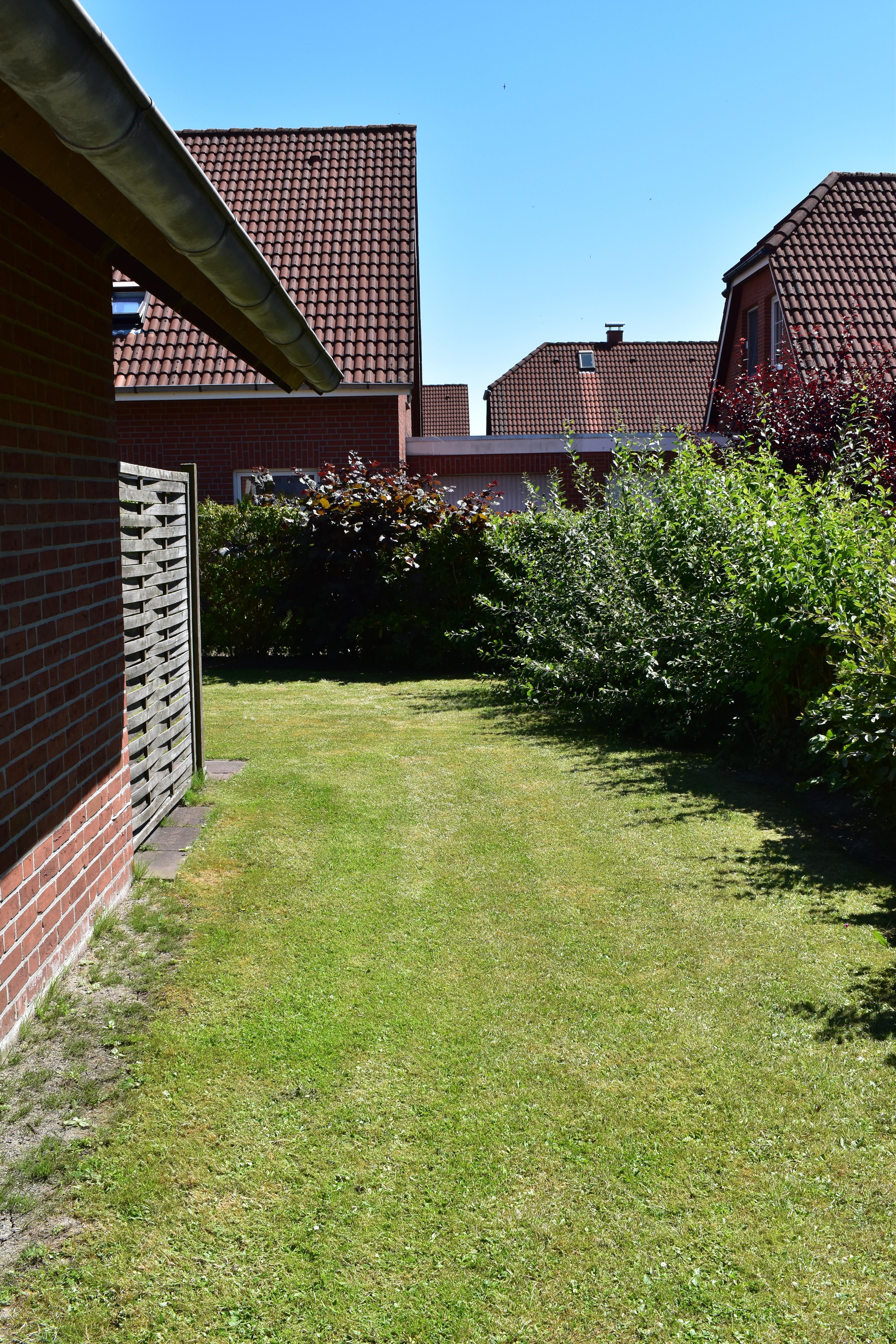 Durch die großen Fenster und die Glastür fällt viel Licht in den Raum und eröffnet den Blick auf die sonnige Südwest-Terrasse mit eingezäuntem Garten – ideal zum Entspannen im Freien. Im Obergeschoss befinden sich zwei komfortable Schlafzimmer, die Ruhe und Erholung versprechen.