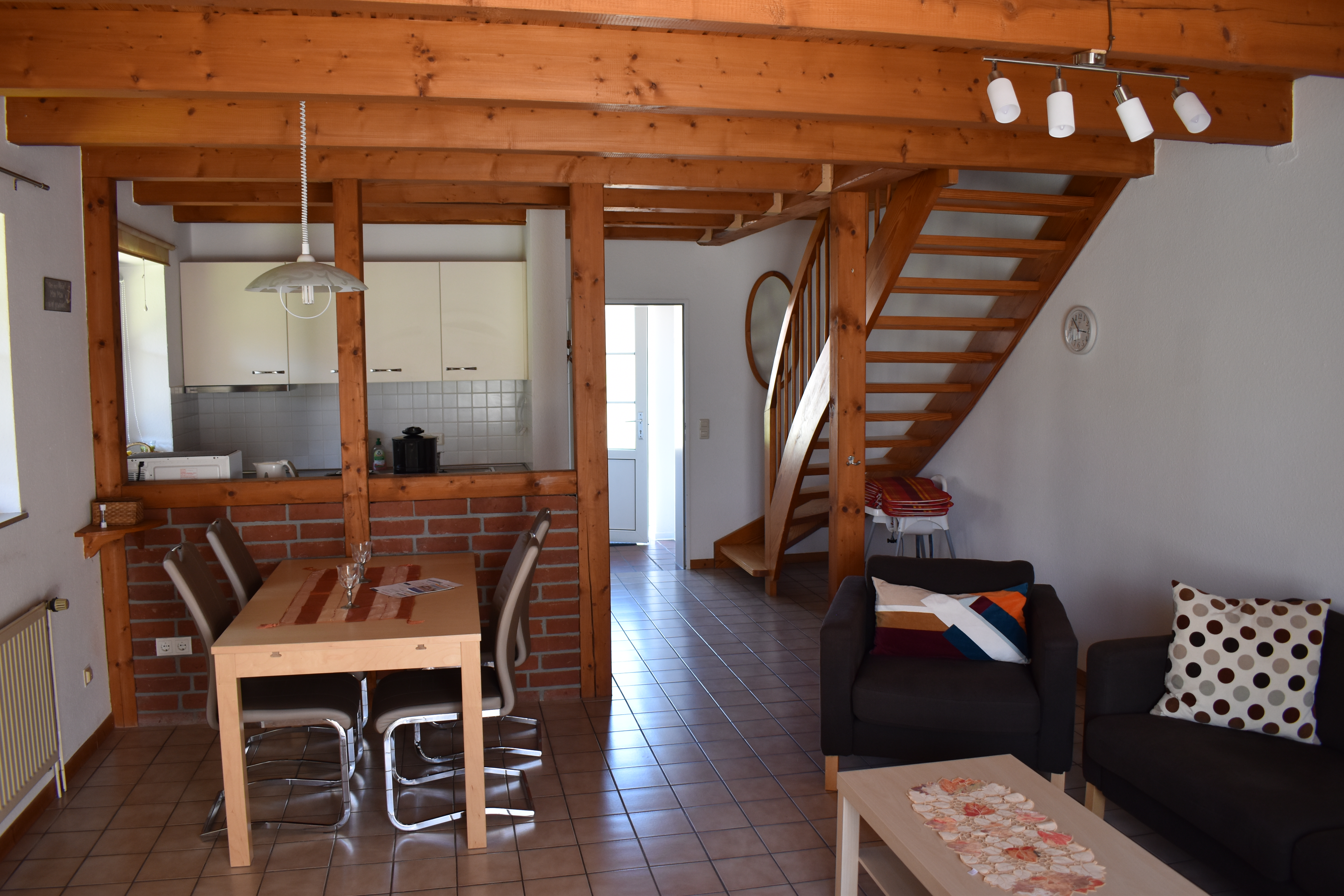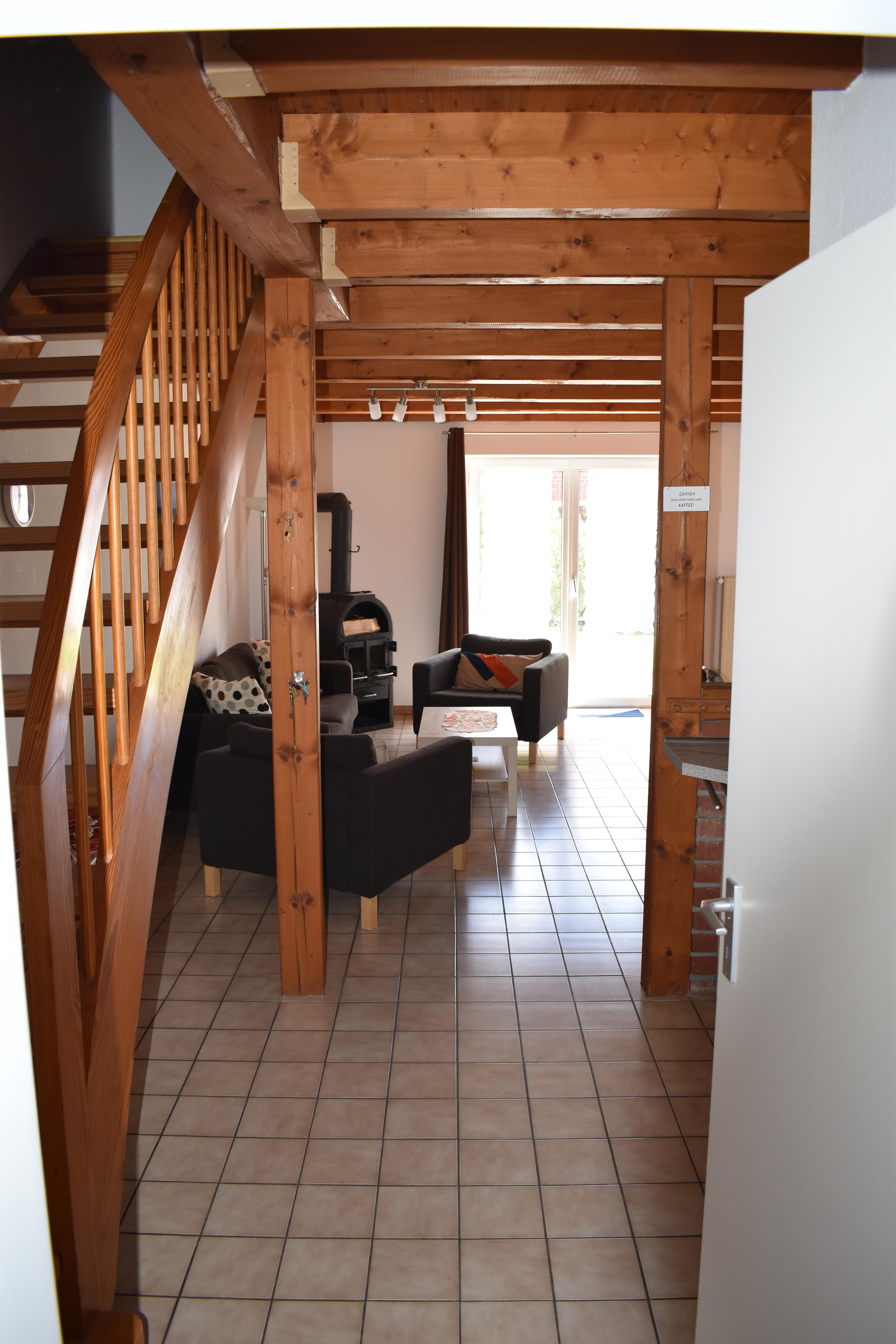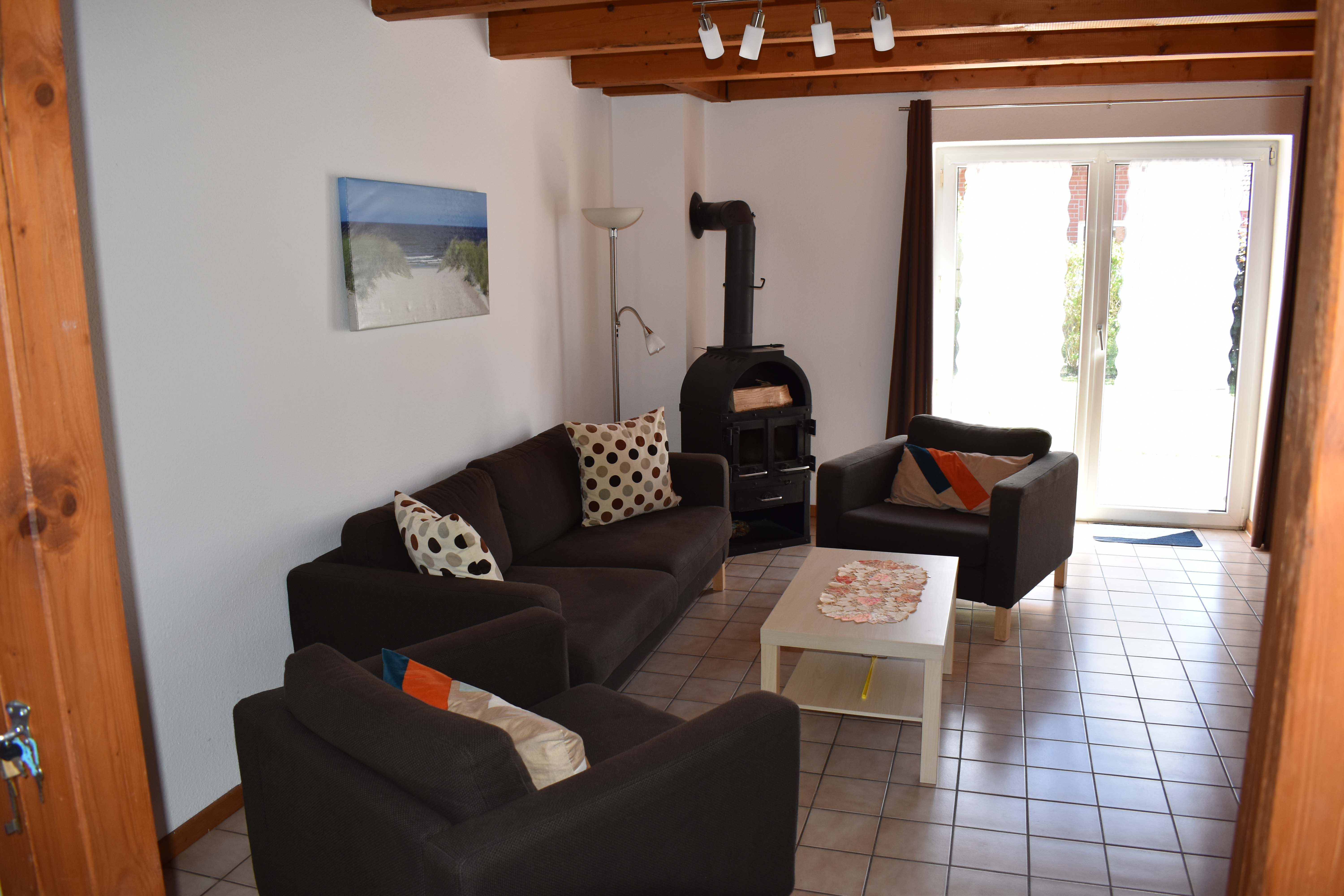 Der Wohnbereich ist hell und modern gestaltet – mit gemütlicher Couch, Sesseln, einem stilvollen Esstisch und liebevoll gewählten Accessoires zum Wohlfühlen. Für Unterhaltung sorgen SAT-TV und Hifi-Anlage, während der Kanonenofen neben der Zentralheizung für besondere Behaglichkeit sorgt.