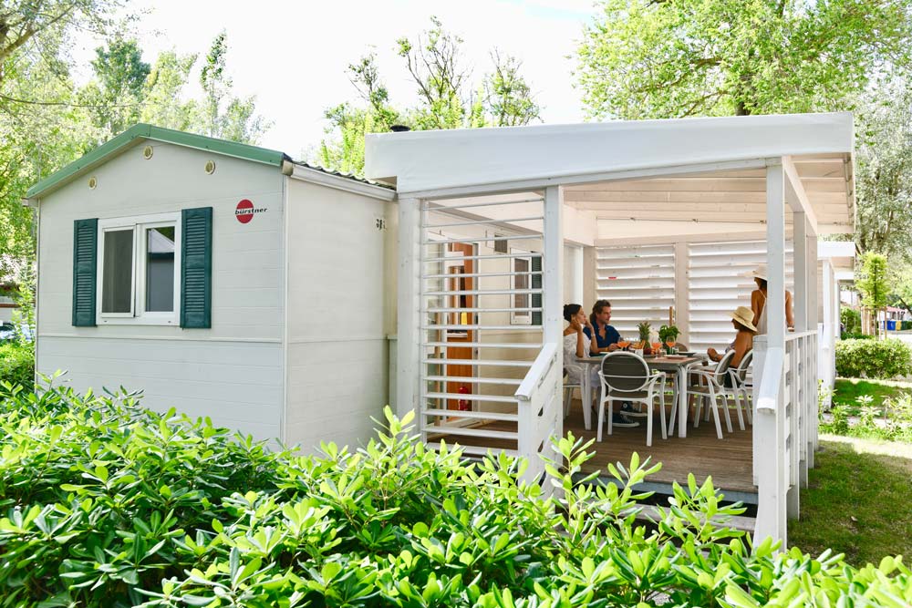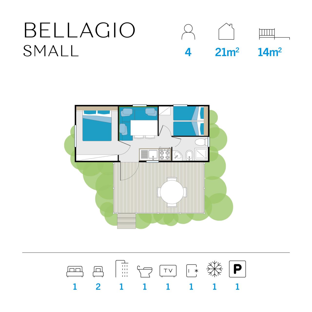 Das Mobilehome Bellagio Small ist für 4 Personen geeignet. Es gibt ein Schlafzimmer mit einem Doppelbett, sowie ein weiteres Schlafzimmer mit zwei Einzelbetten. Das Badezimmer verfügt über Dusche, WC, Bidet und ein Waschbecken. Die offene Küche mit Tisch und Eckbank verfügt über einen 4-Flammen-Gasherd, Töpfe, Geschirr, Besteck, und einen Kühlschrank. Die grosszügige, möblierte und überdachte Terrasse lädt zum Entspannen ein. Die Fahrzeit ab italienischer Grenze dauert ca. 3h. Hinweis: Wenn Sie mehr als eine Unterkunft benötigen, ist dies bei uns in der Regel möglich, da wir über mehrere Objekte des gleichen Haustyps verfügen.