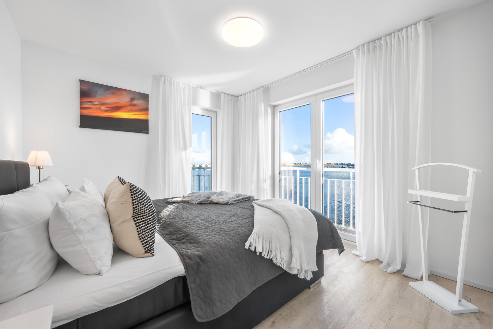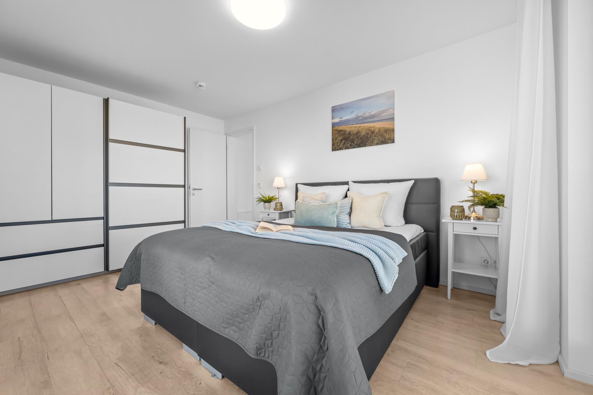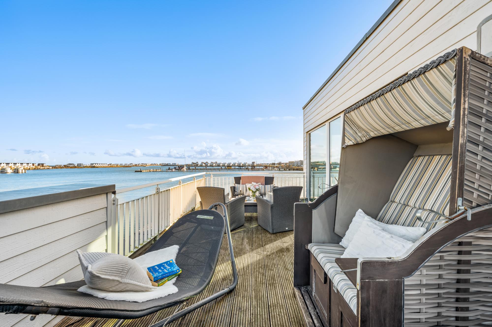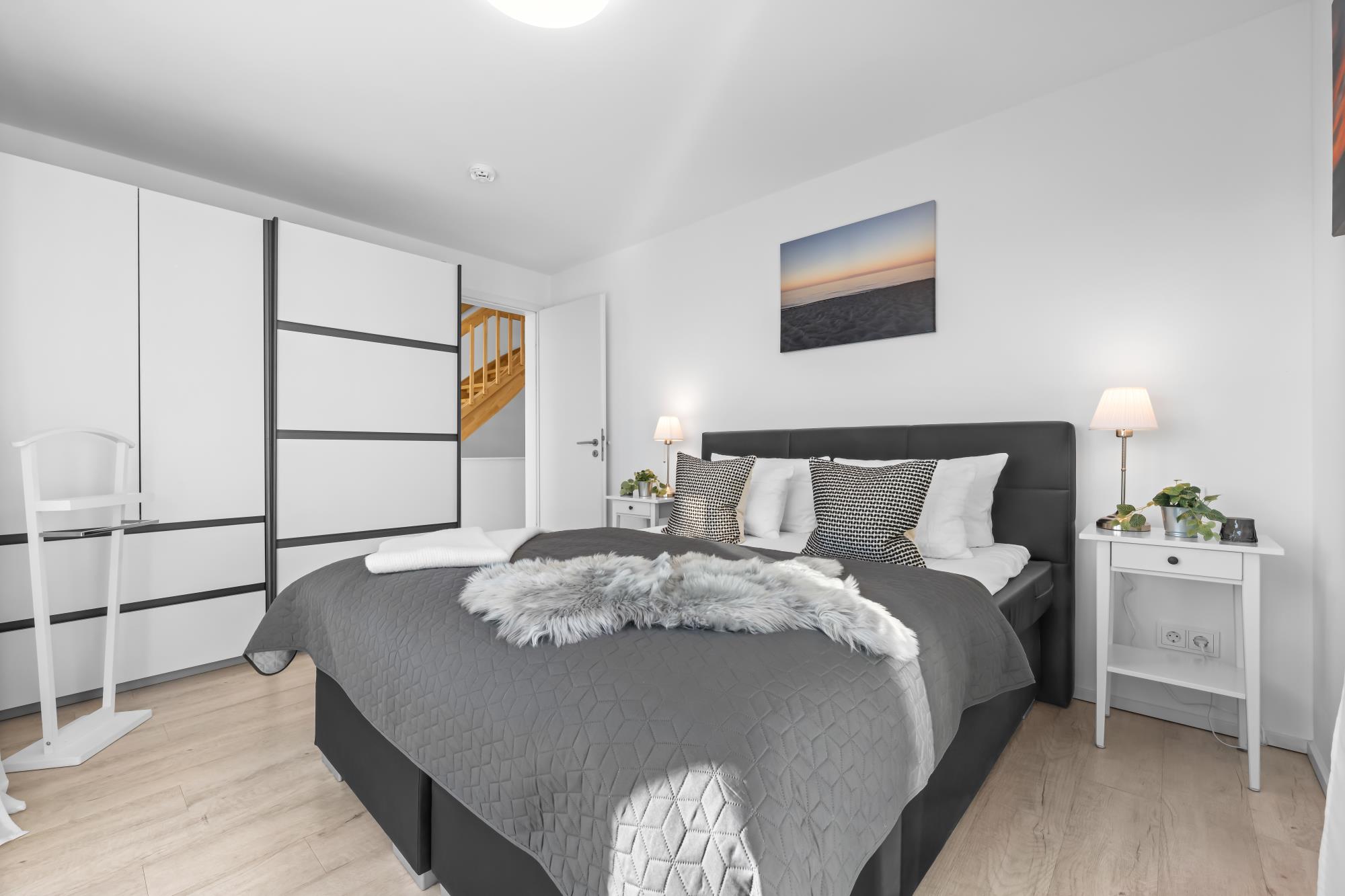 Im Obergeschoss befinden sich zwei große Schlafzimmer mit Doppel-Boxspringbetten (160 x 200 cm) in guter Qualität sowie ein vollwertiges Bad mit Whirpoolwanne. Das Hauptschlafzimmer ist zum Hafen hin ausgerichtet und punktet mit einem phänomenalen Wasserblick.