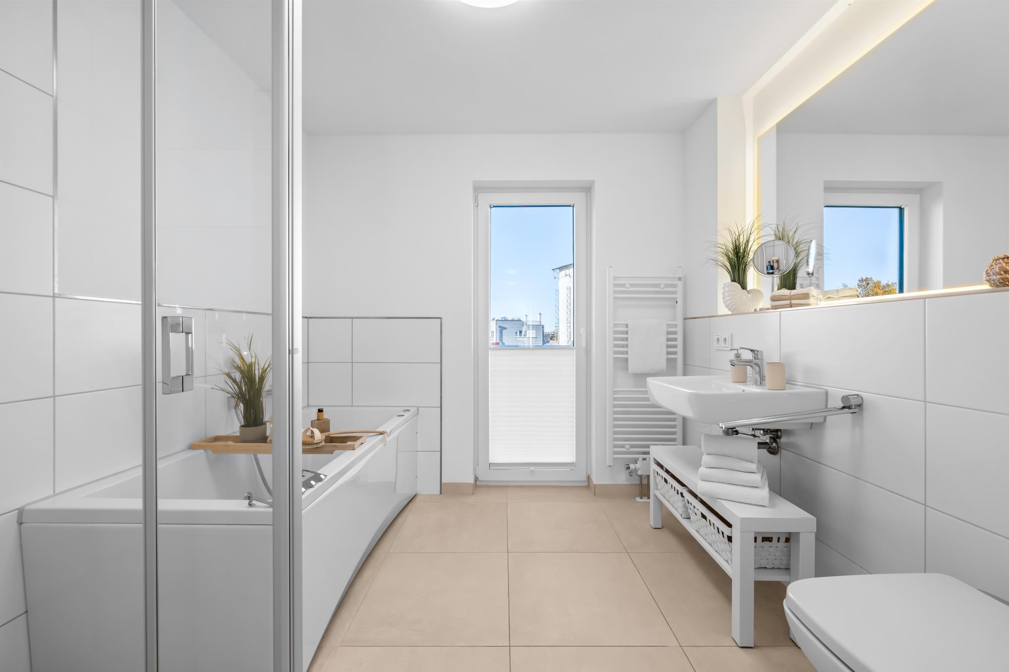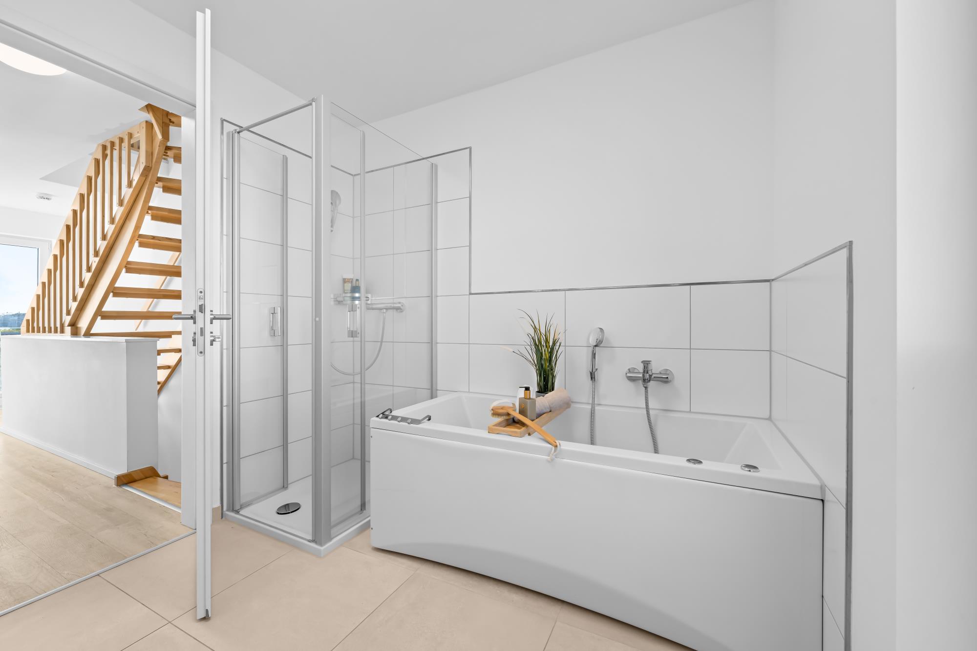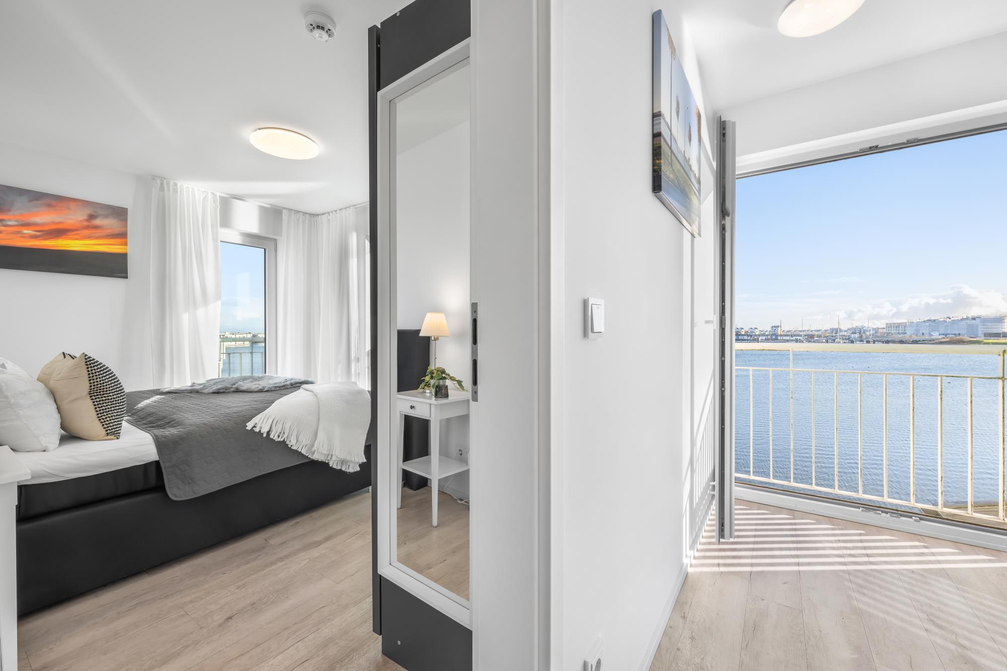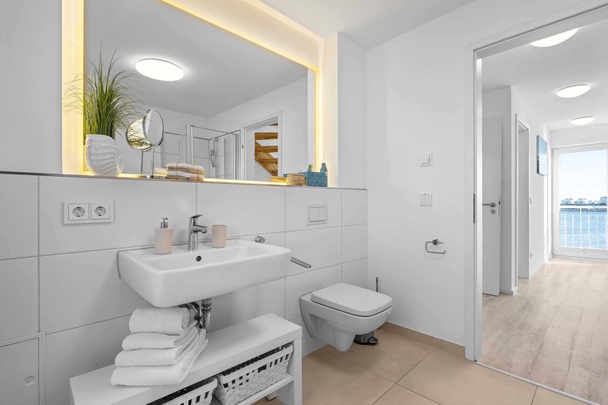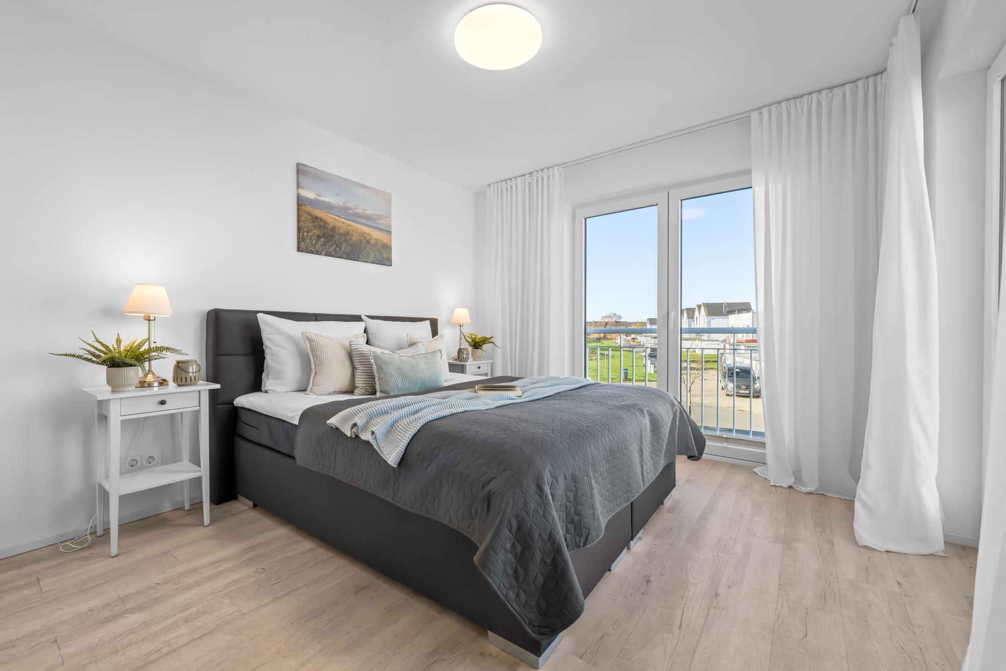 Im Obergeschoss befinden sich zwei große Schlafzimmer mit Doppel-Boxspringbetten (160 x 200 cm) in guter Qualität sowie ein vollwertiges Bad mit Whirpoolwanne. Das Hauptschlafzimmer ist zum Hafen hin ausgerichtet und punktet mit einem phänomenalen Wasserblick.