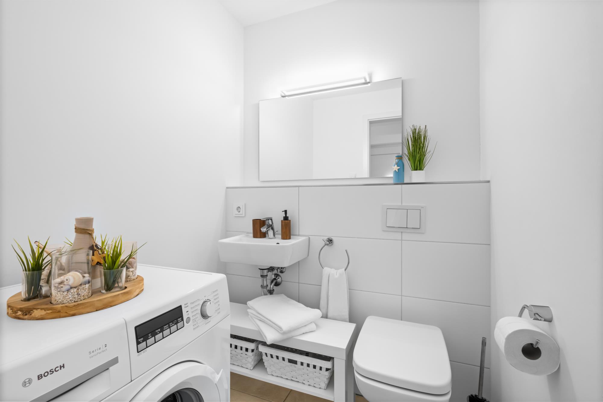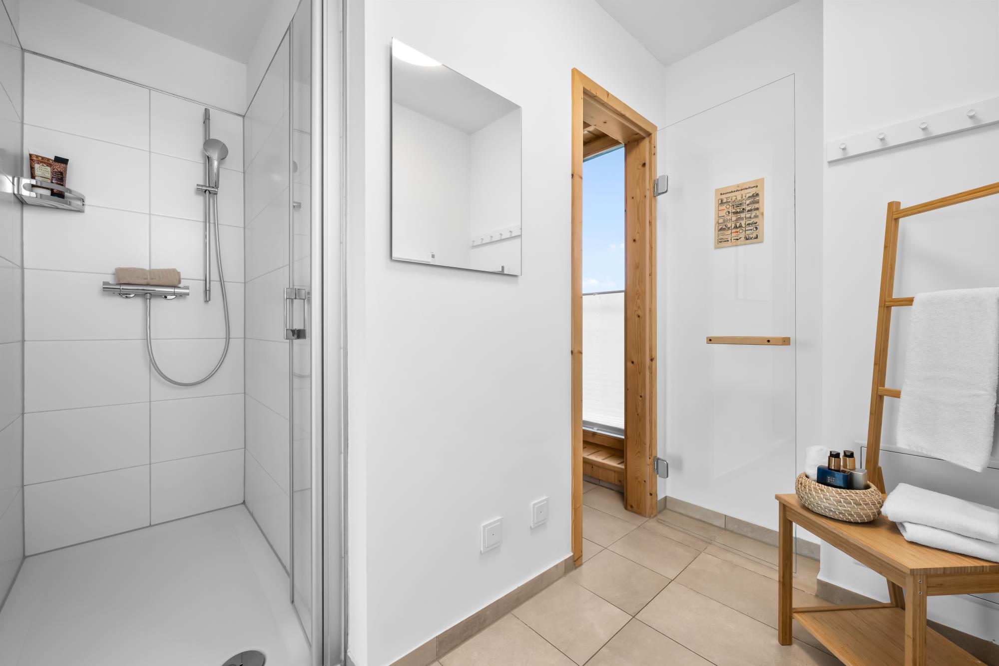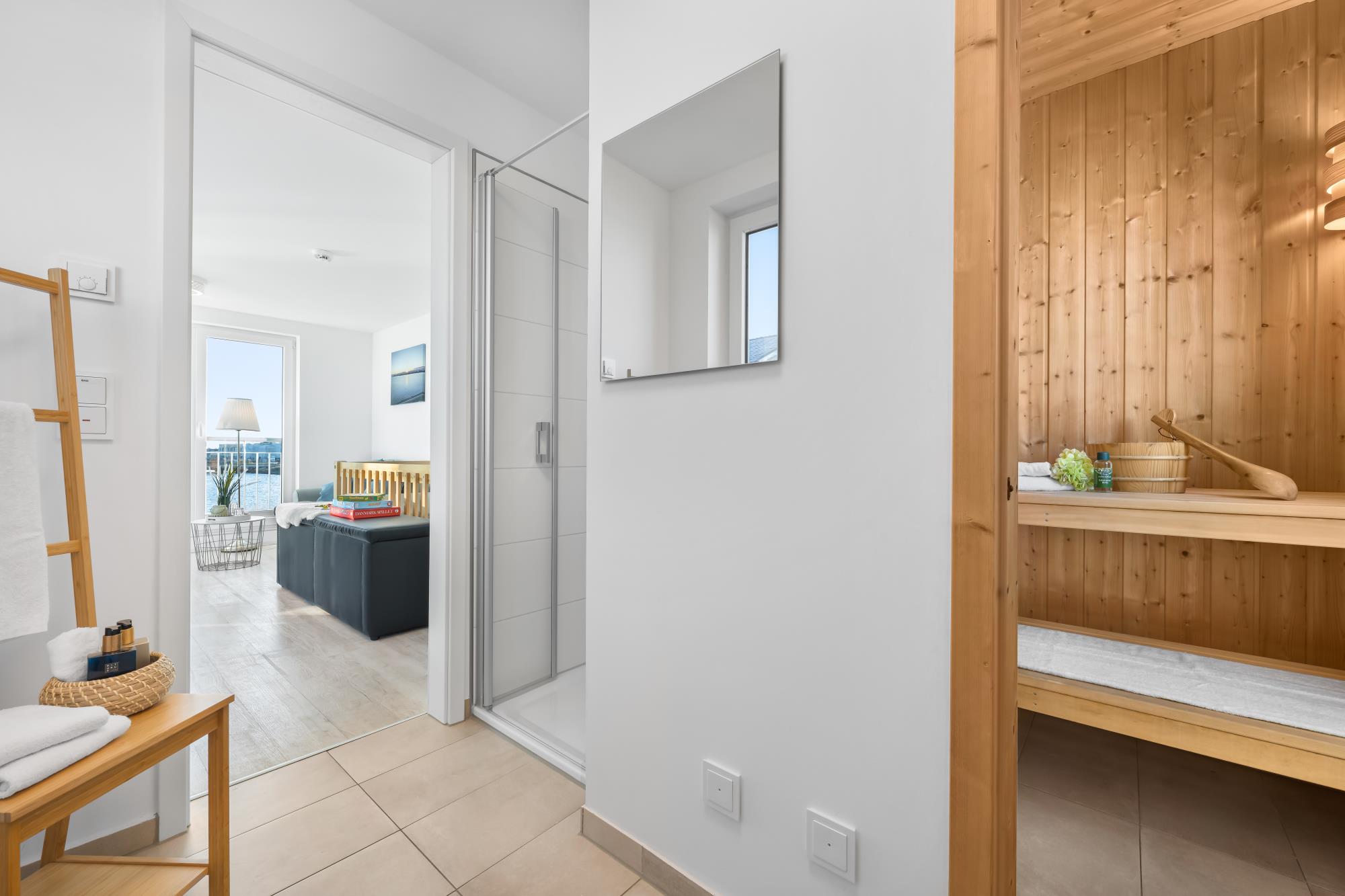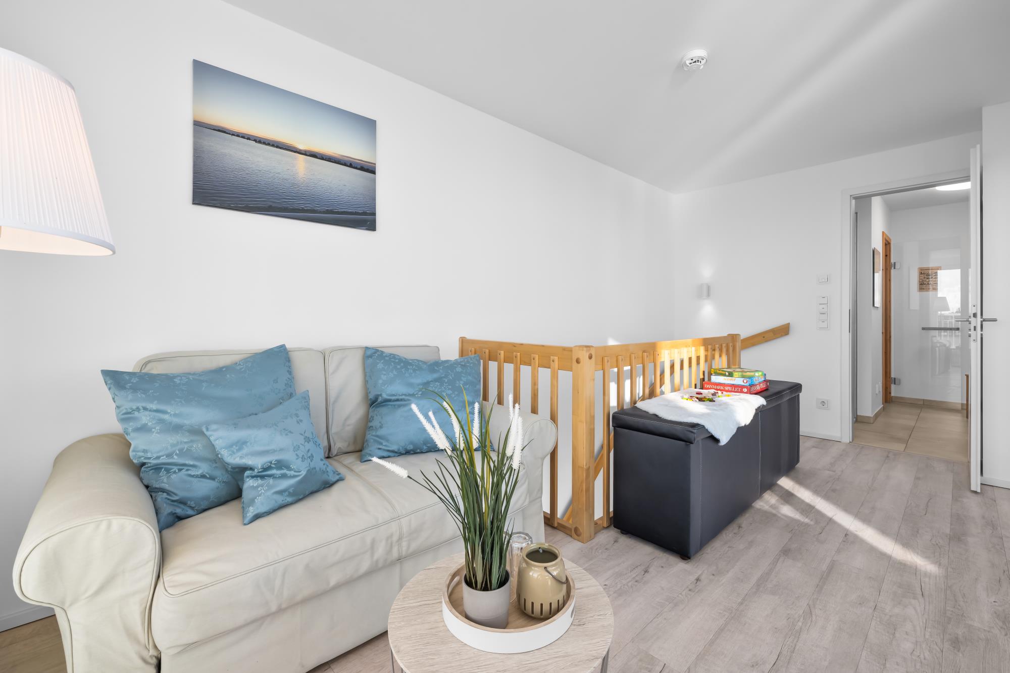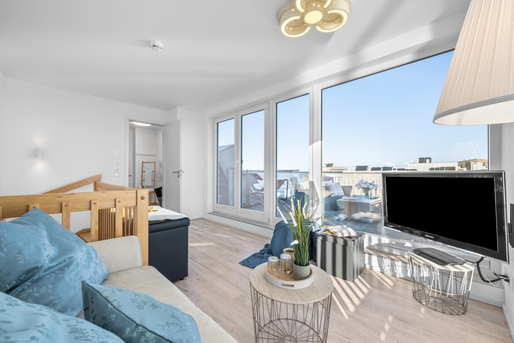 Das zweite Obergeschoss stellt das Highlight dieses großzügigen Hauses dar. Denn das Studio mit angrenzender Dachterrasse mit Strandkorb und Lounge Garnitur, sowie ein Wellnessbereich mit finnischer Sauna und Dusche, sorgen für unvergessliche Momente. Zudem bietet eine Schlafcouch im Studio (120 x 200 cm) einen komfortablen Schlafplatz bei traumhaften Aussichten an. Ebenfalls ist hier ein TV mit dem HomeEntertainment Programm vorhanden.