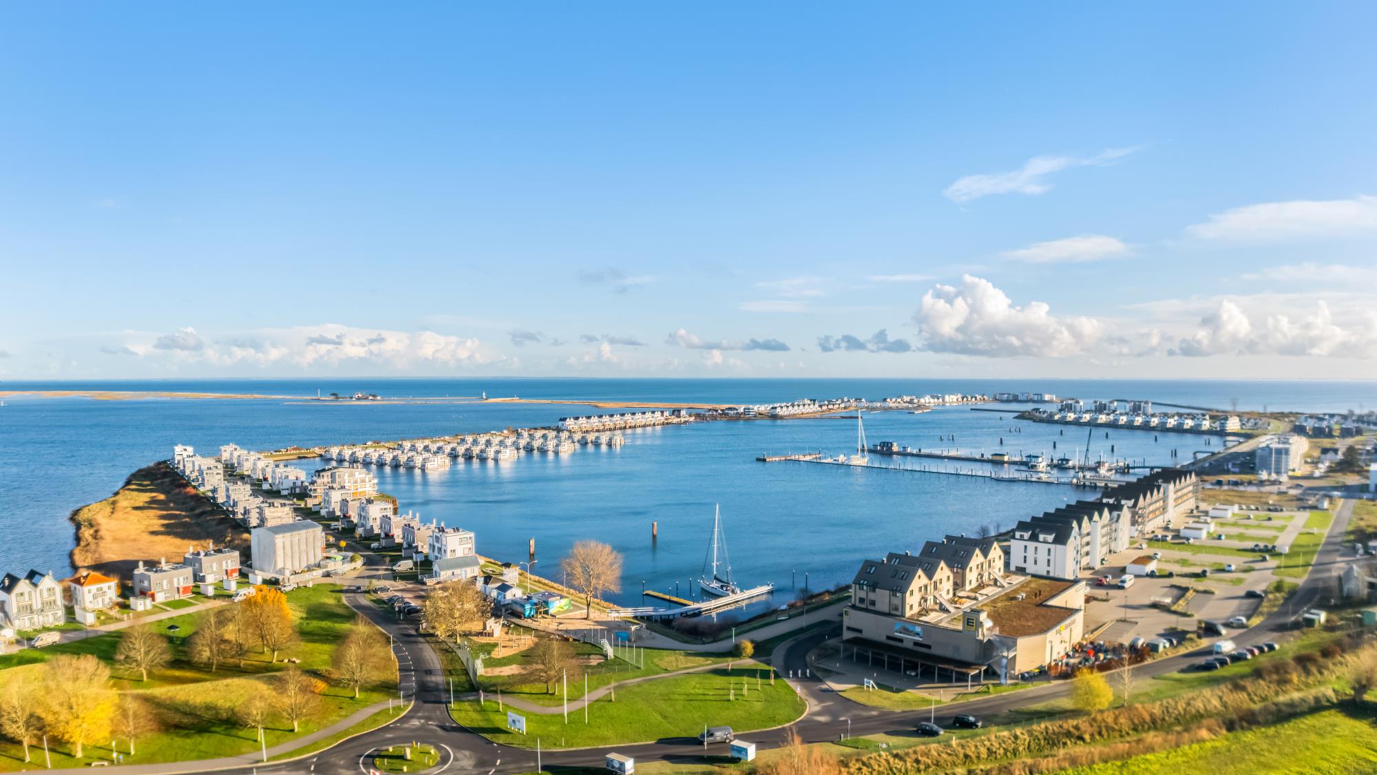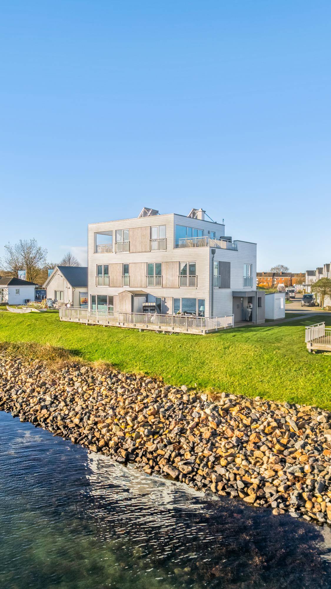 Es befindet sich in erster Reihe zum Wasser mit Panoramablick auf den Segel- und Sportboothafen des OstseeResort Olpenitz und die Schlei.