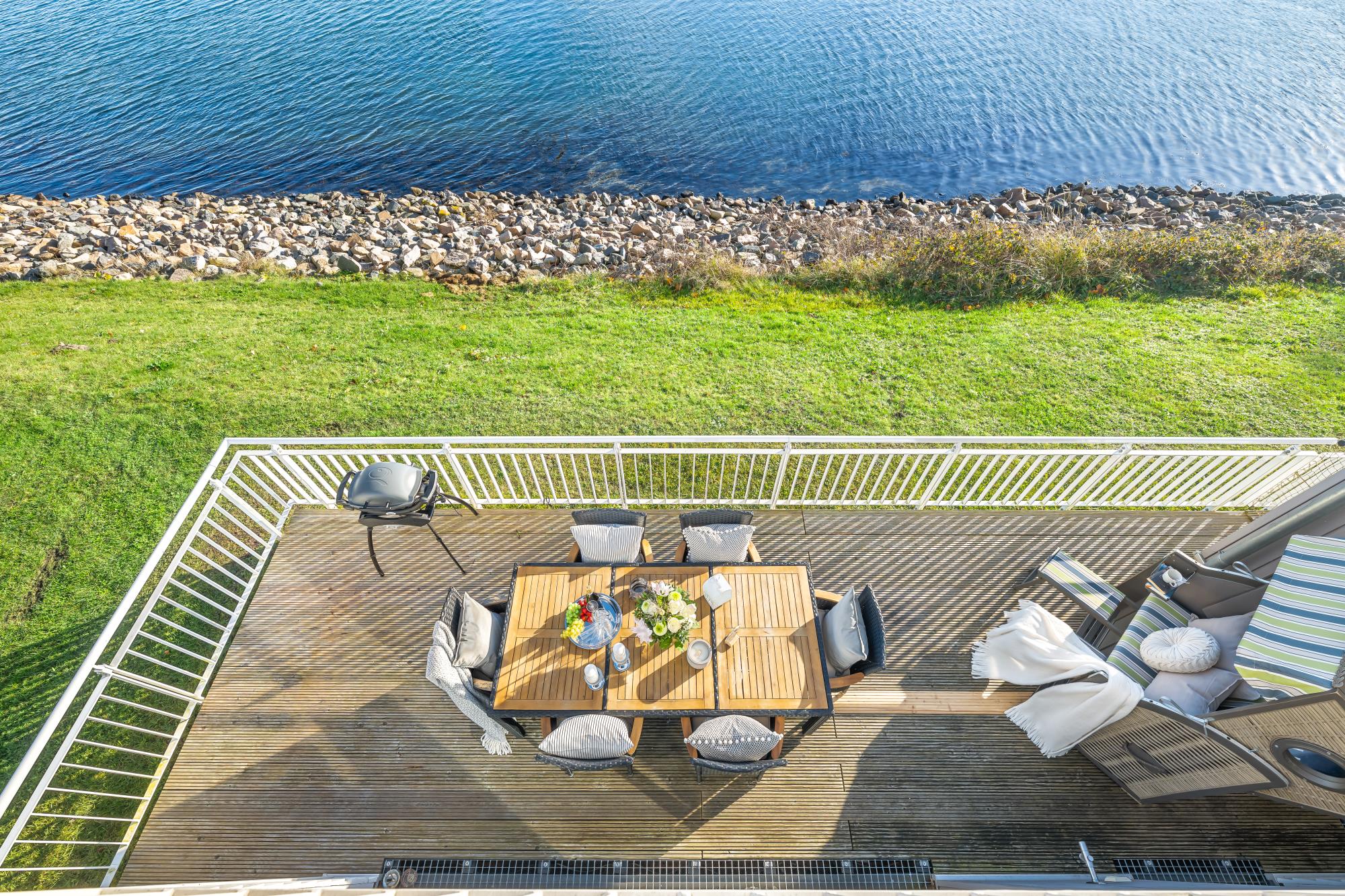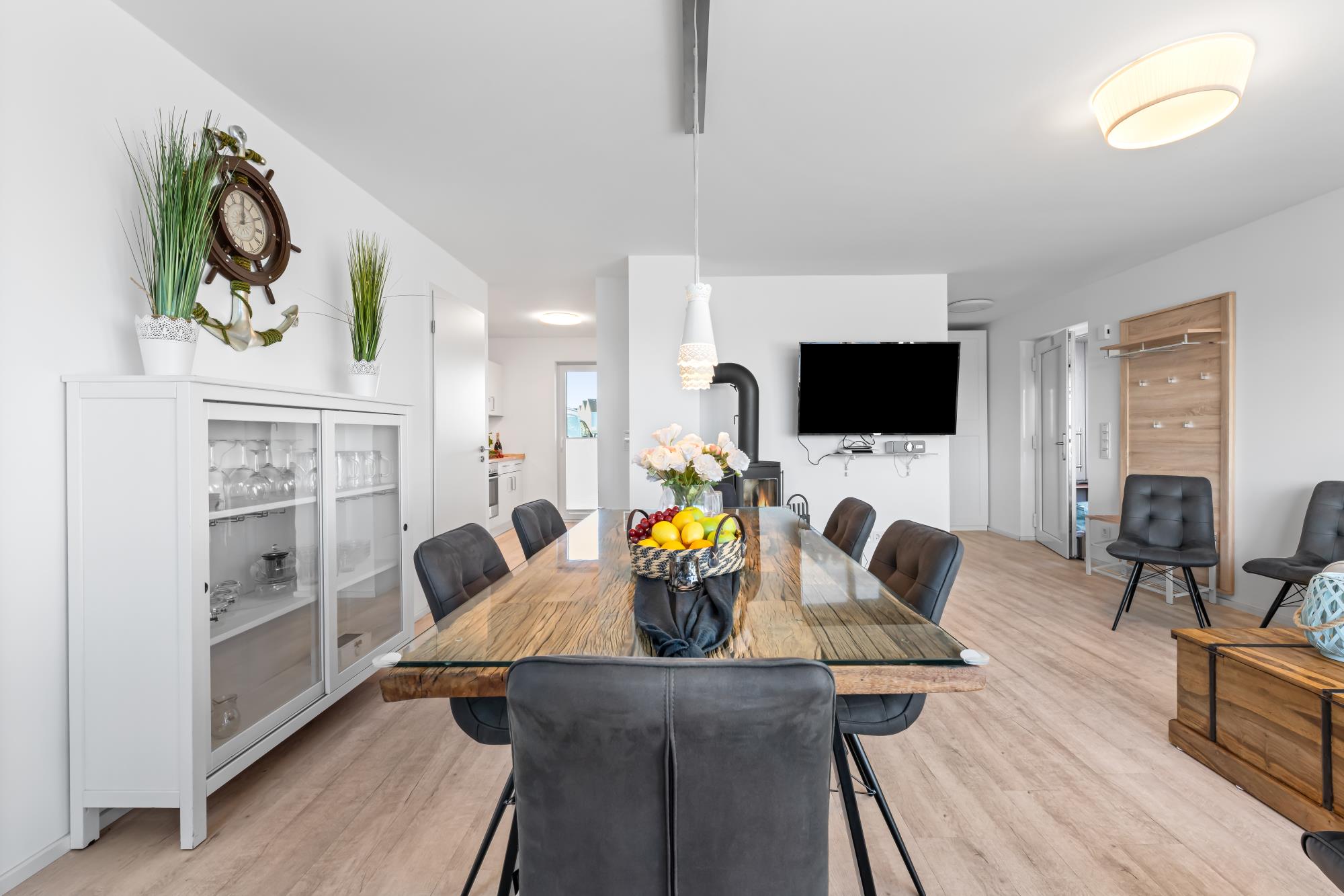 Im Erdgeschoss befindet sich der lichtdurchflutete Wohn- und Essbereich mit Kaminofen, der über eine Eckcouch und einen Relaxsessel verfügt. Die gemütliche Couch bietet zwei Schlafplätze (140 x 200 cm) an. Zum Verweilen lädt die direkt angrenzende große und windgeschützte Terrasse ein, die das Gefühl vermittelt, man würde auf dem Wasser schweben. Zudem bietet das zeitgemäße HomeEntertainment Programm eine Beschäftigung an nordischen Schietwettertagen. Ebenfalls ist im Erdgeschoss ein Gäste-WC vorhanden.